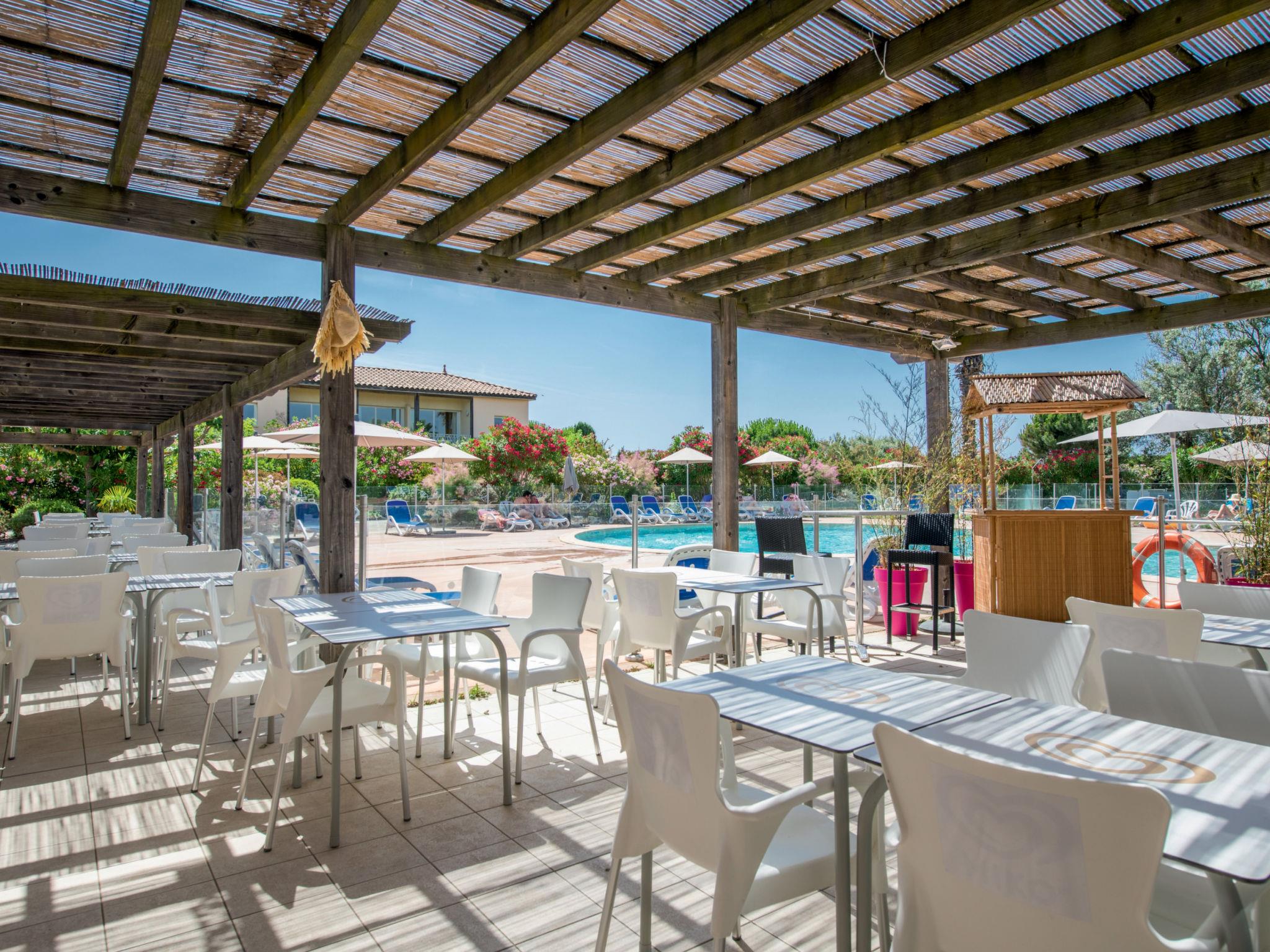 Holiday village "Sowell Résidence Les Sablons". 57 apartments in the residence. 3.5 km from the centre of Grau du Roi, 4 km from the centre of La Grande Motte, 9 km from the centre of Aigues Mortes, in the heart of the city, 50 m from the sea, 50 m from the beach, direct access to the beach. For shared use: well-kept garden 3 ha, swimming pool heated (100 m2, seasonal availability: 01.Jun. - 31.Sep.) with internal staircase. Children's pool, tennis (2 x hard court), table tennis, boccia, children's playground. In the complex: reception, bar, WiFi, solarium, washing machine, tumble dryer (extra). Breakfast and half board possible (extra). Parking. Grocery 2 km, bakery 2 km, bicycle rental 800 m, bus stop 150 m, railway station "Gare du Grau-du-Roi" 5 km, thermal baths "La Grande Motte" 2.5 km. Sports harbour 4 km, golf course (18 hole) 4 km, sailing school 800 m, riding stable 10 km. Nearby attractions: Parc Aquatique 2 km, Montpellier 28 km, Arles / Nîmes 50 km, Les Saintes Maries de la Mer 70 km, Uzès 80 km, Béziers 90 km. Please note: the photograph shows a typical example. The holiday properties may differ in living space, floorplan, equipment and furnishing.