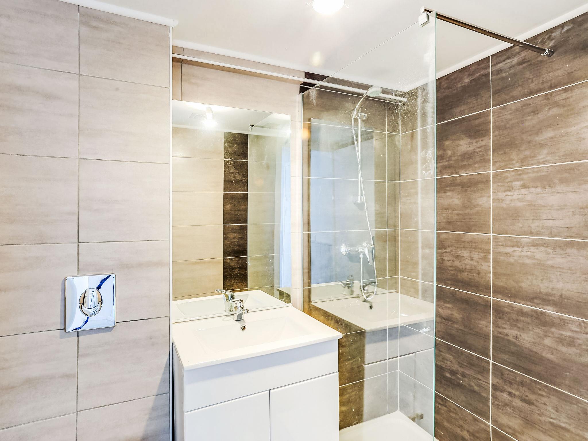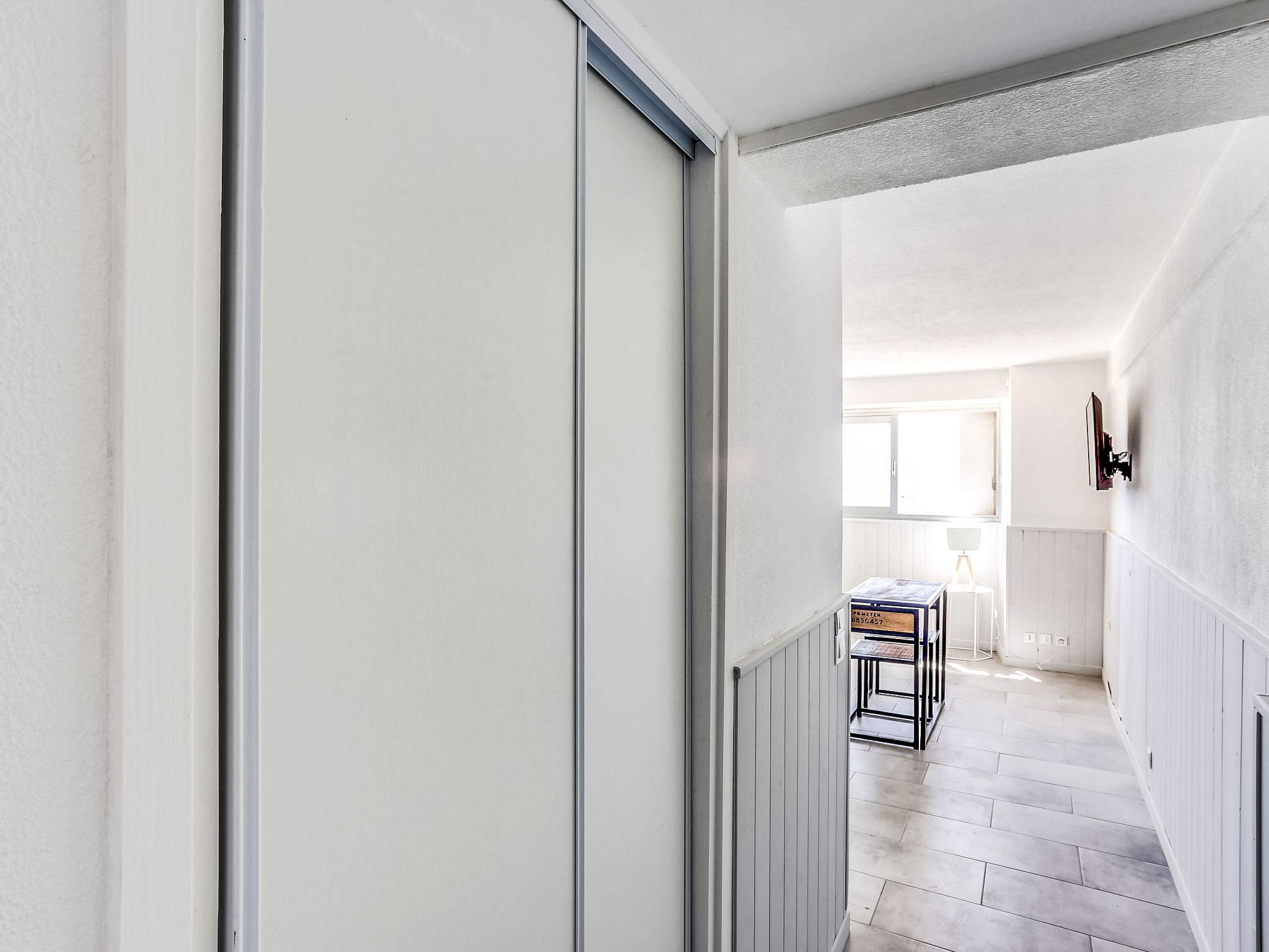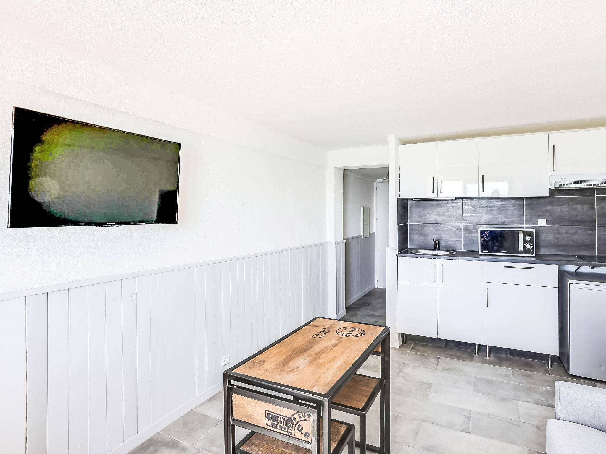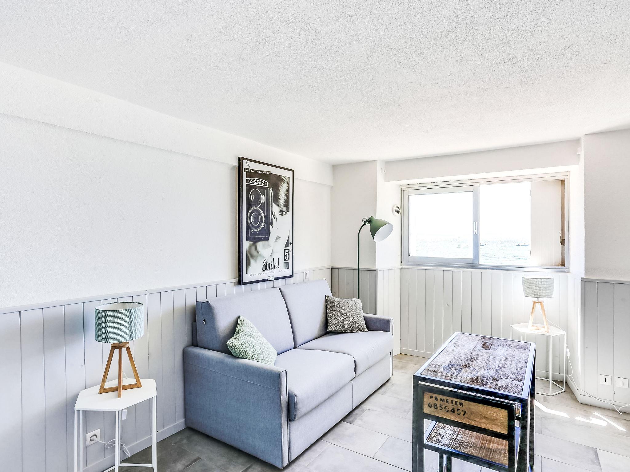 1-room studio 20 m2, on the ground floor. Simple and beautiful furnishings: living/dining room with 1 double sofabed (140 cm, length 190 cm), dining table and TV (flat screen). Kitchenette (2 ceramic glass hob hotplates, toaster, kettle, electric coffee machine, combination microwave). Shower/WC. No heating option. View of the sea. Facilities: Internet (WiFi, extra). Please note: no parking. Maximum 1 pet/ dog allowed. TV only FR. Smoke alarm. 8307000091231