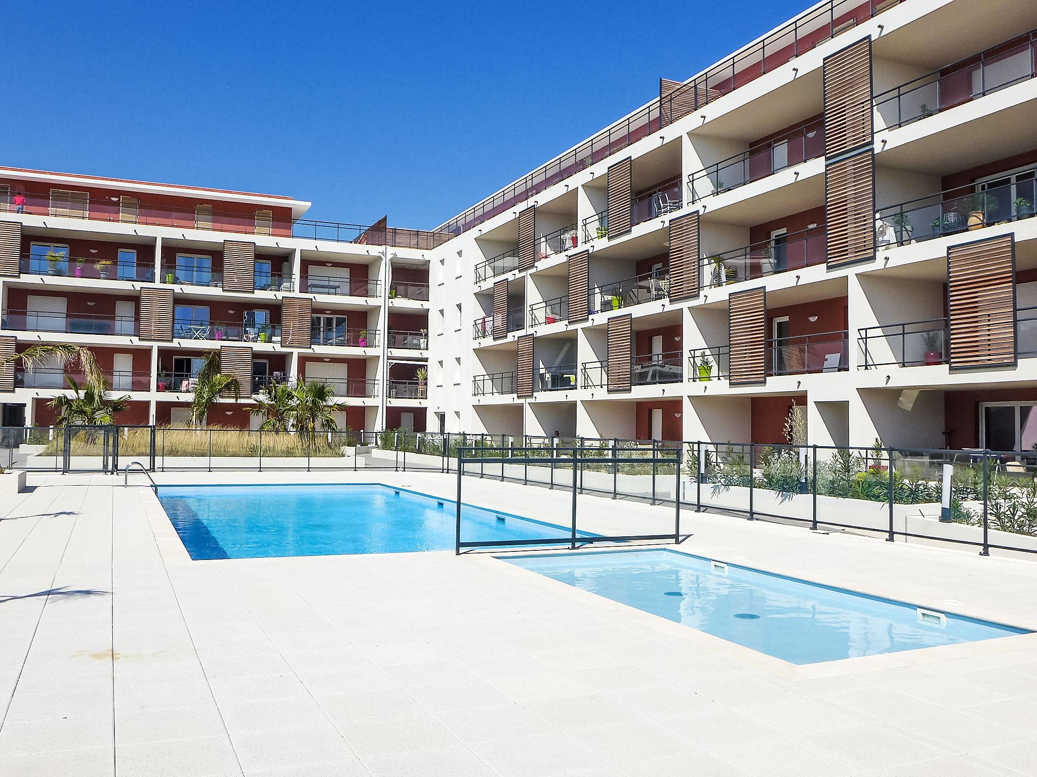 2-room apartment 44 m2 on 4th floor, west facing position. Comfortable furnishings: living/dining room with 1 sofabed (140 cm, length 190 cm), 1 x 2 bunk beds (70 cm, length 190 cm), TV (flat screen), air conditioning. 1 room with 1 double bed (2 x 80 cm, length 200 cm), fan. Open kitchen (oven, dishwasher, 4 ceramic glass hob hotplates, toaster, kettle, microwave, freezer, electric coffee machine, Capsules for coffee machine (Senseo) extra). Exit to the terrace. Shower/WC. Electric heating. Terrace 14 m2, south facing position. Terrace furniture. View of the swimming pool. Facilities: washing machine, iron, hair dryer. Internet (WiFi, free). Parking space n 136. Please note: suitable for families. Non-smokers only. TV only FR. Smoke alarm. Offer by a private individual according to Art. 155, IV of CGI. 83070000299AK
