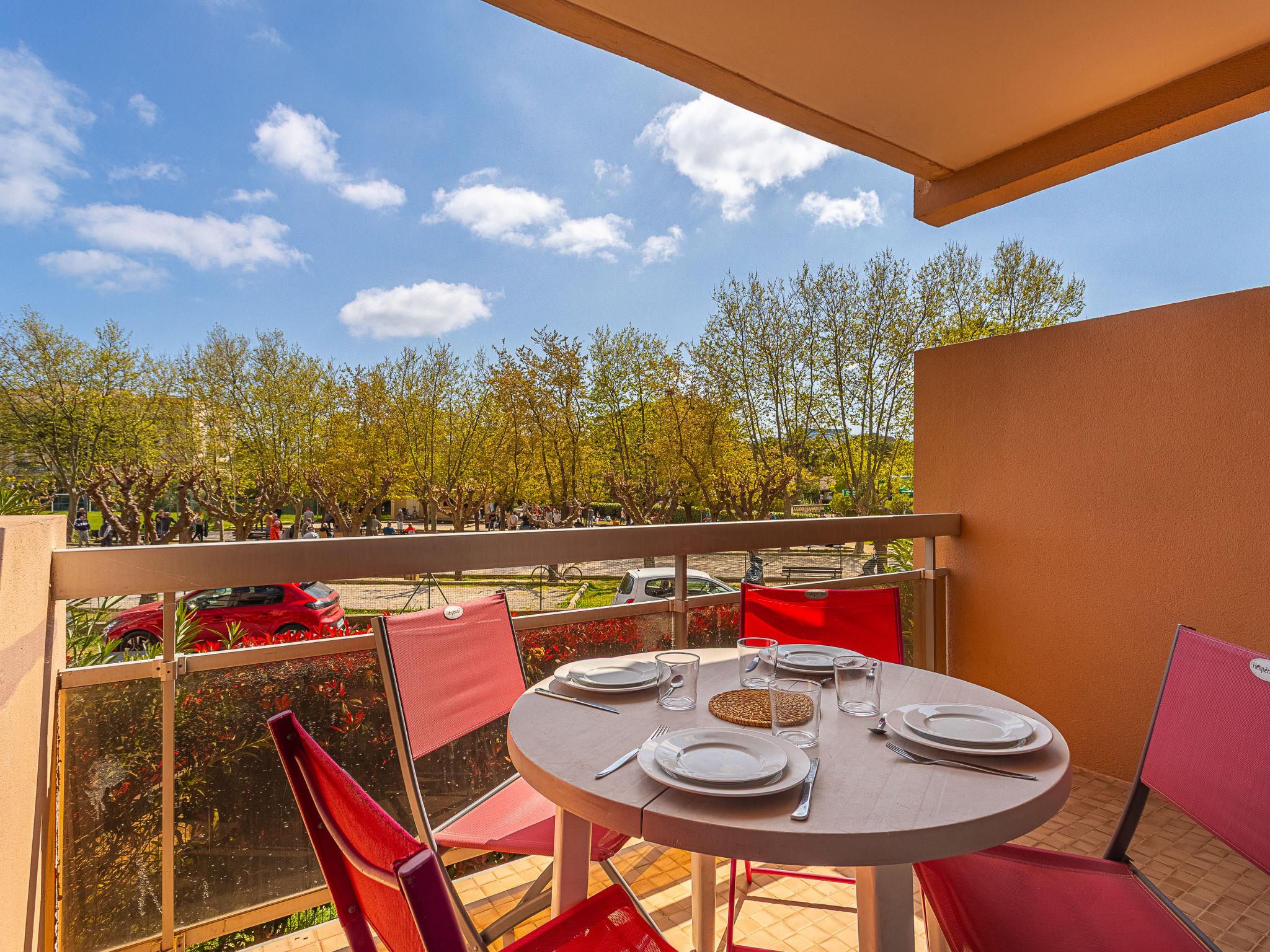 1-room studio 21 m2, on the ground floor, south facing position. Comfortable furnishings: living/dining room with 1 double fold-away bed (140 cm, length 190 cm), TV (flat screen). Exit to the terrace. Sleeping alcove with 1 x 2 bunk beds (80 cm, length 190 cm). Kitchenette (2 ceramic glass hob hotplates, toaster, kettle, electric coffee machine, Capsules for coffee machine (Nespresso) extra, combination microwave). Shower, sep. WC. Electric heating, air-conditioning. Small terrace 6 m2, south facing position. Terrace furniture. View of the countryside. Facilities: washing machine, iron, hair dryer. Internet (WiFi, extra). Please note: non-smokers only. Maximum 1 pet/ dog allowed. TV only FR. Smoke alarm. Offer by a private individual according to Art. 155, IV of CGI. 83070003116MA