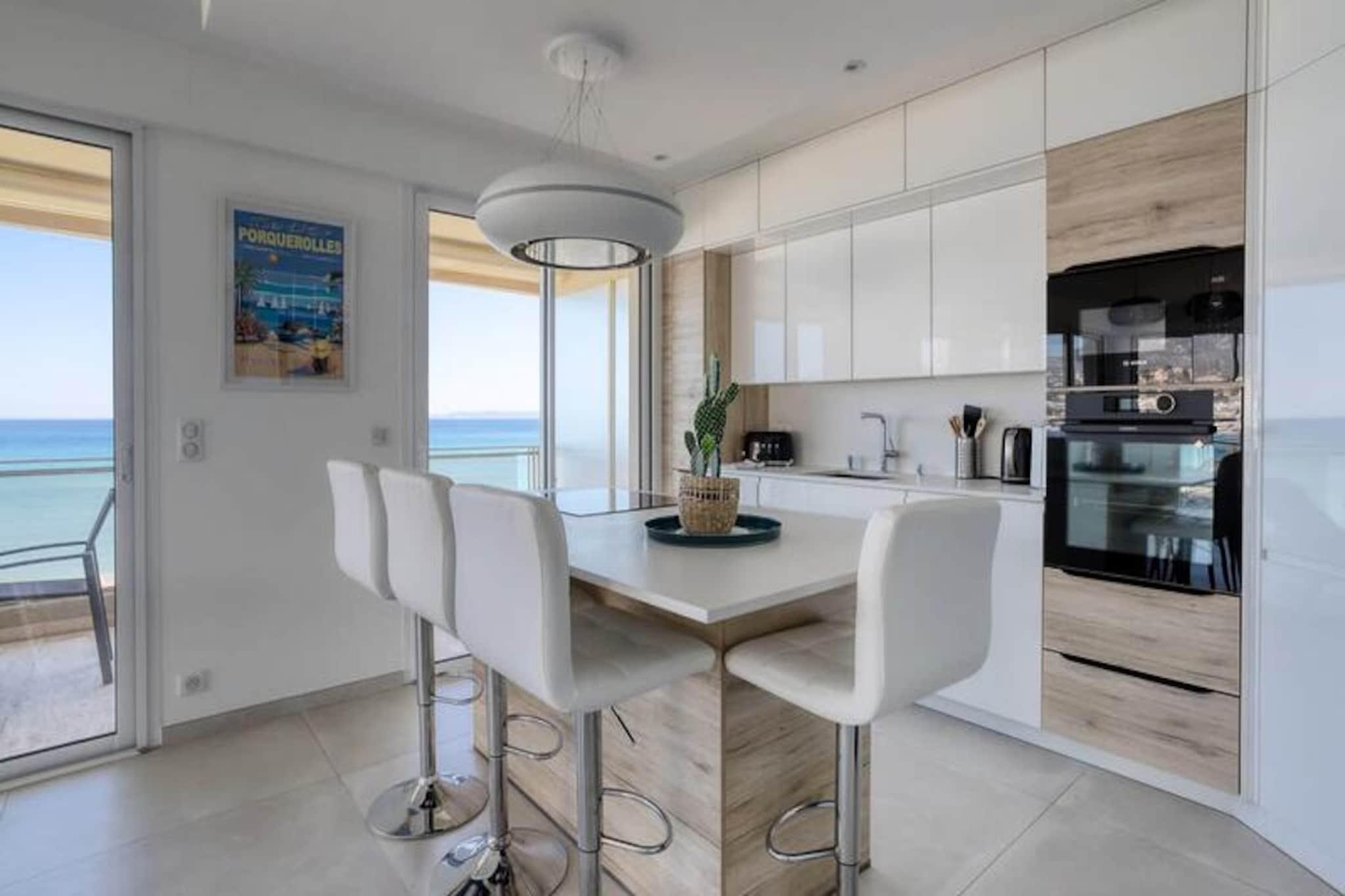 Forestil dig at vågne op til lyden af blide bølger og træde ud på din store terrasse for at nyde den betagende havudsigt. Denne fantastiske 90 m² store lejlighed, der ligger lige bag det gyldne sand på Anglade-stranden i Le Lavandou, tilbyder den perfekte ferie ved havet. Med direkte adgang til stranden og et moderne, stilfuldt design er denne ejendom et paradis for dem, der søger både afslapning og eventyr på den franske riviera. Indvendigt er hver eneste detalje nøje udvalgt for at sikre din komfort. Lejligheden har to rummelige badeværelser, aircondition og et fuldt udstyret køkken, der sikrer et stressfrit ophold. De lyse og luftige opholdsrum er indrettet i moderne stil, mens den store terrasse er det ideelle sted at spise udendørs eller bare nyde Middelhavssolen. Med Wi-Fi, vaskemaskine og to reserverede parkeringspladser i en sikker bolig er alle dine behov dækket for en problemfri ferieoplevelse. Træd udenfor, og du befinder dig kun få minutter fra det livlige centrum af Le Lavandou med sine charmerende butikker, restauranter og lokale markeder. Boligkomplekset Thalassa er perfekt beliggende mellem byens centrum og det livlige kvarter La Favière og tilbyder en balance mellem ro og tilgængelighed. Uanset om du slentrer langs stranden, udforsker de nærliggende kyststier eller nyder det provencalske køkken, sikrer beliggenheden uendelige muligheder for opdagelser. Dit ophold administreres af det dedikerede team hos Conciergerie Suzette, så du er garanteret en enestående oplevelse. Fra personlig velkomst til support døgnet rundt – alle aspekter af din ferie håndteres med omhu og professionalisme. Dette er mere end bare en feriebolig – det er din adgangsbillet til uforglemmelige øjeblikke ved havet.