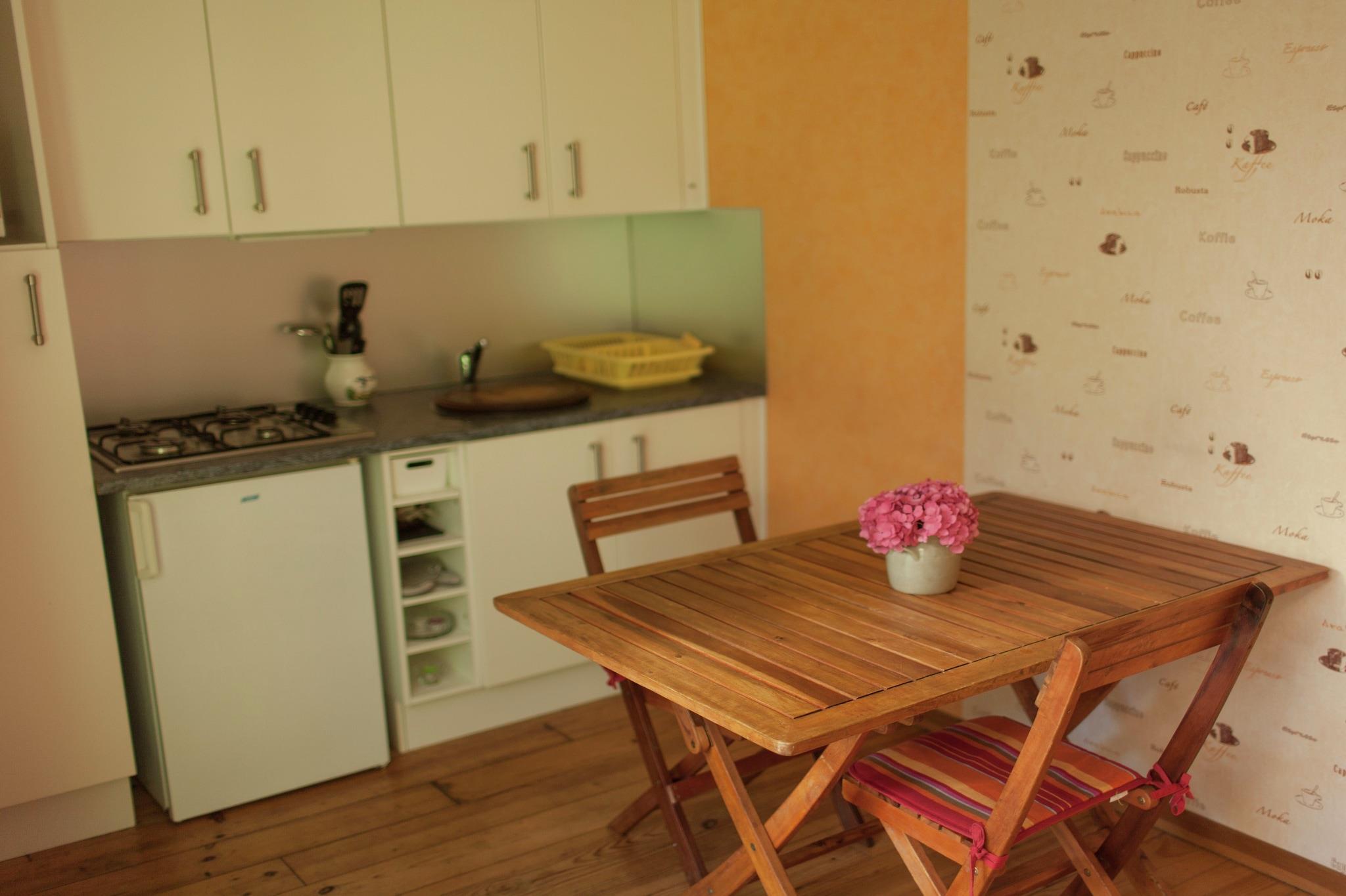 Stueetage: (Køkken(spisebord, elkedel, brødrister, komfur, kaffemaskine, mikrobølgeovn, køle-fryseskab), soveværelse(dobbeltseng, Fjernsyn), badeværelse(bruser, håndvask, toilet)) terrasse(privat), have(privat), havemøbler, parkering, dam, cykler til rådighed