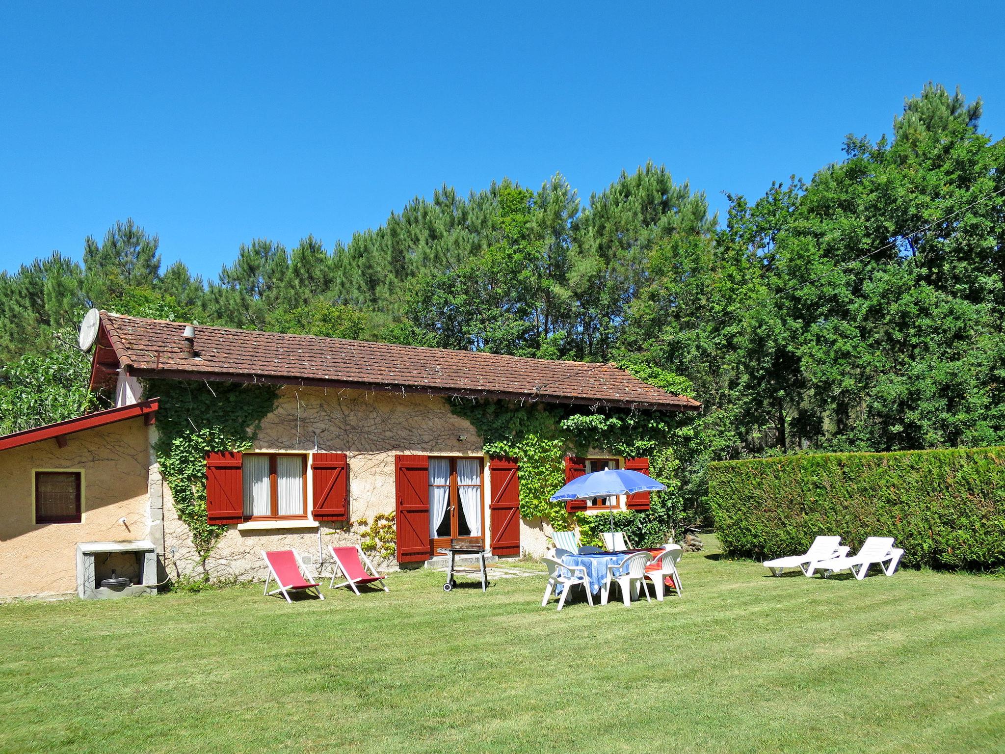 House "Vignas", surrounded by trees. 1.5 km from the centre of Le Porge, 20 km from the centre of Lacanau-Océan, 46 km from the centre of Bordeaux, in the residential district, 9 km from the sea, 14 km from the lake, in a cul-de-sac. Private: natural state property 8'000 m2, garden 2'500 m2 (fenced) trees, parking at the house on the premises. Shop 1.5 km, bus stop "Le ferron" 20 m, sandy beach "Le Porge-Océan" 9 km.