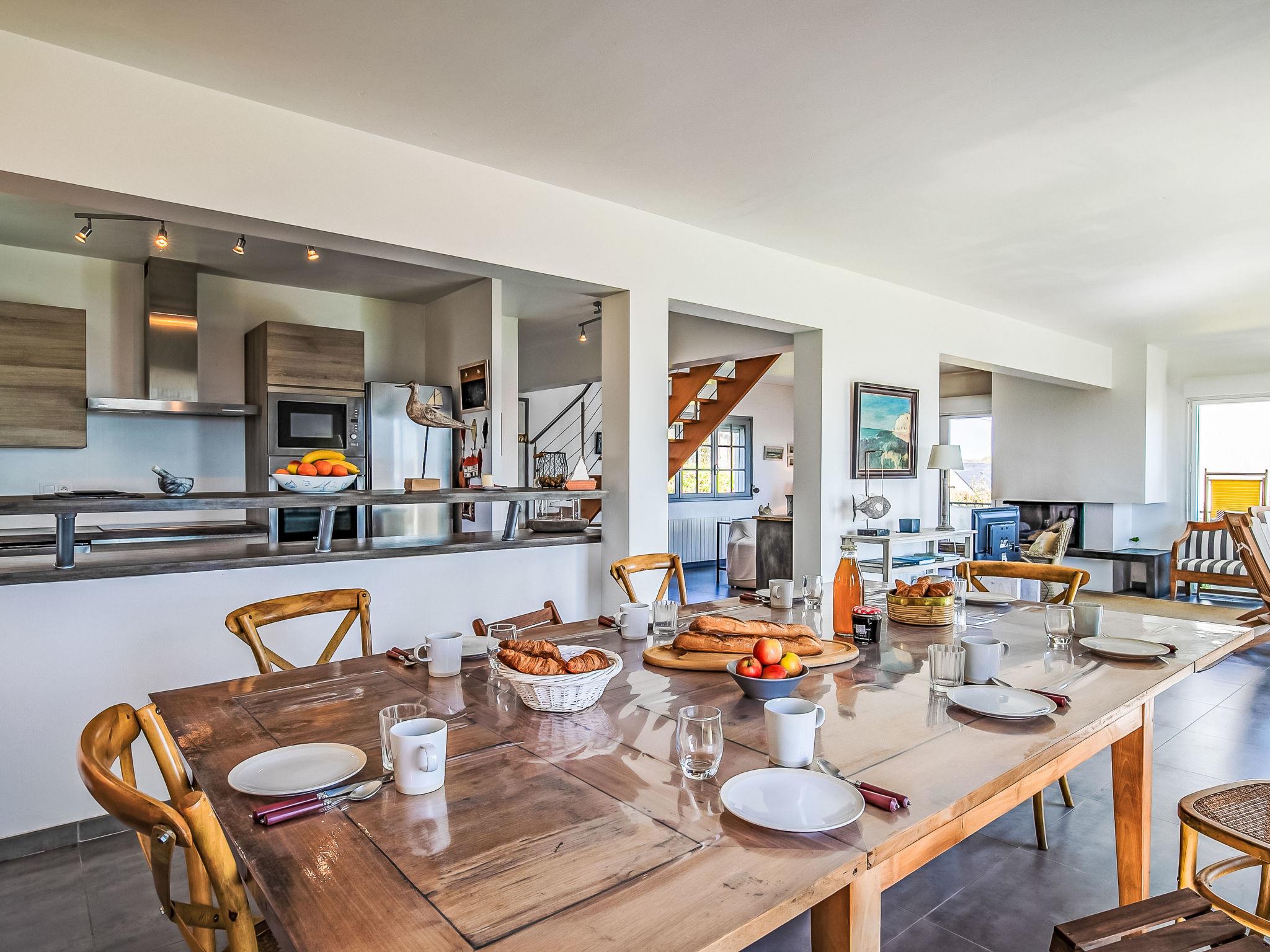 "Ruilh Avel", 5-room house 140 m2 on 2 levels. Spacious and bright, beautiful and cosy furnishings: open large living/dining room 50 m2 with open-hearth fireplace (only for decoration), flat screen. Exit to the garden, to the terrace, south facing position. Large, open kitchen (oven, dishwasher, 5 induction hot plates, toaster, kettle, microwave, freezer, electric coffee machine). Shower, sep. WC. Upper floor: 3 rooms, each room with 1 french bed (140 cm, length 190 cm). 1 children's room with 2 beds (90 cm, length 190 cm). Bathroom, sep. WC. Electric heating. Small terrace 20 m2, south facing position. Terrace furniture, barbecue (portable), deck chairs (2). Very beautiful panoramic view of the sea. Facilities: washing machine, iron, baby cot for up to 2 year olds, hair dryer. Internet (WiFi, free). Please note: non-smoking house. Smoke alarm. Offer by a private individual according to Art. 155, IV of CGI.
