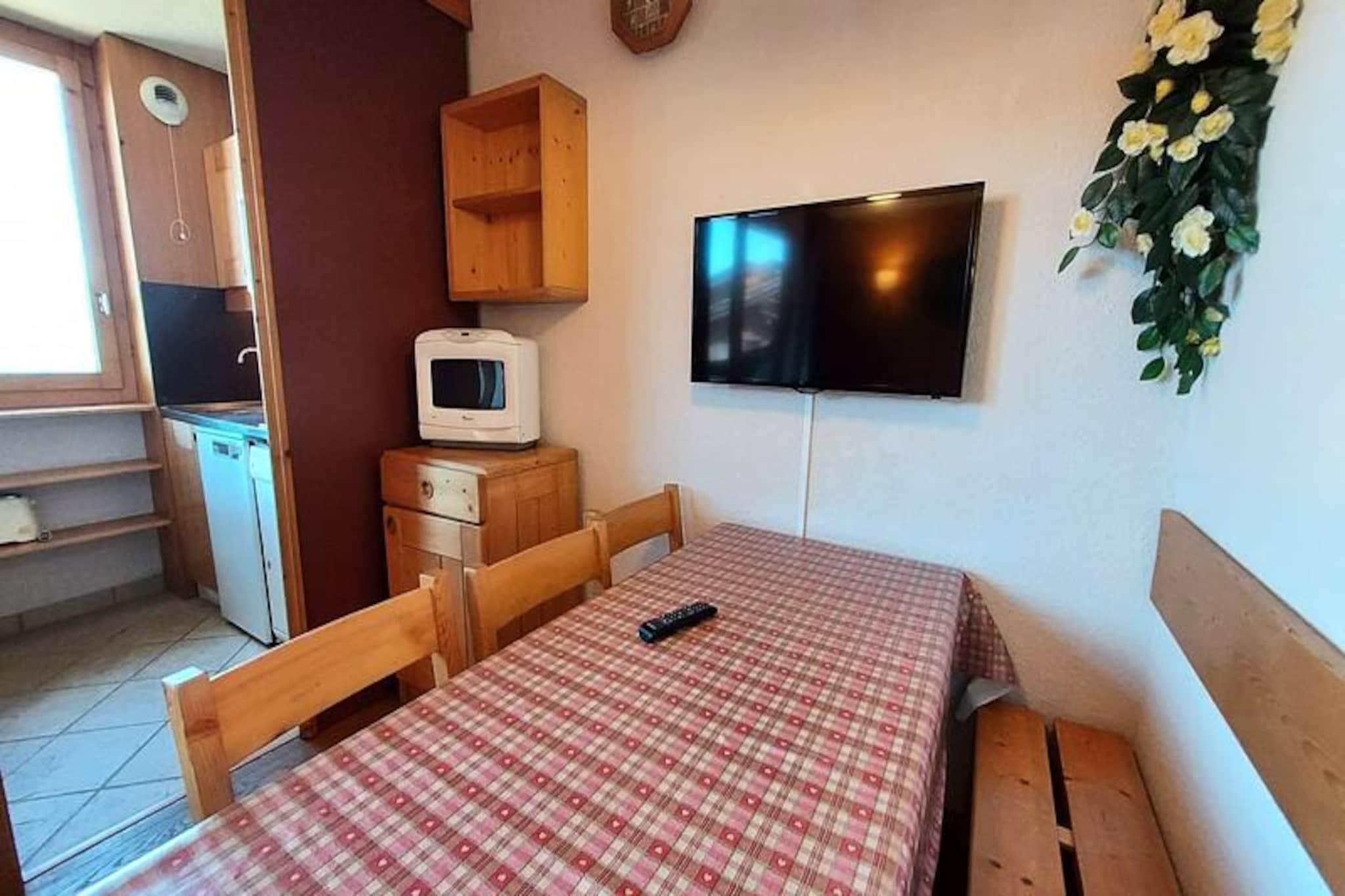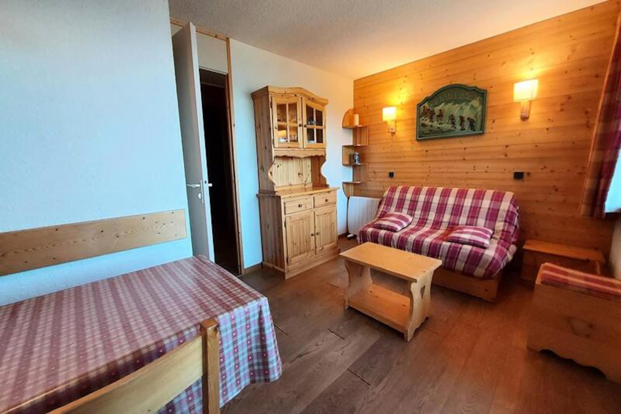 Denne charmerende toværelses lejlighed, der ligger højt oppe i det naturskønne Le Mottet-distrikt i Valmorel, tilbyder et hyggeligt tilflugtssted for både skientusiaster og familier. Med direkte adgang til pisterne og ESF-skiskolen kun få skridt væk, er hvert øjeblik af din alpine ferie fyldt med bekvemmelighed og eventyr. Den gågadebegrænsede landsby sikrer en fredelig atmosfære, mens panoramaudsigten fra den nordvendte balkon giver dig mulighed for at nyde dalens skønhed nedenfor. Uanset om du er her for at grave dig gennem frisk puddersne eller blot slappe af i de fredfyldte bjergomgivelser, er denne lejlighed din port til uforglemmelige minder. \n\nIndvendigt er lejligheden omhyggeligt designet til at rumme op til fem gæster. Soveværelset har en køjeseng og en enkeltseng, mens stuen tilbyder en komfortabel sovesofa til to. Et separat køkken tilbyder alt det nødvendige til at tilberede solide måltider efter en dag på pisterne. Lejligheden er ikke-ryger og byder kæledyr velkommen mod et lille tillæg, hvilket sikrer, at alle i din familie føler sig hjemme. Selvom Wi-Fi ikke er inkluderet, gør den varme atmosfære og den praktiske indretning den til en ideel base for afslapning og kontakt med dine kære. \n\nDen \