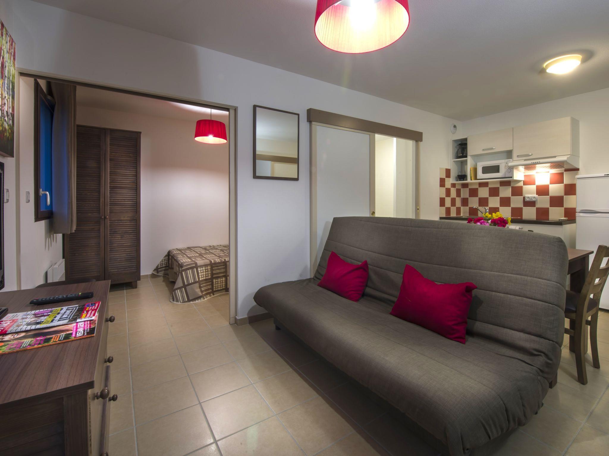 "Les Clos du Rocher", 3-room apartment 35 m2. Bright, simple furnishings: living/sleeping room with 1 double sofabed, dining table and satellite TV. Exit to the balcony, to the terrace. 1 room with 1 french bed. 1 small room with 1 x 2 bunk beds (80 cm). Small, open kitchen (4 ceramic glass hob hotplates, kettle, microwave, freezer, electric coffee machine). Bath/WC. Electric heating. Balcony or terrace. Terrace furniture, balcony furniture. Facilities: children's high chair, baby cot. Internet (WiFi, extra). Please note: maximum 1 pet/ dog allowed. Smoke alarm, fire extinguisher.