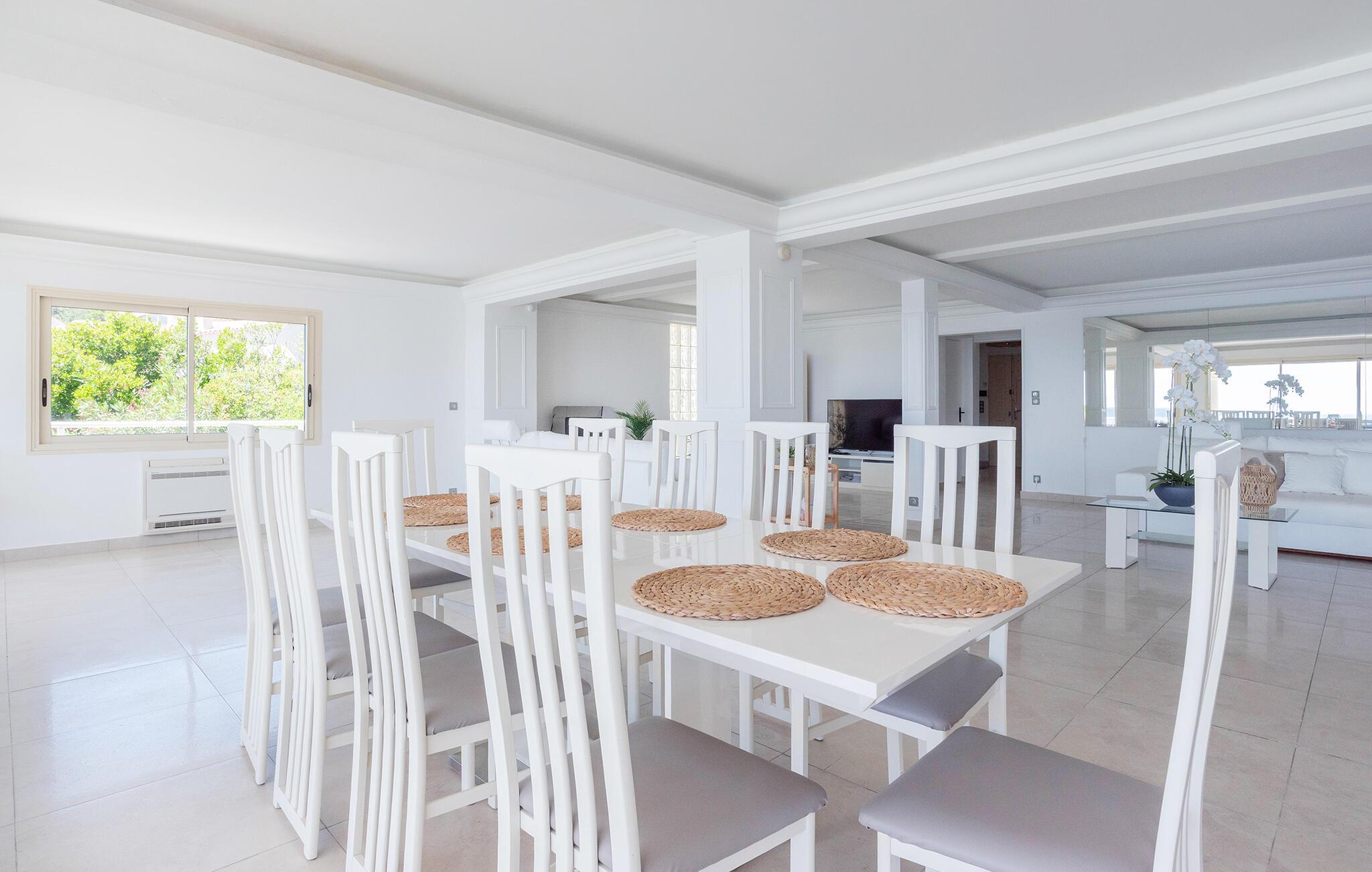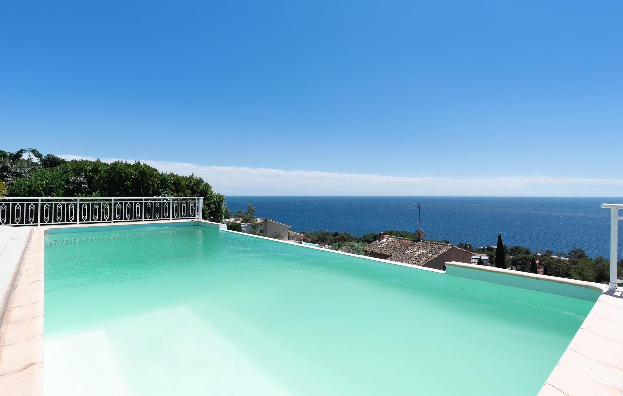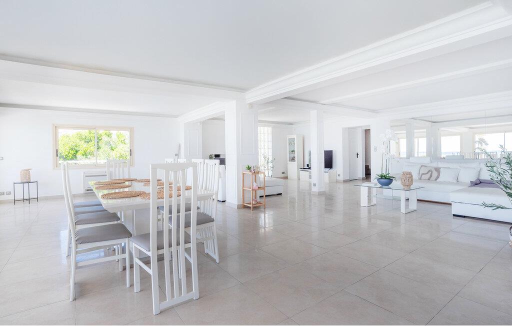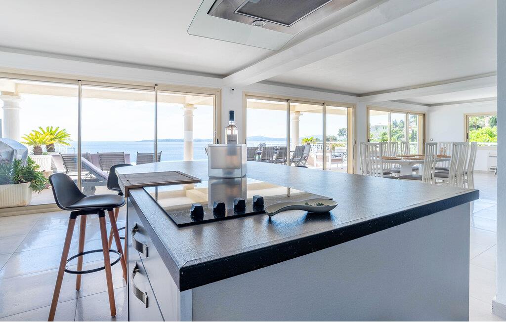 Denne eksklusive villa venter jer i Les Issambres' højder med en fantastisk havudsigt. Nyd fred, komfort og middelhavs-elegance i dette stilfulde hus. Bliv budt velkommen af ??den lyse opholdsstue, som er kendetegnet ved sin rummelighed og rene linjer. Slap af i det elegante sofalandskab og nyd jeres fritid sammen. Tilbered kulinariske lækkerier i det moderne køkken med kogeø. Store vinduesfronter forbinder inde- og udeområder på en harmonisk måde.