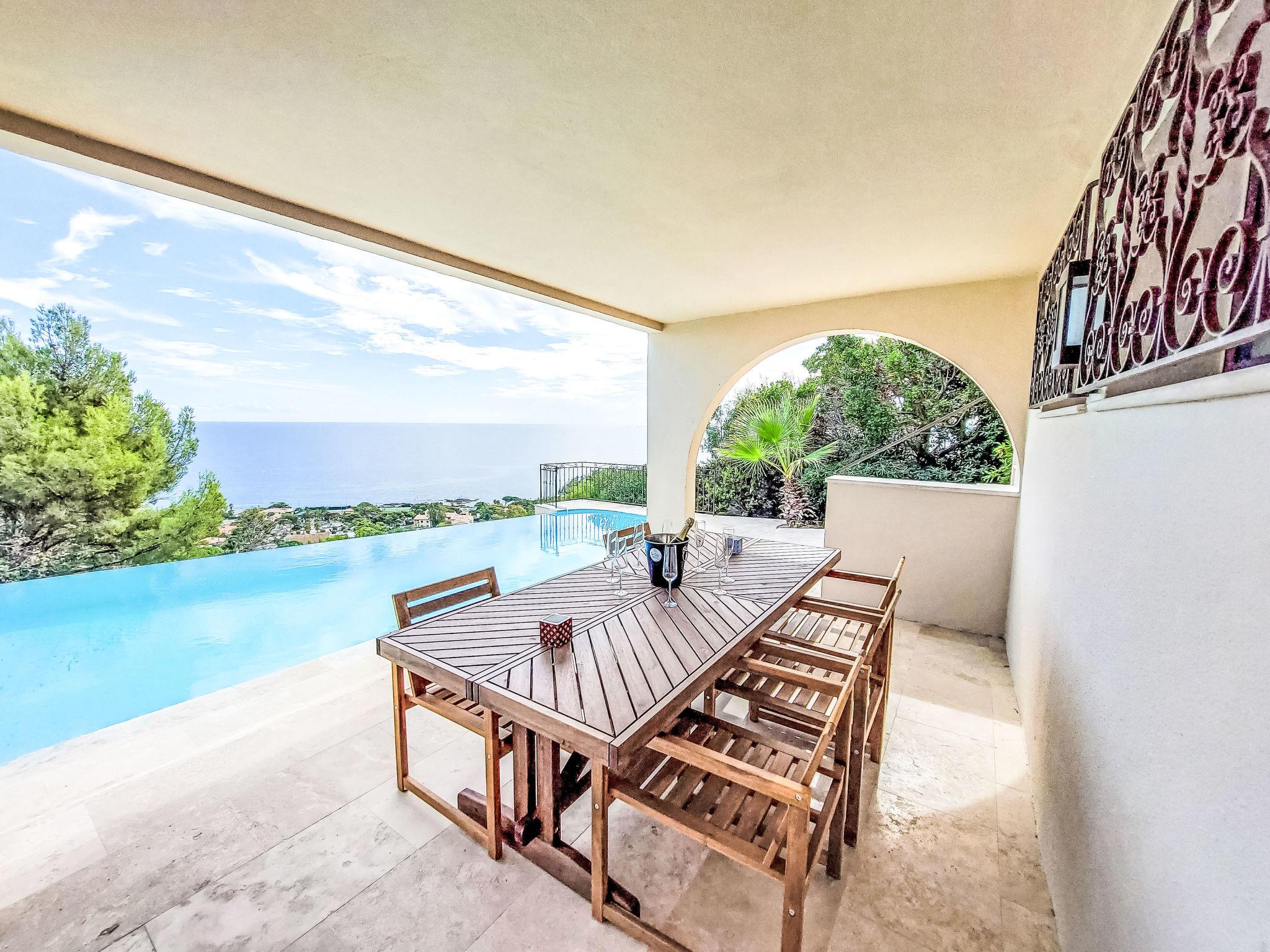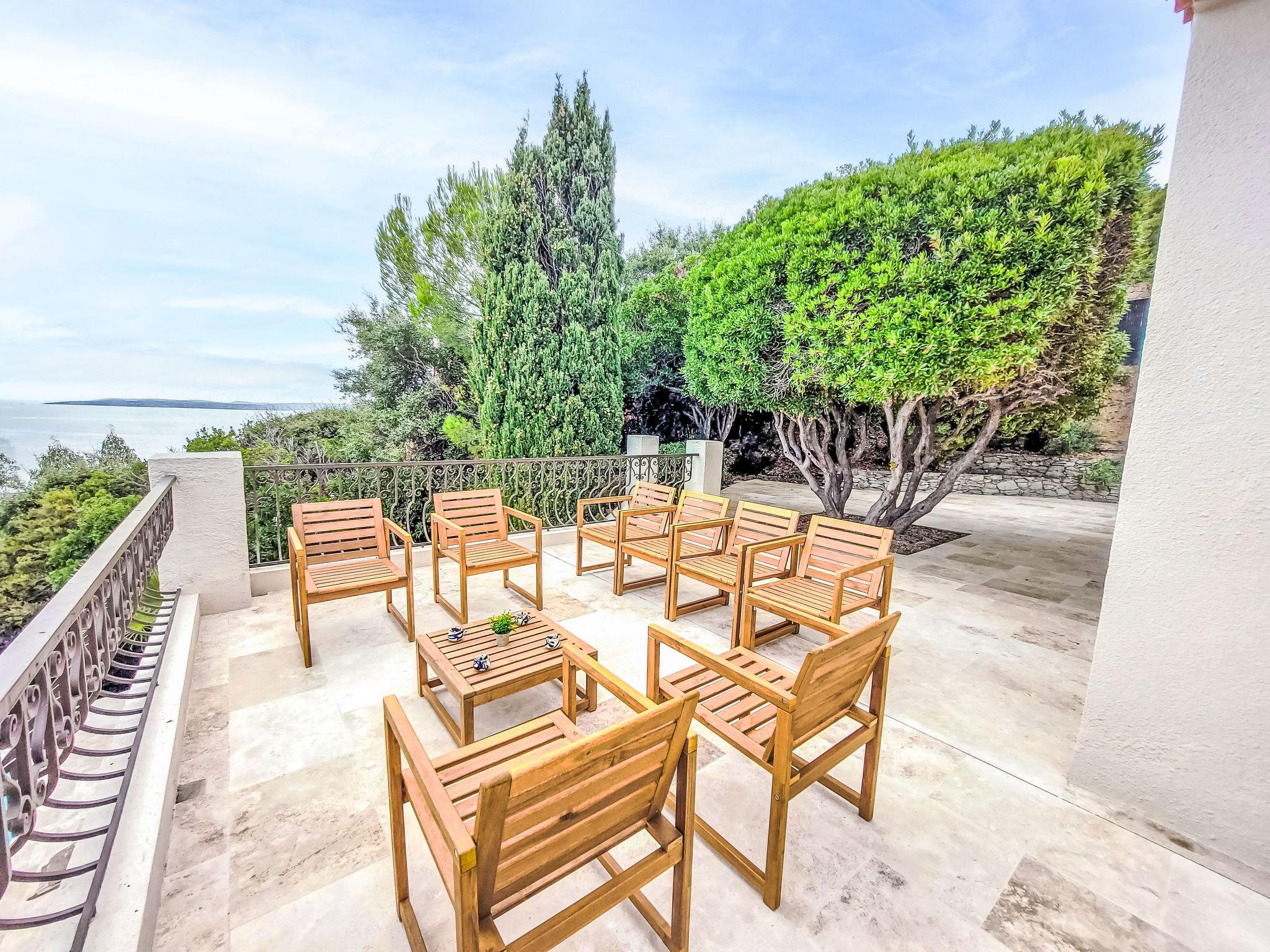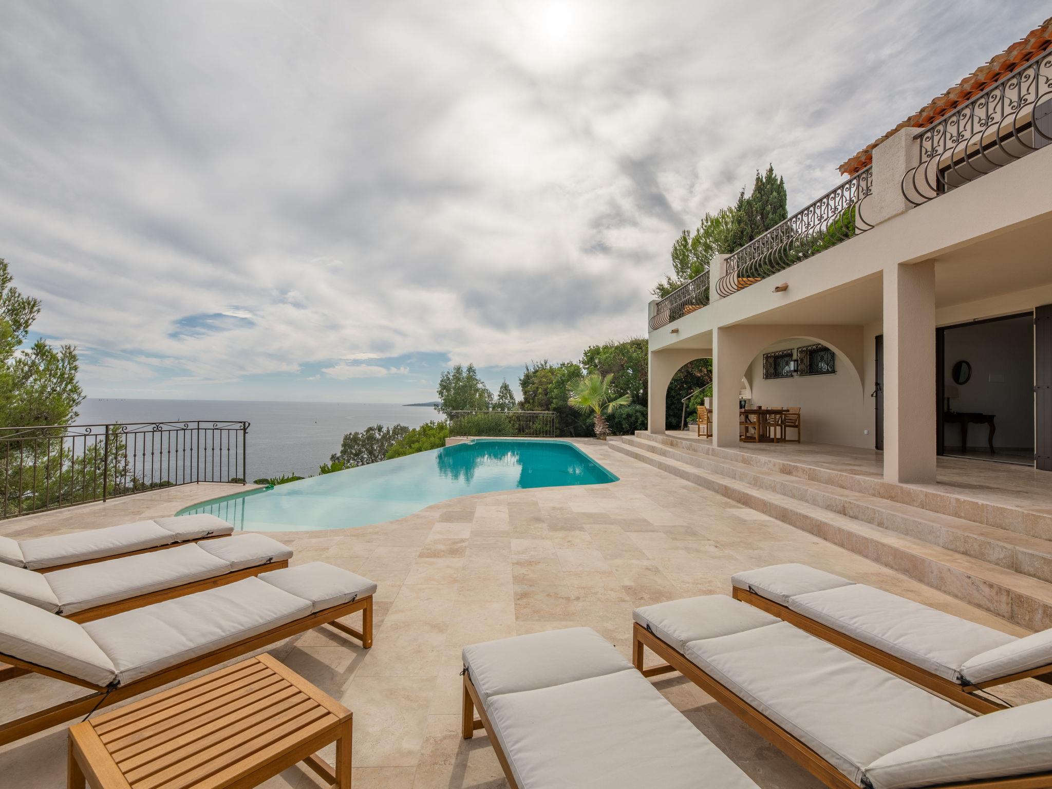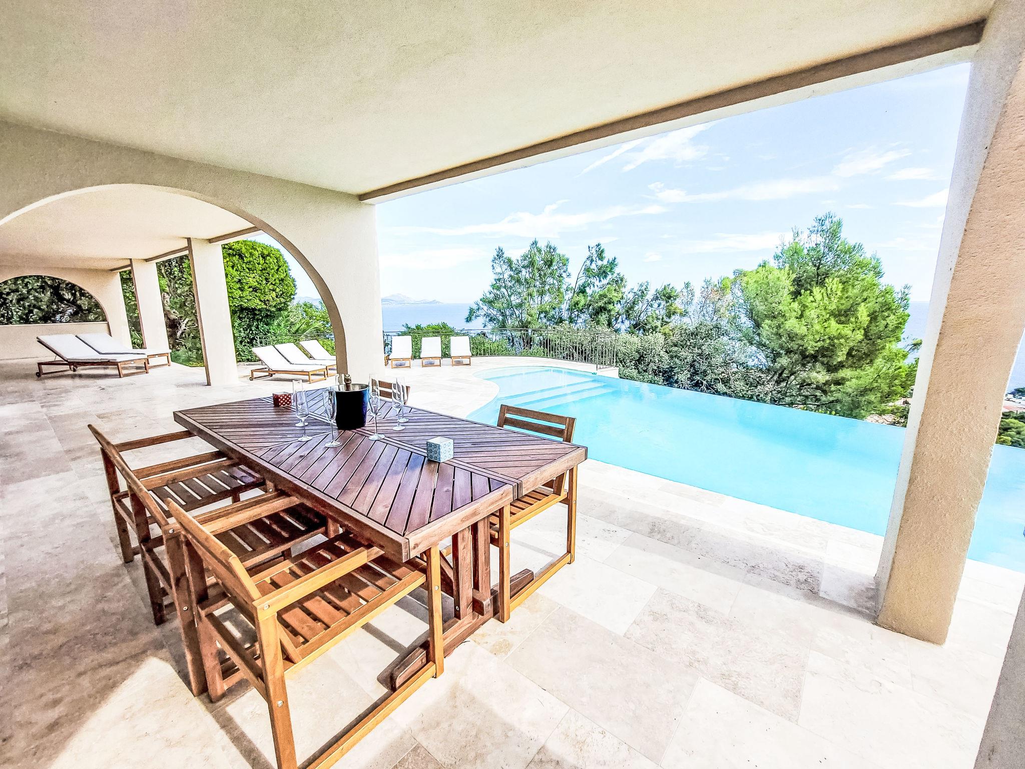 5-room villa 220 m2 on 2 levels. Modern furnishings: large living/dining room with panoramic window with TV (flat screen). Exit to the terrace. 1 large room with 1 french bed (160 cm, length 200 cm), bath/shower/WC and double hand-basin. Exit to the terrace. Large, open kitchen (oven, dishwasher, 4 induction hot plates, toaster, kettle, microwave, freezer, electric coffee machine, Capsules for coffee machine (Nespresso) extra) with bar. Sep. WC. Electric heating. On the lower ground floor: 1 large room with 1 french bed (160 cm, length 200 cm). Exit to the terrace, to the swimming pool. 1 large room with 1 french bed (1 x 160 cm, length 200 cm), hand-basin. Exit to the terrace, to the swimming pool. 1 large room with 1 french bed (1 x 160 cm, length 200 cm), bath/shower. Exit to the terrace, to the swimming pool. Shower/WC. Electric heating. Large terrace 300 m2, south facing position. Terrace furniture, balcony furniture, deck chairs (8). Panoramic view of the sea. Facilities: washing machine, iron, hair dryer. Internet (WiFi, free). Parking (1 car). Please note: non-smoking house. Smoke alarm. Offer by a private individual according to Art. 155, IV of CGI. 83107002726FM