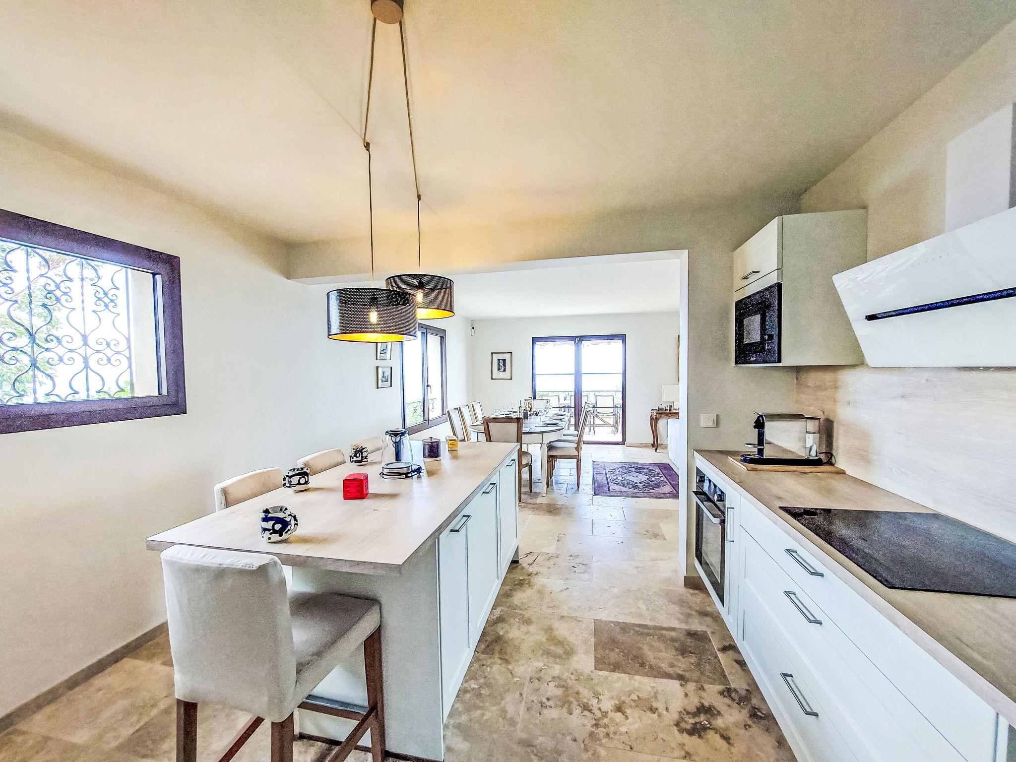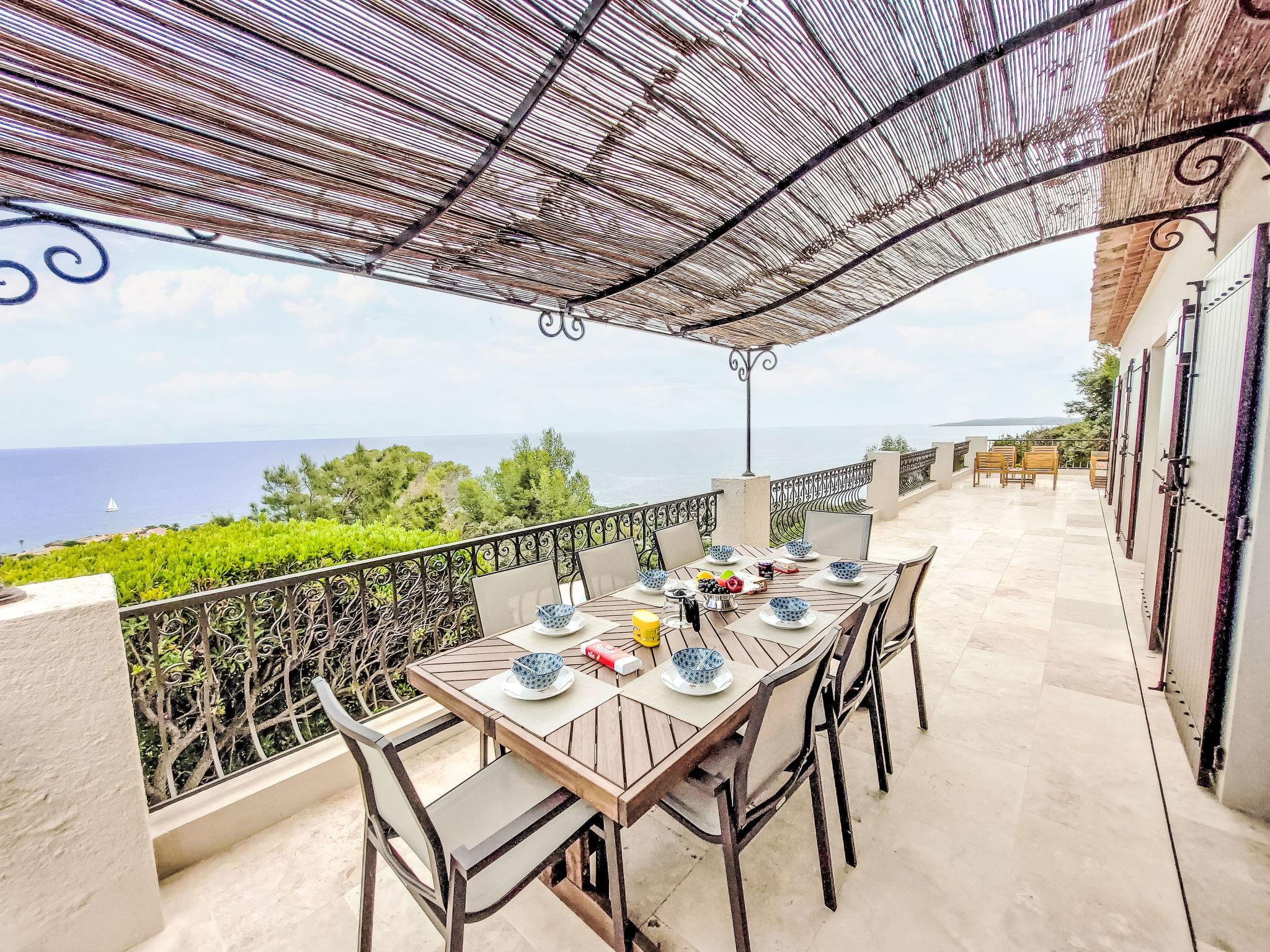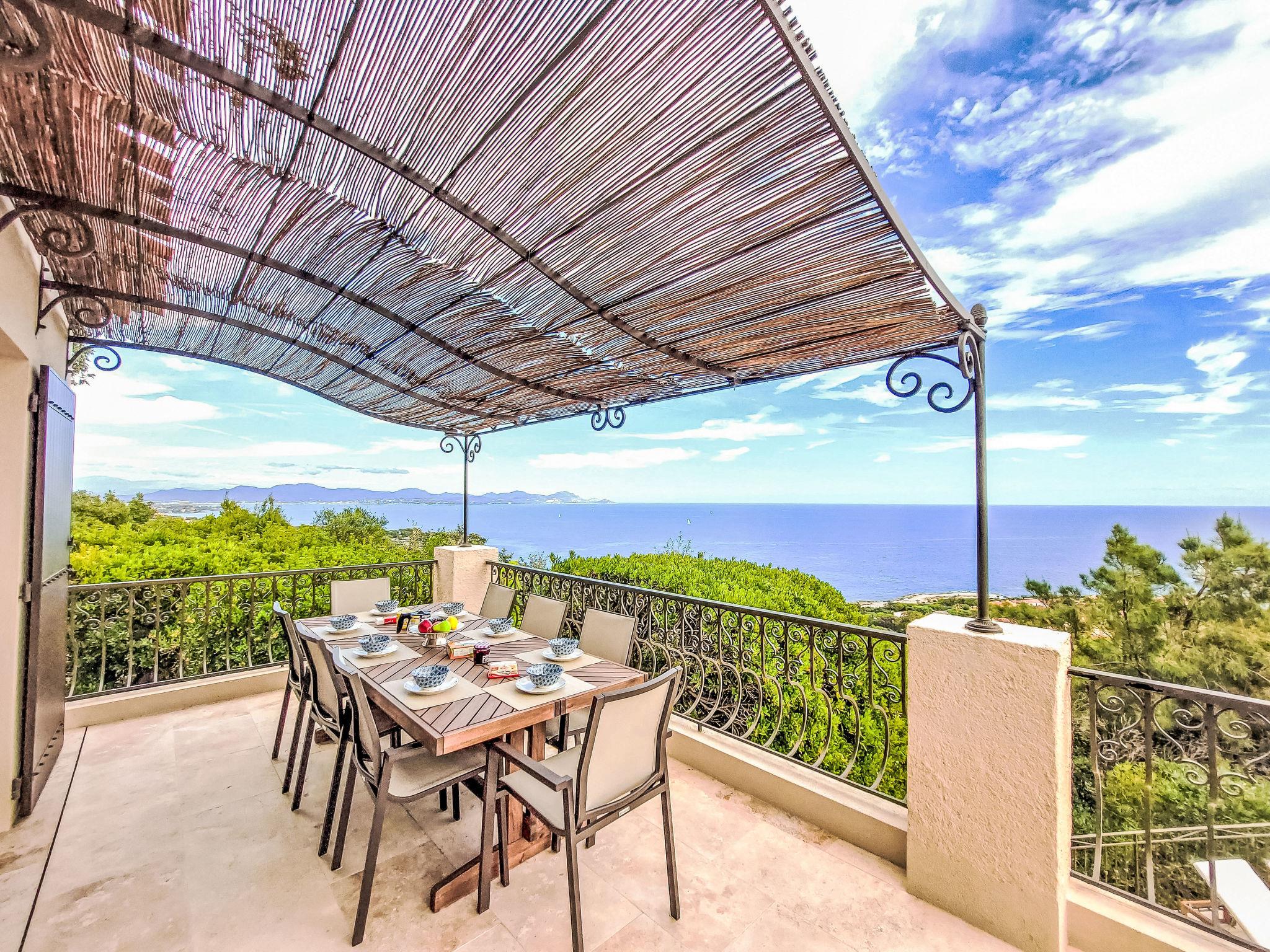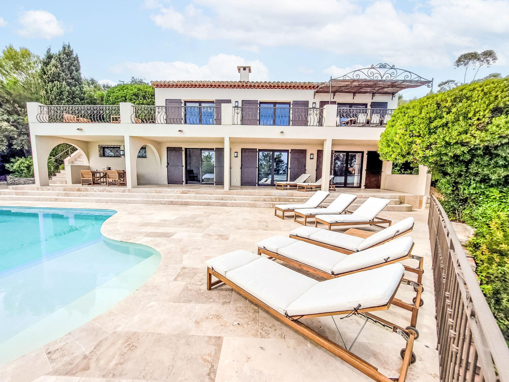5-room villa 220 m2 on 2 levels. Modern furnishings: large living/dining room with panoramic window with TV (flat screen). Exit to the terrace. 1 large room with 1 french bed (160 cm, length 200 cm), bath/shower/WC and double hand-basin. Exit to the terrace. Large, open kitchen (oven, dishwasher, 4 induction hot plates, toaster, kettle, microwave, freezer, electric coffee machine, Capsules for coffee machine (Nespresso) extra) with bar. Sep. WC. Electric heating. On the lower ground floor: 1 large room with 1 french bed (160 cm, length 200 cm). Exit to the terrace, to the swimming pool. 1 large room with 1 french bed (1 x 160 cm, length 200 cm), hand-basin. Exit to the terrace, to the swimming pool. 1 large room with 1 french bed (1 x 160 cm, length 200 cm), bath/shower. Exit to the terrace, to the swimming pool. Shower/WC. Electric heating. Large terrace 300 m2, south facing position. Terrace furniture, balcony furniture, deck chairs (8). Panoramic view of the sea. Facilities: washing machine, iron, hair dryer. Internet (WiFi, free). Parking (1 car). Please note: non-smoking house. Smoke alarm. Offer by a private individual according to Art. 155, IV of CGI. 83107002726FM