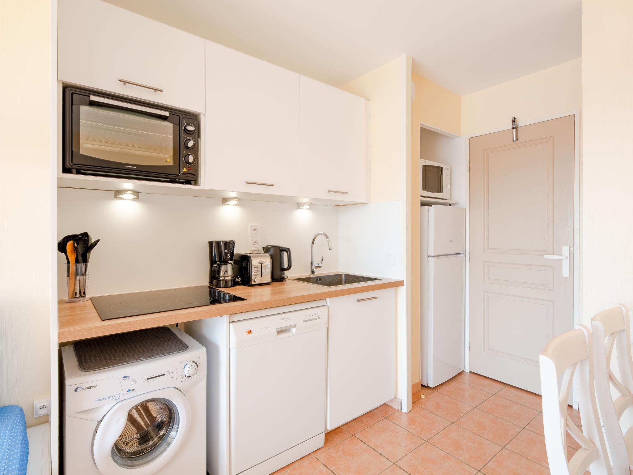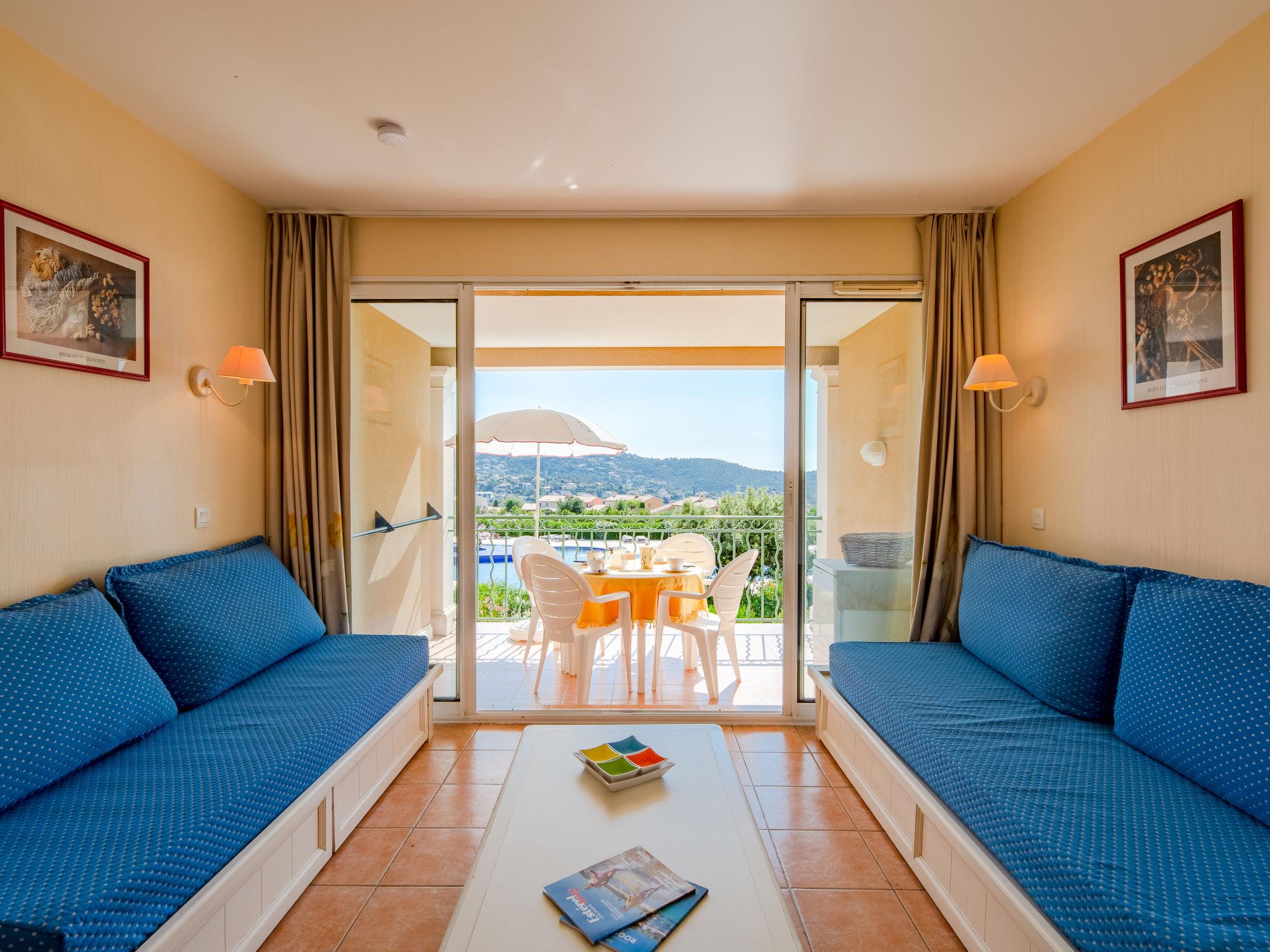 2-room apartment 32 m2 on 1st floor. Simple and practical furnishings: living/dining room with 2 beds (80 cm, length 190 cm), air conditioning. Exit to the terrace. 1 room with 1 french bed (140 cm). Kitchenette (mini-oven, dishwasher, 4 ceramic glass hob hotplates, toaster, kettle, microwave, freezer, electric coffee machine) with TV. Shower, sep. WC. Electric heating. Terrace. Beautiful view of the sea and the swimming pool. Facilities: washing machine, iron. Internet (WiFi, extra). Parking at the house. Please note: non-smokers only. 1 small pet/ dog allowed. Smoke alarm, no lift. 83107 000393 SX