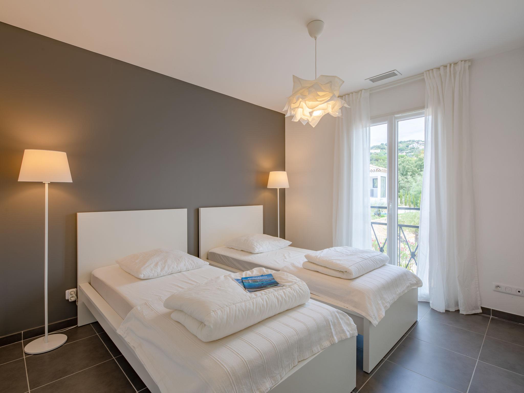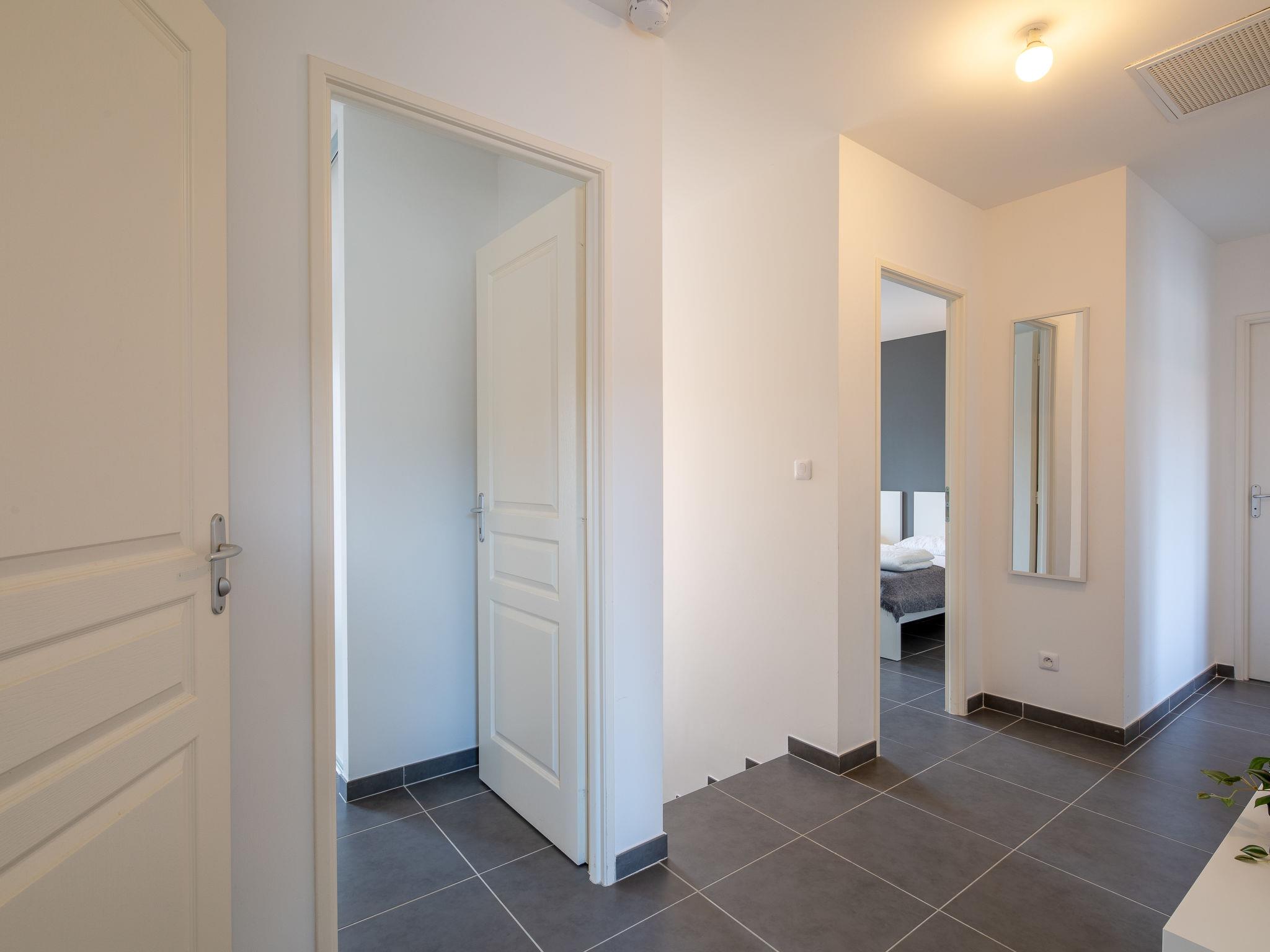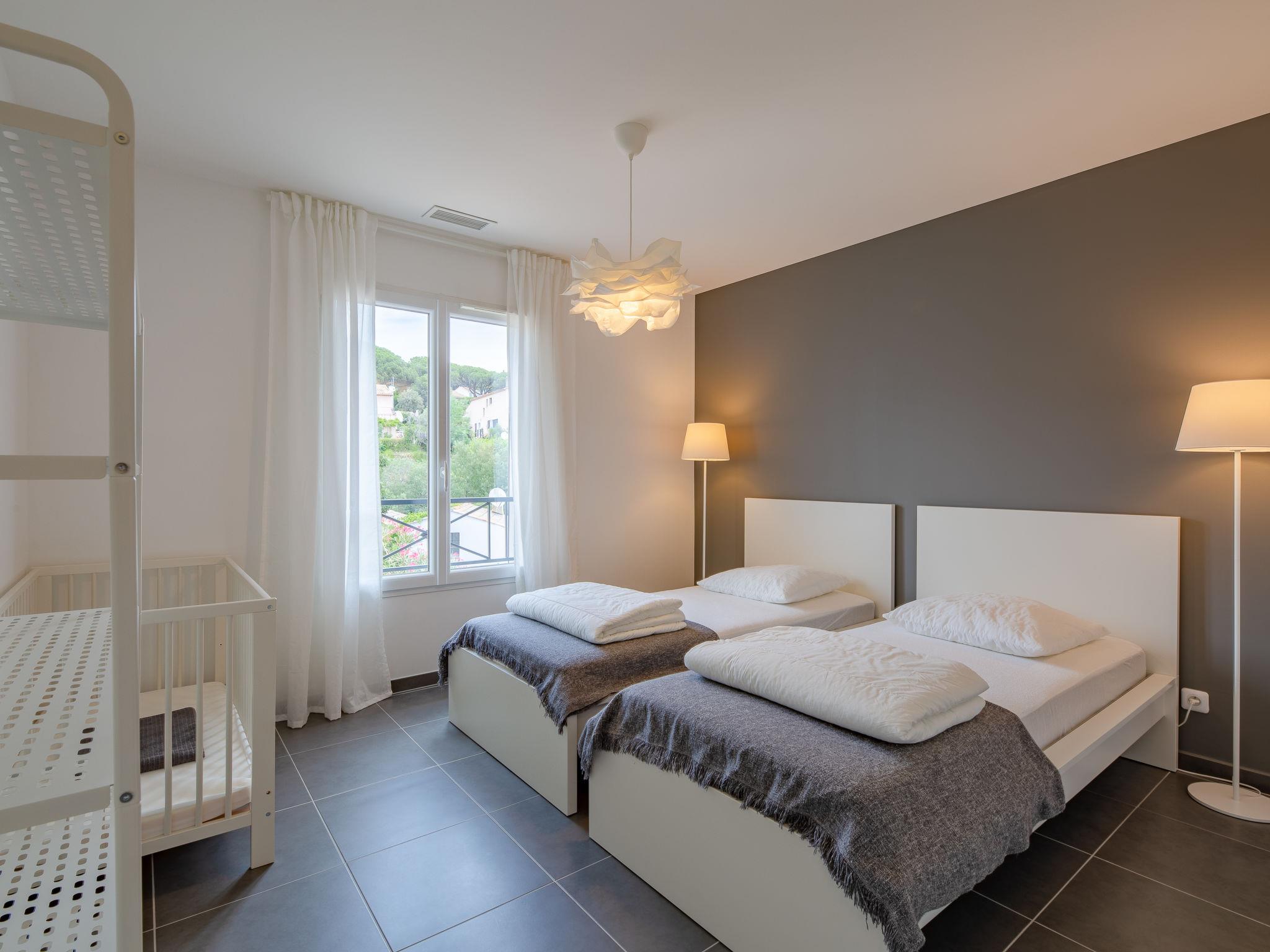 5-room terraced house 120 m2 on 2 levels, south-west facing position. Spacious and bright, comfortable and beautiful furnishings: entrance hall with separate WC. Large living/dining room. Exit to the terrace, to the swimming pool. Large, open kitchen (oven, dishwasher, 3 induction hot plates, toaster, kettle, freezer, electric coffee machine, combination microwave). Upper floor: 2 rooms, each room with 1 french bed (1 x 160 cm, length 200 cm). Exit to the balcony. 2 rooms, each room with 2 beds (90 cm, length 200 cm), shower. Bathroom, sep. WC. Air-conditioning. Balcony 18 m2, terrace 18 m2, roofed. Terrace furniture, deck chairs (6). Facilities: washing machine, dryer, baby cot. Internet (WiFi, free). Parking space n F, garage at the house. Please note: non-smoking house. Smoke alarm. Offer by a commercial proprietor according to Art. 155, IV, CGI 83107000658FI