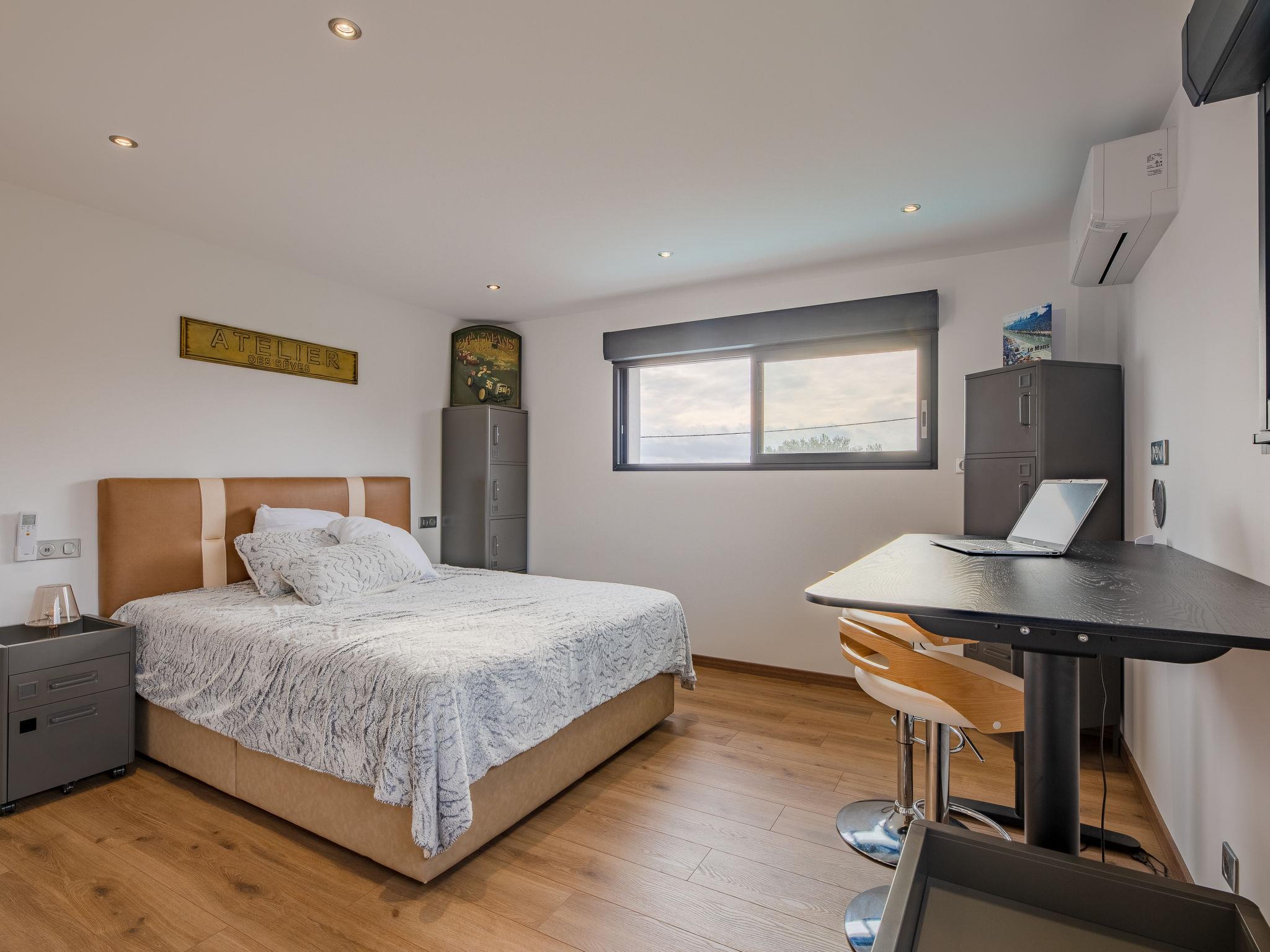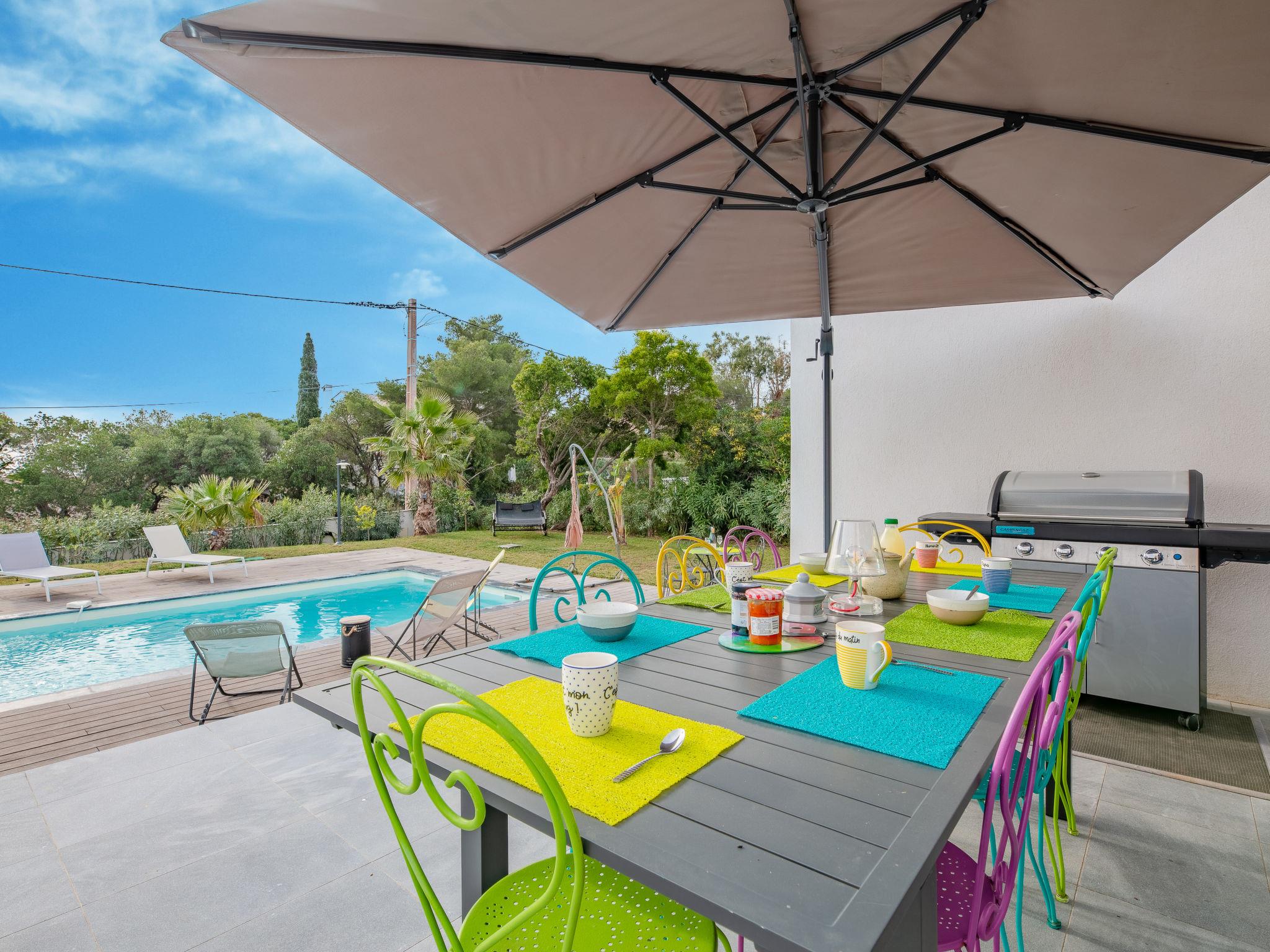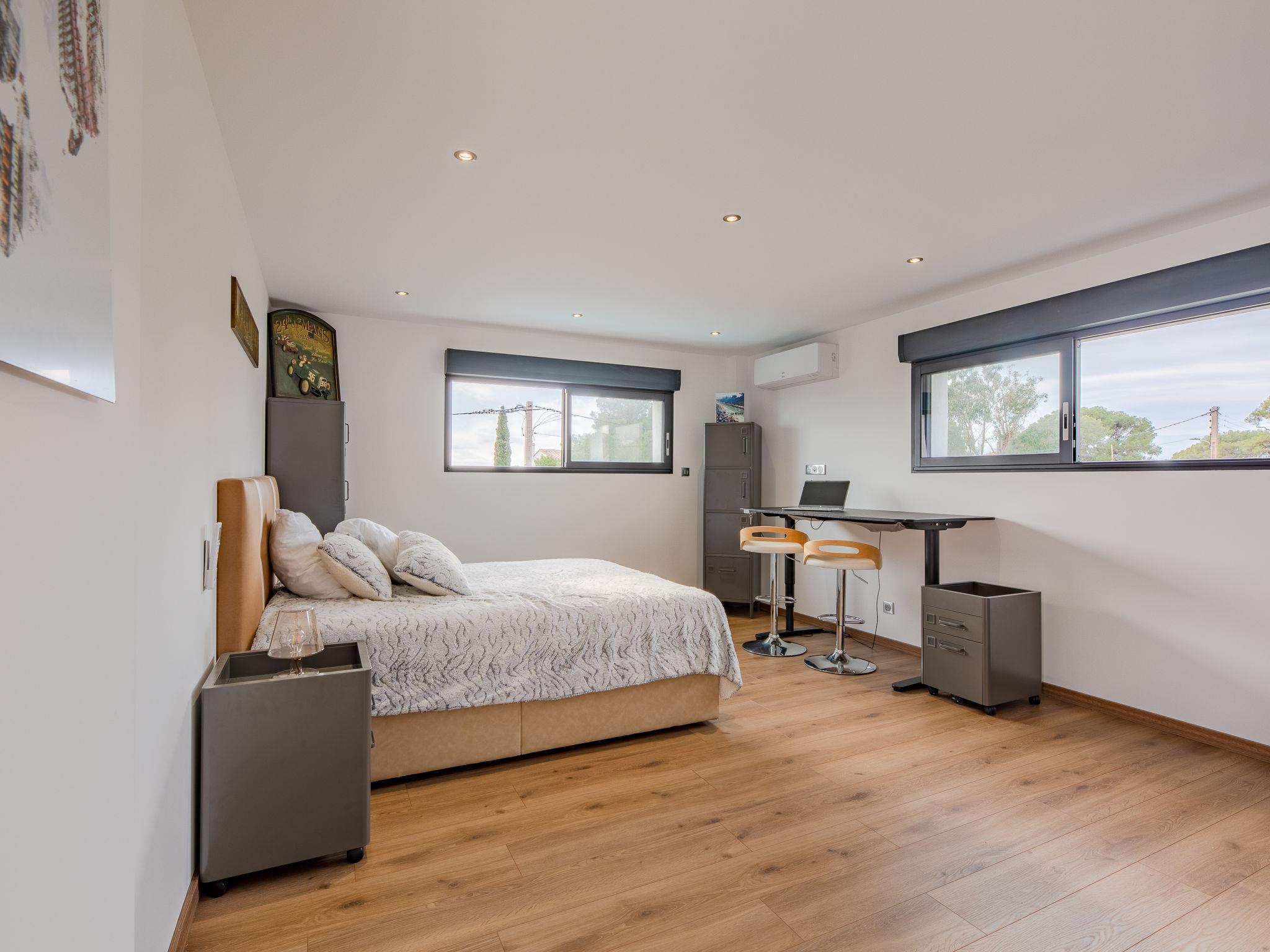 "Les Girelles", 6-room villa 230 m2 on 2 levels. Spacious, very modern and stylish furnishings: large living/dining room with digital TV, flat screen and air conditioning. Exit to the terrace. 1 room with 1 french bed (160 cm, length 200 cm), shower/WC and air conditioning. Exit to the terrace. 1 room with 2 beds (80 cm, length 200 cm), air conditioning. Exit to the garden. Open kitchen (oven, dishwasher, 4 induction hot plates, toaster, freezer, electric coffee machine, cooking island). Exit to the terrace. Sep. WC. Upper floor: 1 room with 1 french bed (160 cm, length 200 cm), air conditioning. 1 room with 1 french bed (160 cm, length 200 cm), air conditioning. Exit to the balcony. 1 room with 1 french bed (160 cm, length 200 cm), bath/shower/WC, double hand-basin and air conditioning. Exit to the balcony. Shower/WC. Electric heating, air-conditioning. Large balcony 20 m2, south facing position, large terrace 30 m2 partly roofed, south facing position. Panoramic view of the sea. Facilities: washing machine. Internet (WiFi, free). Please note: non-smoking house. Smoke alarm. Video surveillance of the entrance and car park. Offer by a commercial proprietor according to Art. 155, IV, CGI 83107001116R1