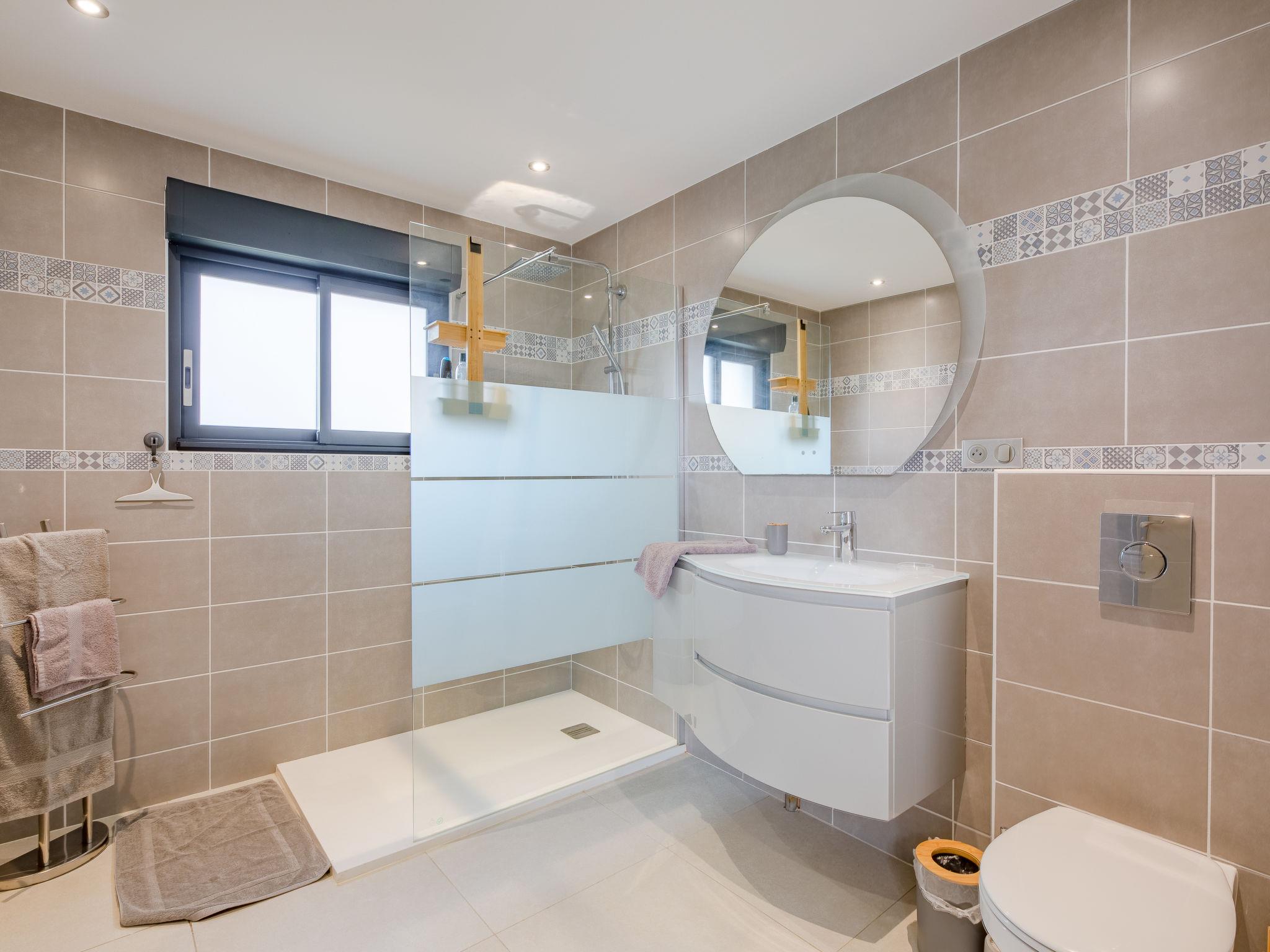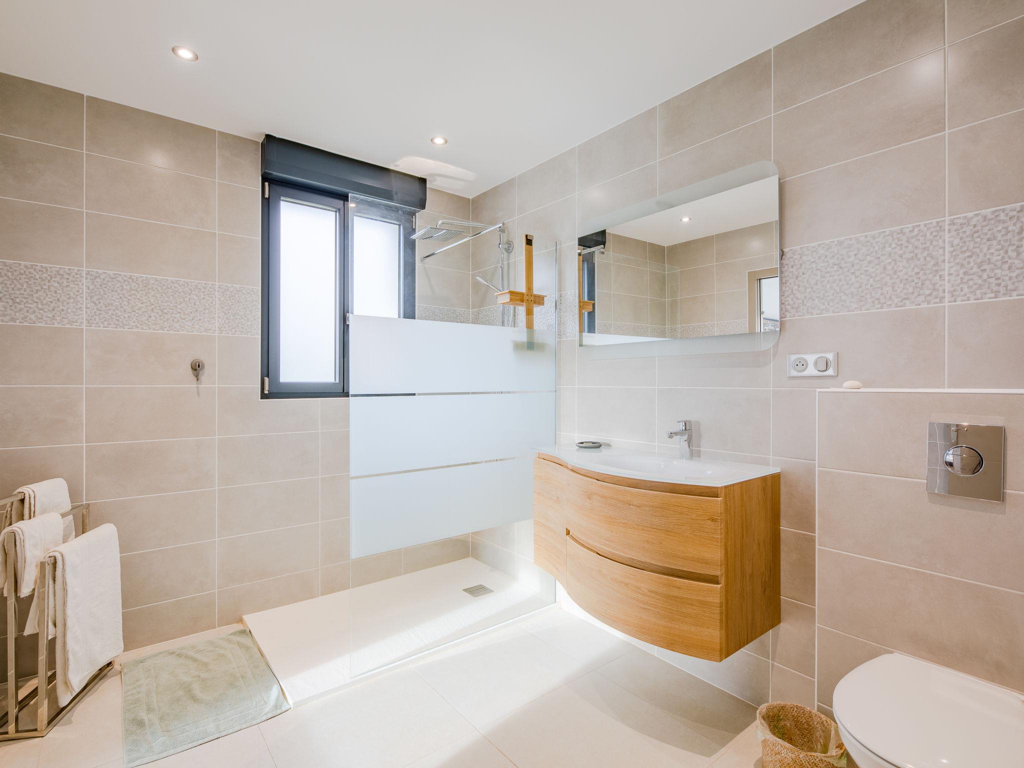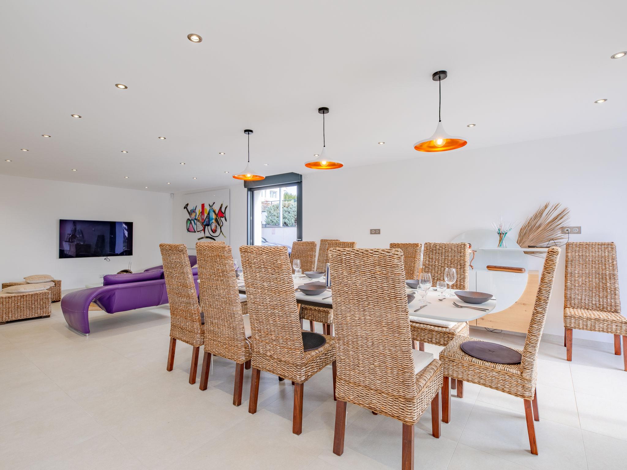 "Les Girelles", 6-room villa 230 m2 on 2 levels. Spacious, very modern and stylish furnishings: large living/dining room with digital TV, flat screen and air conditioning. Exit to the terrace. 1 room with 1 french bed (160 cm, length 200 cm), shower/WC and air conditioning. Exit to the terrace. 1 room with 2 beds (80 cm, length 200 cm), air conditioning. Exit to the garden. Open kitchen (oven, dishwasher, 4 induction hot plates, toaster, freezer, electric coffee machine, cooking island). Exit to the terrace. Sep. WC. Upper floor: 1 room with 1 french bed (160 cm, length 200 cm), air conditioning. 1 room with 1 french bed (160 cm, length 200 cm), air conditioning. Exit to the balcony. 1 room with 1 french bed (160 cm, length 200 cm), bath/shower/WC, double hand-basin and air conditioning. Exit to the balcony. Shower/WC. Electric heating, air-conditioning. Large balcony 20 m2, south facing position, large terrace 30 m2 partly roofed, south facing position. Panoramic view of the sea. Facilities: washing machine. Internet (WiFi, free). Please note: non-smoking house. Smoke alarm. Video surveillance of the entrance and car park. Offer by a commercial proprietor according to Art. 155, IV, CGI 83107001116R1
