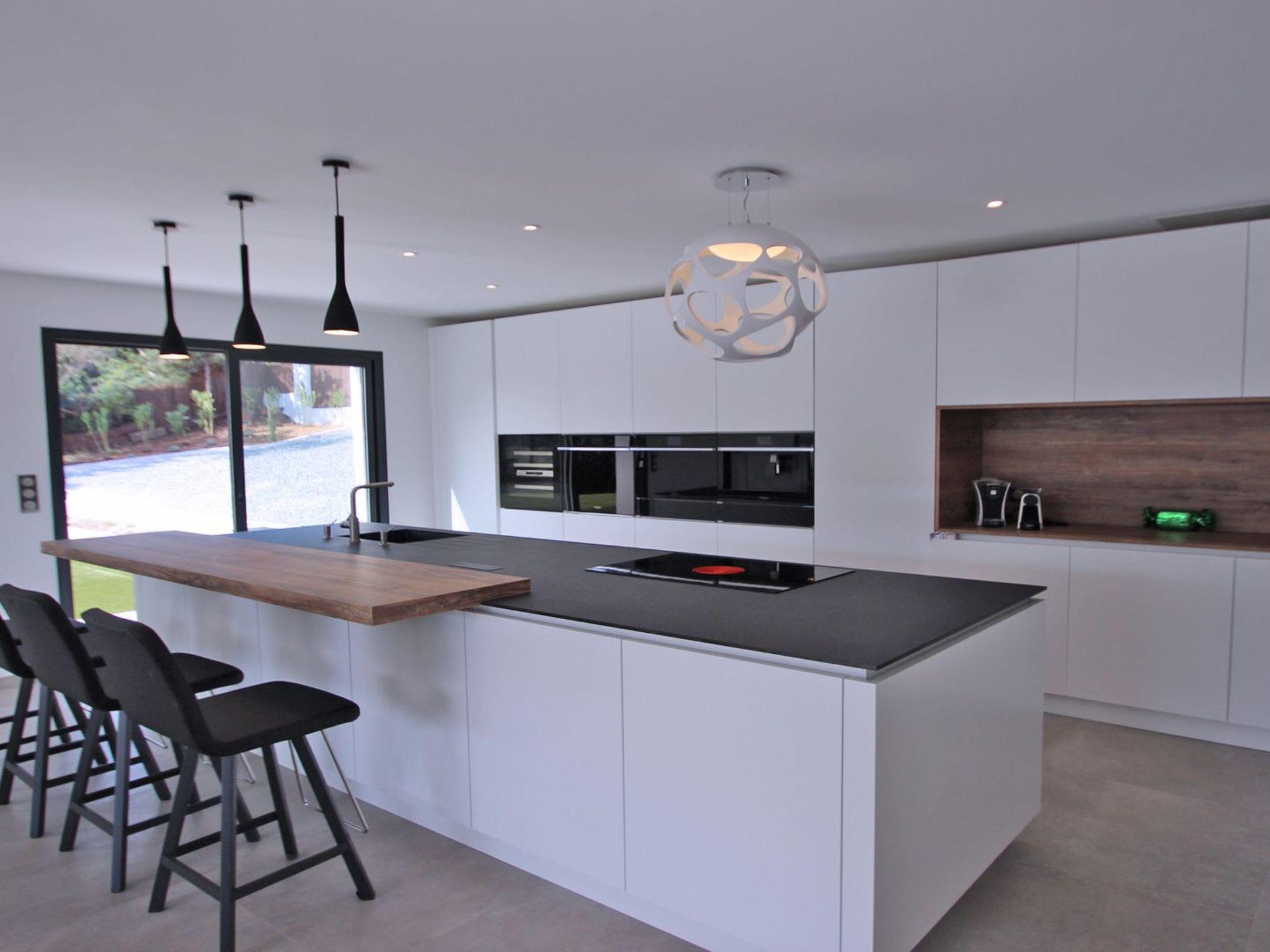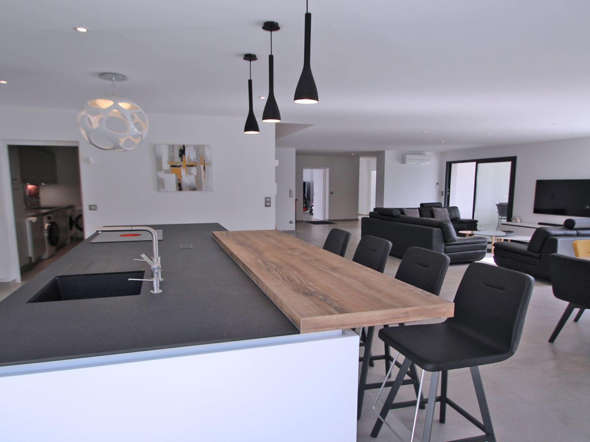 - Top-of-the-range open-plan kitchen: 4-burner hob with integrated extractor hood, fridge, freezer, crisp oven (rapid cooking function), microwave, wine cellar, dishwasher, Nespresso coffee machine, coffee maker, toaster, kettle, grill, various small appliances, crockery and kitchen utensils
