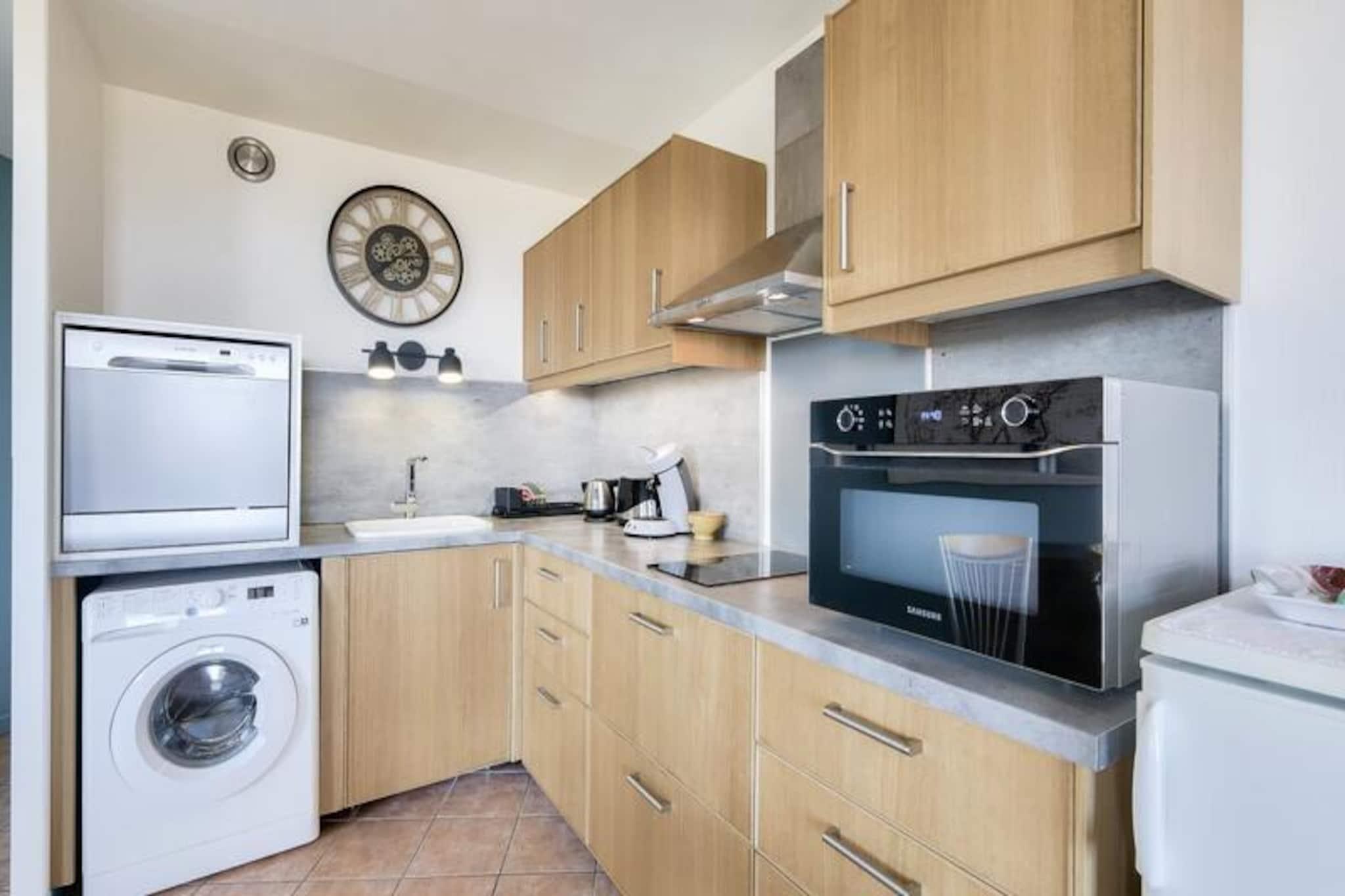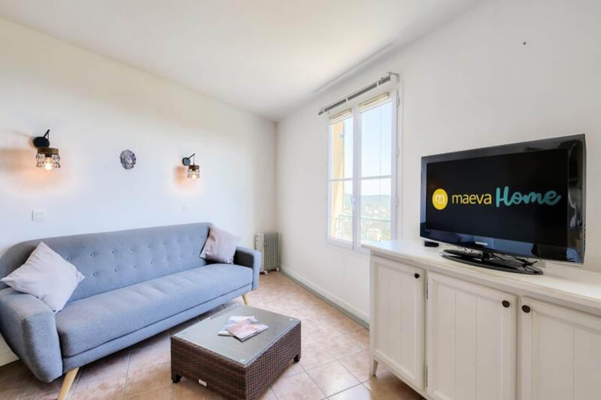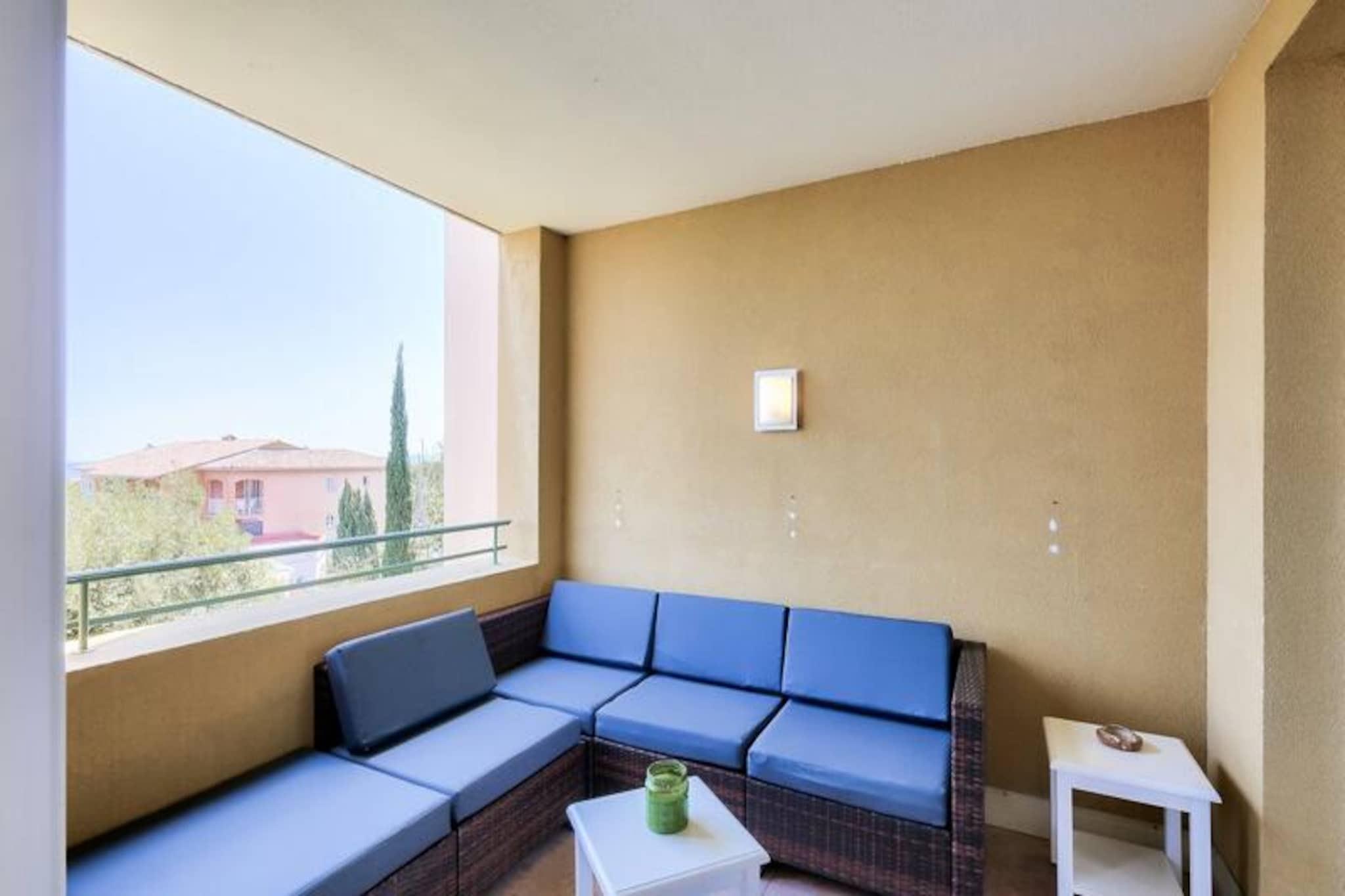Denne charmerende lejlighed, beliggende kun få kilometer fra strandene i Sainte-Maxime og Issambres, tilbyder et behageligt ophold for op til 4 gæster. Lejligheden har to hyggelige soveværelser med dobbeltsenge, en rummelig stue med sofa samt et veludstyret køkken. Det er kæledyrsvenligt, så du kan tage dine lodne ledsagere med. Gæsterne kan nyde den friske luft på den private balkon, som byder på en smuk sydvendt udsigt over havet. Lejligheden har aircondition, hvilket sikrer et behageligt ophold på alle årstider, og udendørs parkering er tilgængelig for nemheds skyld. Denne lejlighed ligger inden for 4 km gåtur fra stranden og er omgivet af naturlig skønhed og udendørs aktiviteter. Området er ideelt for vandentusiaster, med muligheder for sejlads, vandski og kajaksejlads i nærheden. De pulserende byer Fréjus, Saint-Raphaël og Sainte-Maxime tilbyder et udvalg af butikker, caféer og markeder inden for en kort køretur, med det nærmeste supermarked kun 500 meter fra ejendommen. Gæsterne kan også udforske de naturskønne vandrestier, og en tennisbane er tilgængelig i nærheden for dem, der ønsker at forblive aktive. Lejligheden har et fuldt udstyret køkken med mikrobølgeovn, ovn og køleskab, så du nemt kan tilberede dine måltider. Det moderne badeværelse har bruser, mens yderligere faciliteter såsom Wi-Fi, et tv og en vaskemaskine også tilbydes. Gæsterne kan nyde den fælles udendørs swimmingpool, der er åben fra maj til september, eller slappe af på balkonen med en forfriskende drink efter en dag med aktiviteter.