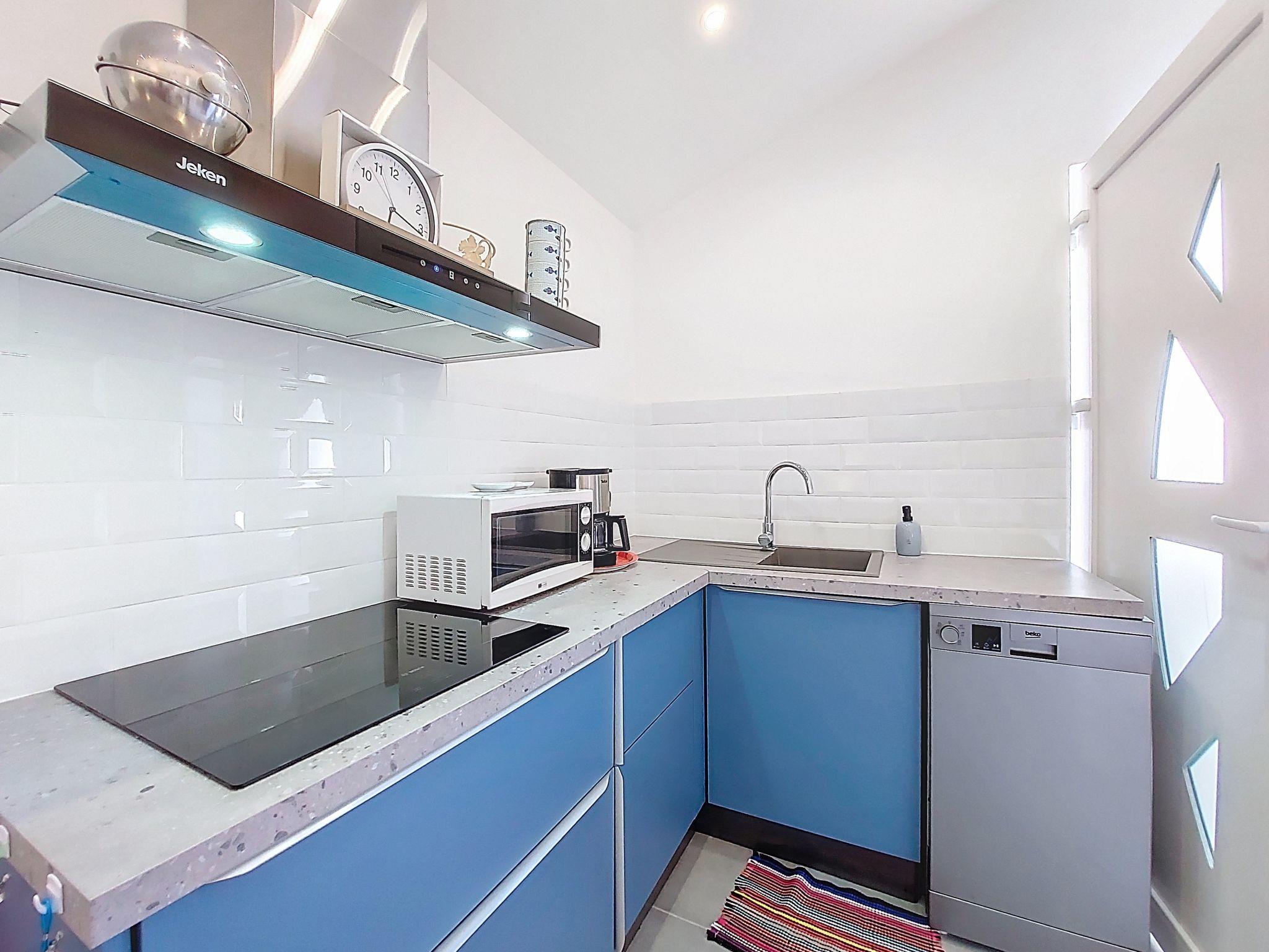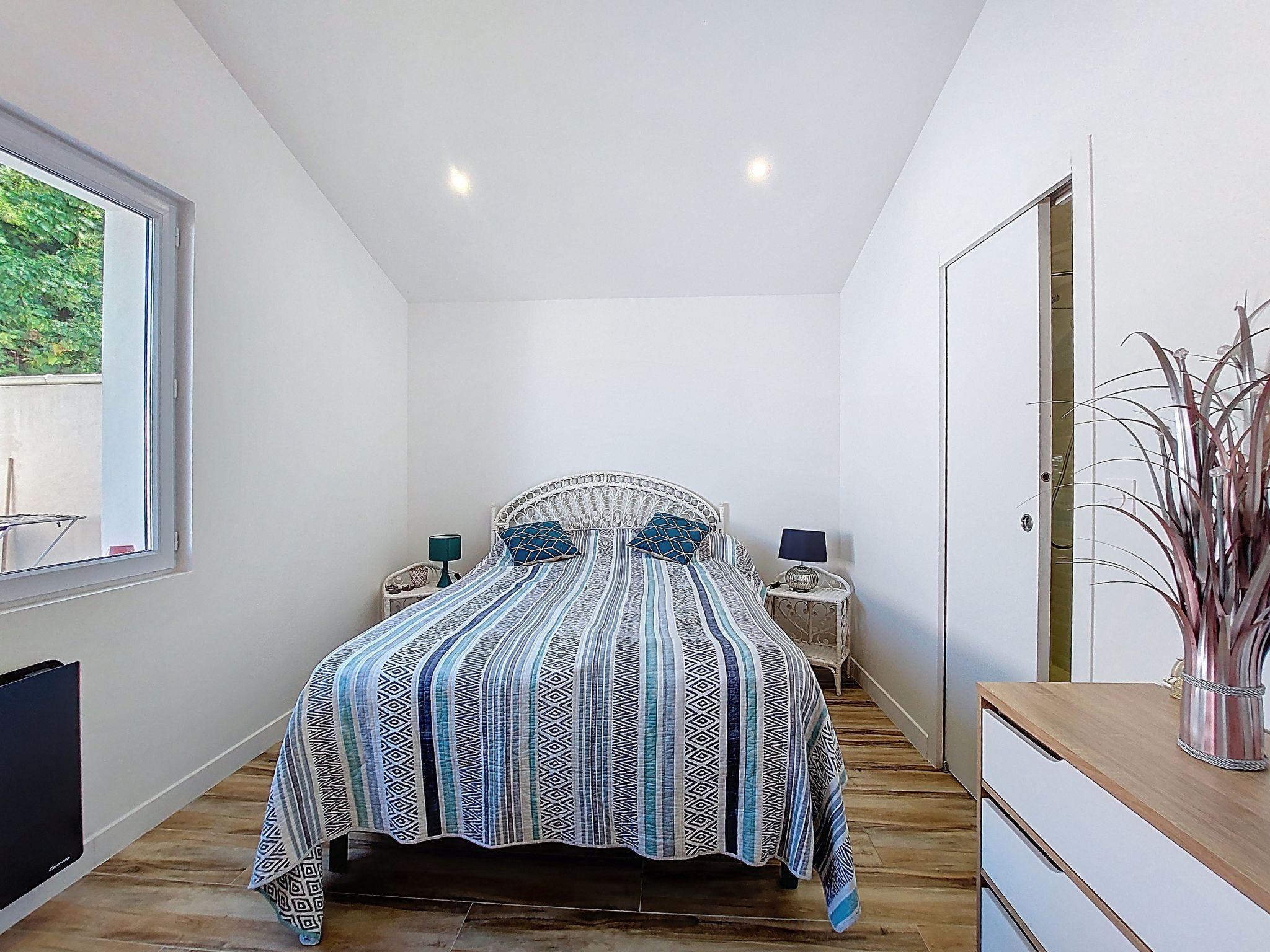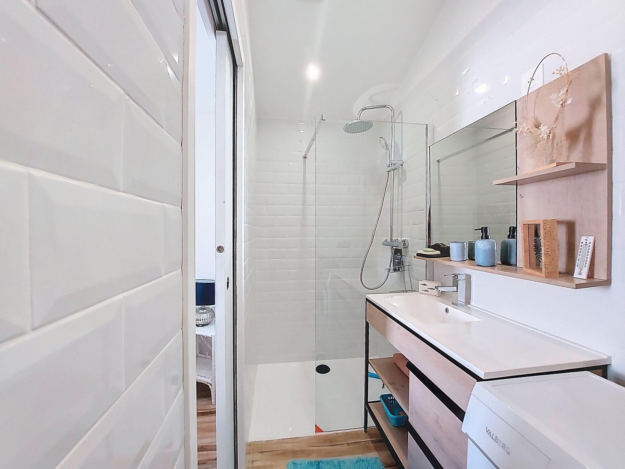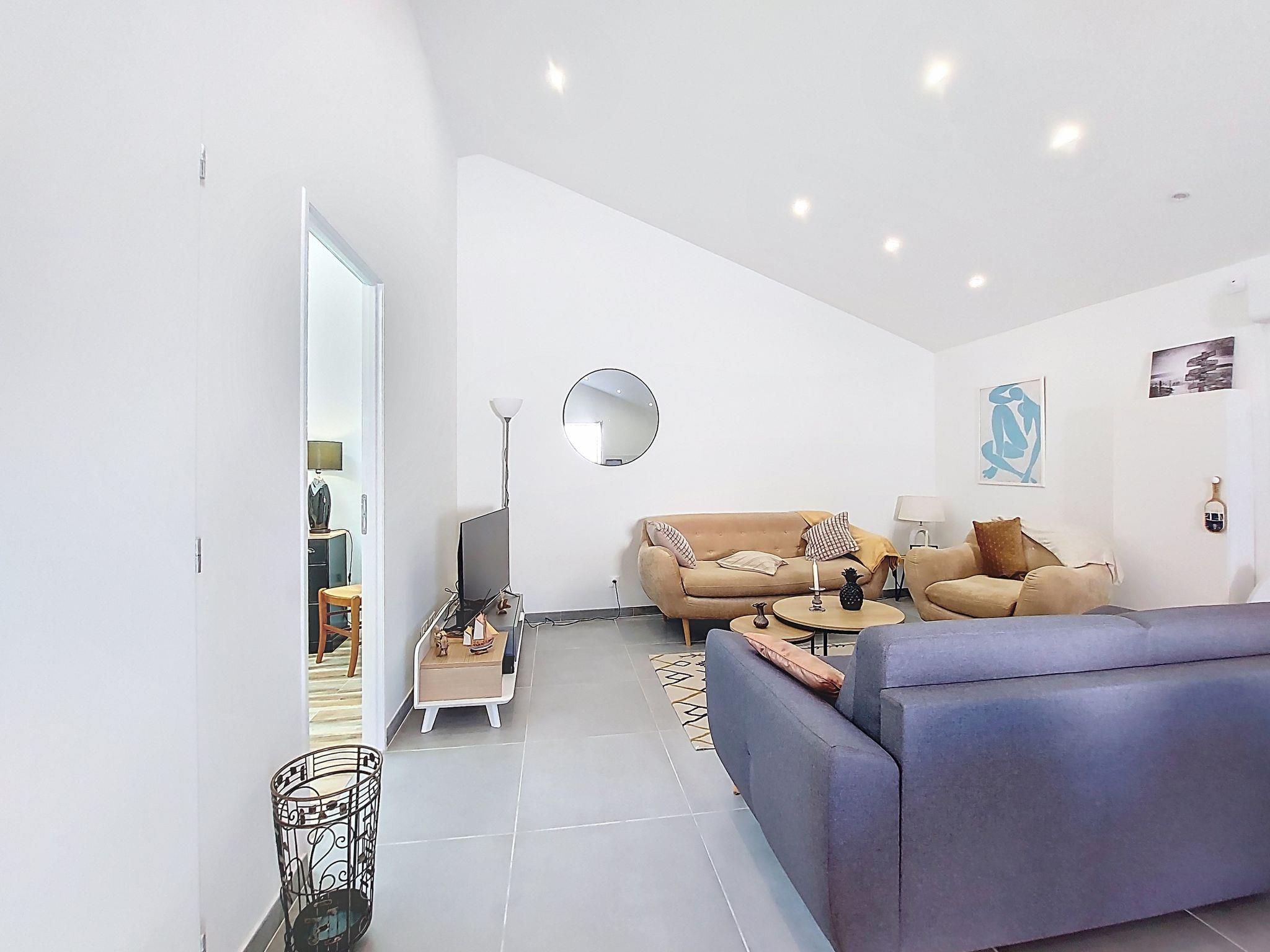 3-room terraced house 63 m2. Living/dining room with TV (flat screen). Exit to the terrace. 1 room with 1 french bed (160 cm, length 190 cm). 1 room with 1 french bed (140 cm, length 190 cm). Open kitchen (oven, dishwasher, 4 ceramic glass hob hotplates, toaster, kettle, microwave, freezer, electric coffee machine, steamer). Shower/WC. Electric heating. Large terrace 45 m2. Terrace furniture, electric barbecue. Facilities: washing machine. Internet (WiFi, extra). Please note: smoke alarm. Offer by a private individual according to Art. 155, IV of CGI.