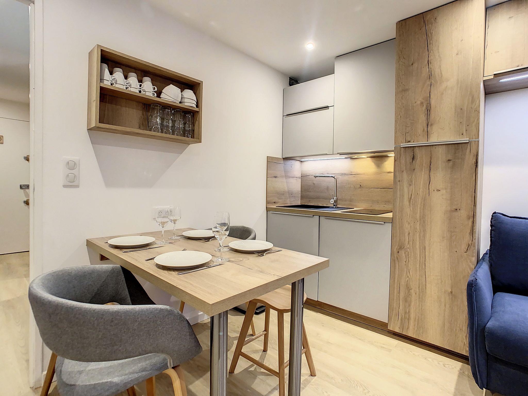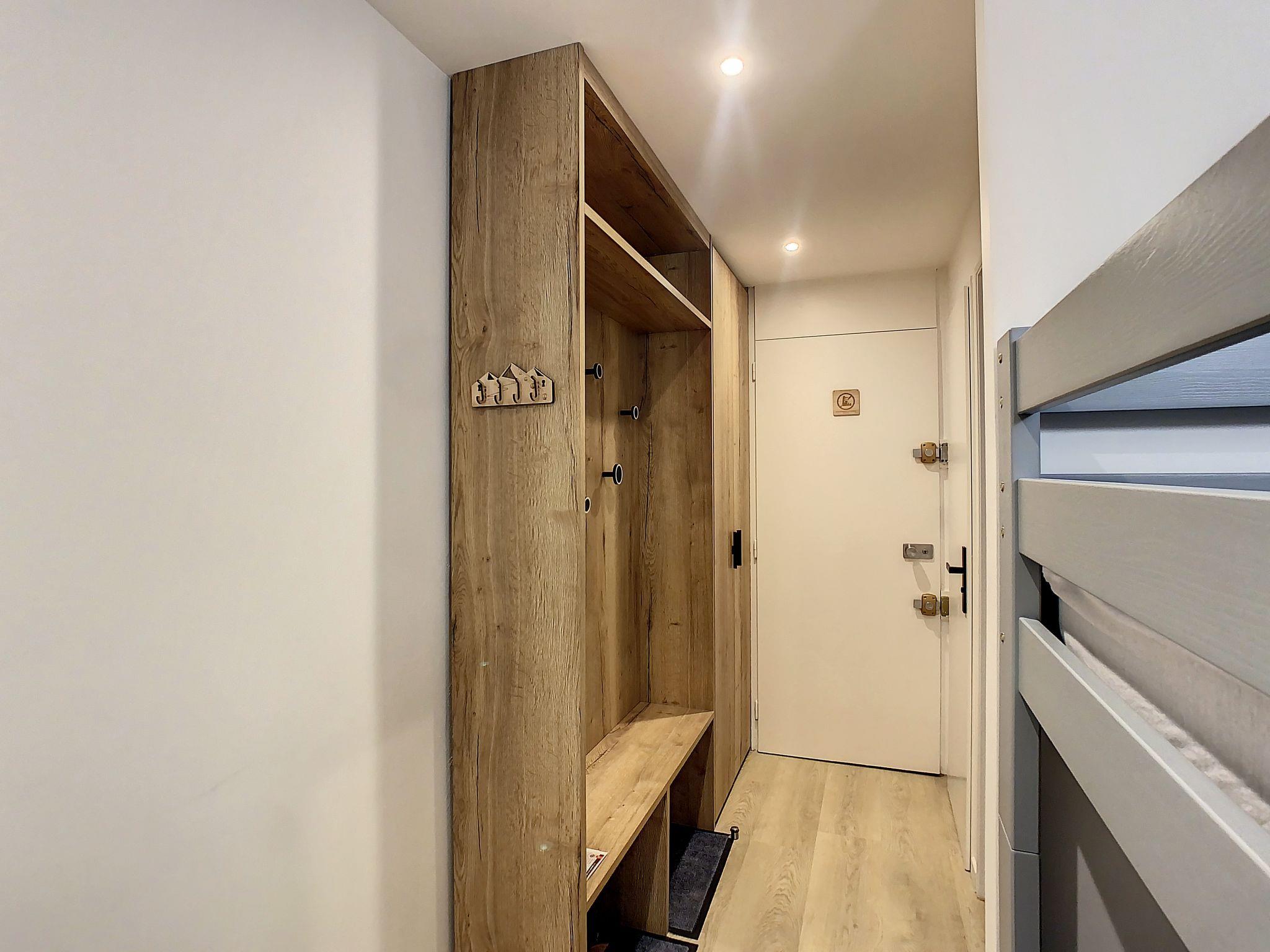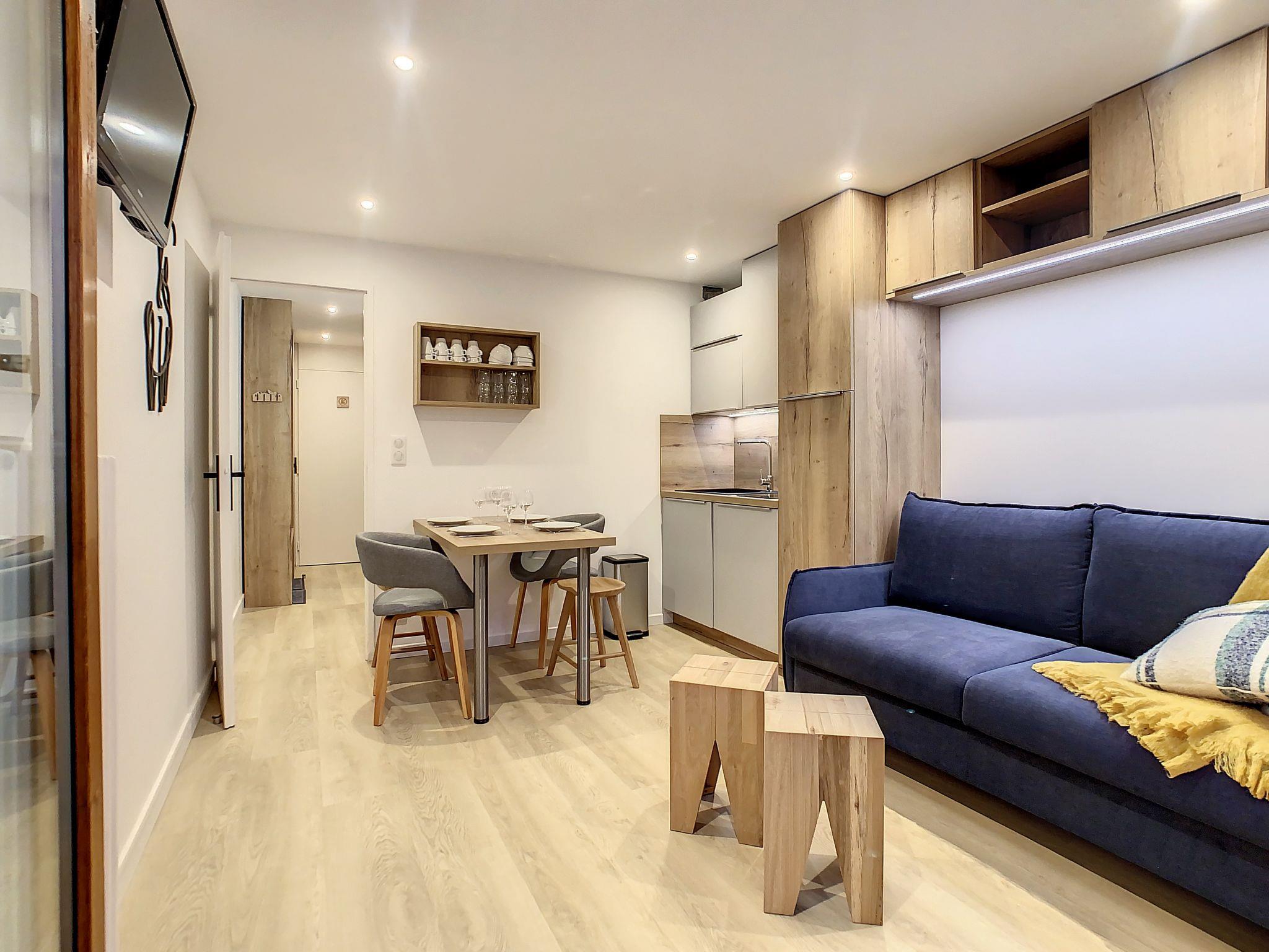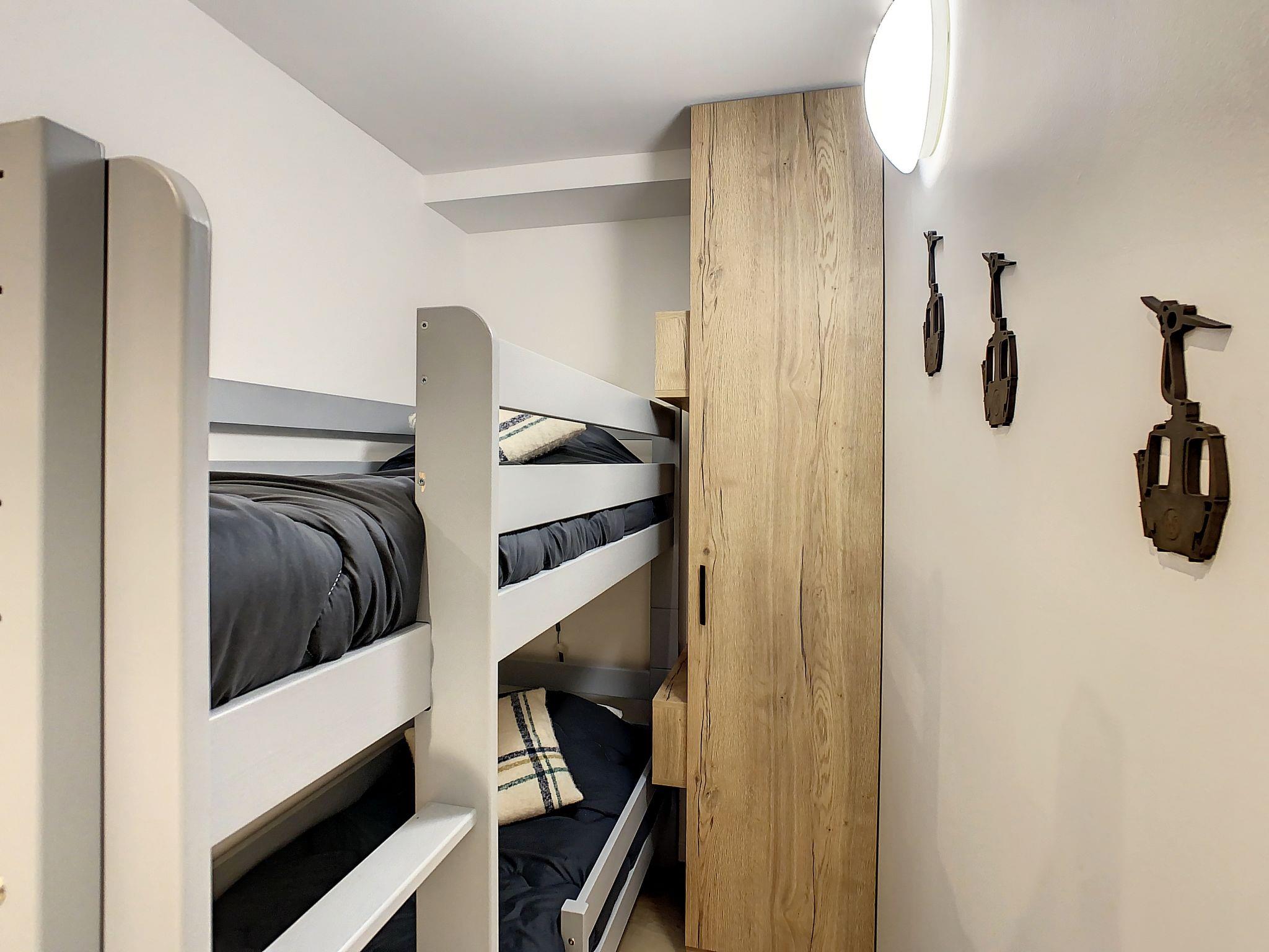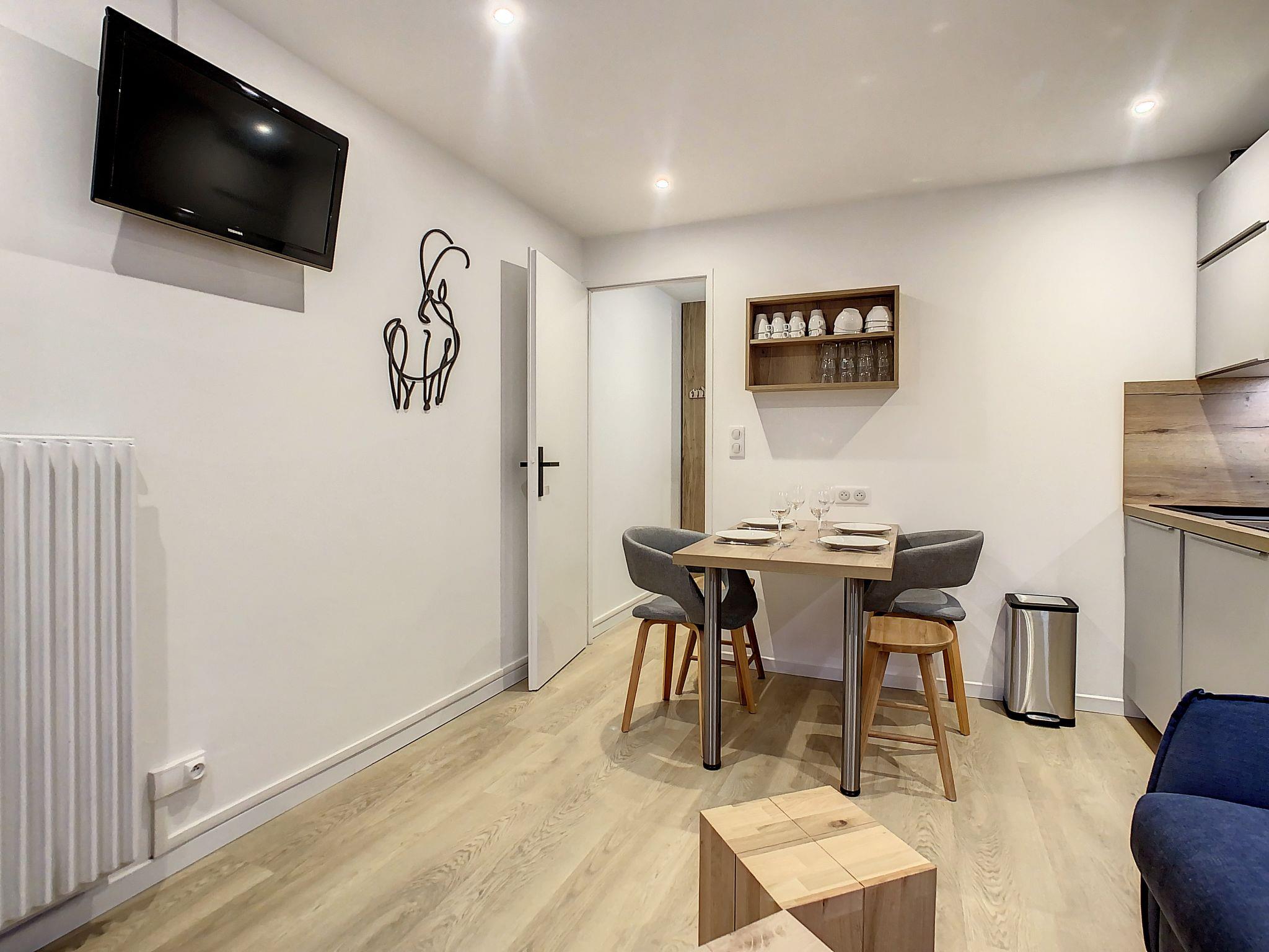"Chavière 716", 1-room apartment 24 m2 on 7th floor, south facing position. Fully renovated in 2022, beautiful and modern furnishings: living/dining room with 1 double sofabed (140 cm, length 190 cm), TV (flat screen). Exit to the balcony. Sleeping alcove with 1 x 2 bunk beds (80 cm, length 190 cm). Kitchenette (mini-oven, dishwasher, 2 induction hot plates, toaster, kettle, electric coffee machine, raclette grill). Shower, sep. WC. Heating. Very beautiful view of the mountains. Facilities: hair dryer. Internet (WiFi, extra). Please note: non-smokers only. Smoke alarm. Instead of an enclosed bedroom, some sleeping areas are located in an open-plan area (gallery, alcove, etc.). Offer by a private individual according to Art. 155, IV of CGI. 73257005232AK