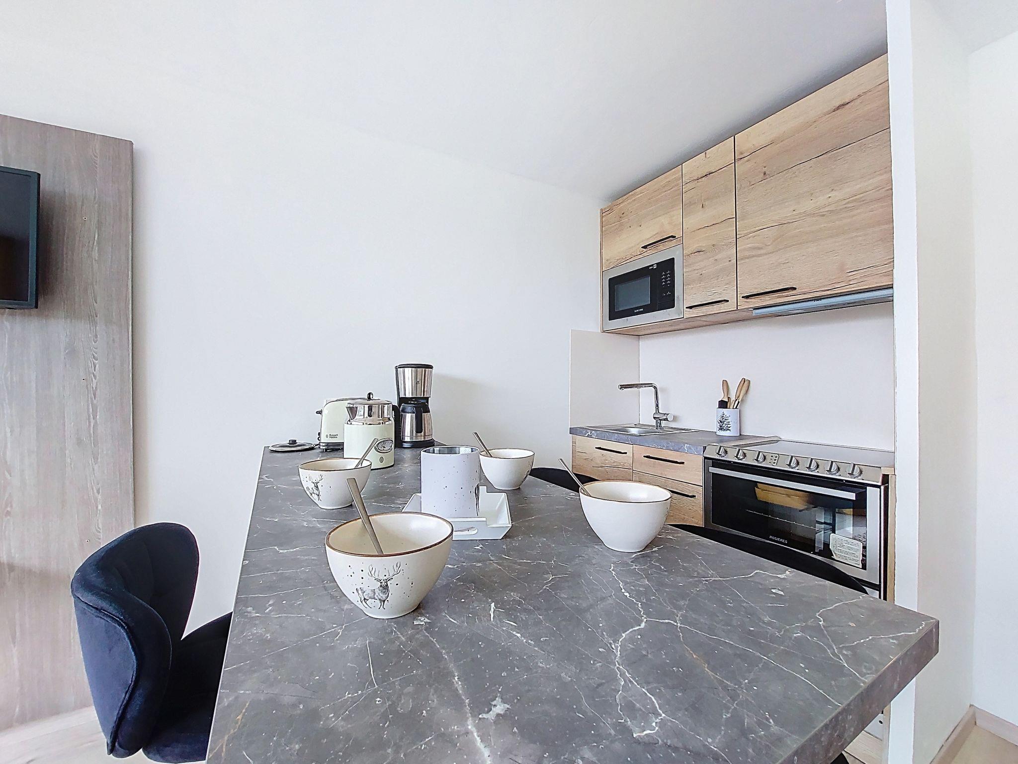 "317 Les Trois Marches", 2-room apartment 24 m2 on 3rd floor, south facing position. Beautiful and modern furnishings: living/dining room with 1 double sofabed (140 cm, length 190 cm), dining table and TV (flat screen). Exit to the balcony, south facing position. 1 open small room with 1 x 2 bunk beds (90 cm, length 190 cm). Kitchenette (oven, dishwasher, 4 ceramic glass hob hotplates, toaster, kettle, microwave, electric coffee machine, raclette grill, fondue Set (cheese)). Bath/WC. Electric heating. Very beautiful panoramic view of the mountains and the ski run. Facilities: Internet (WiFi, extra). Please note: non-smokers only. Smoke alarm. Offer by a private individual according to Art. 155, IV of CGI.