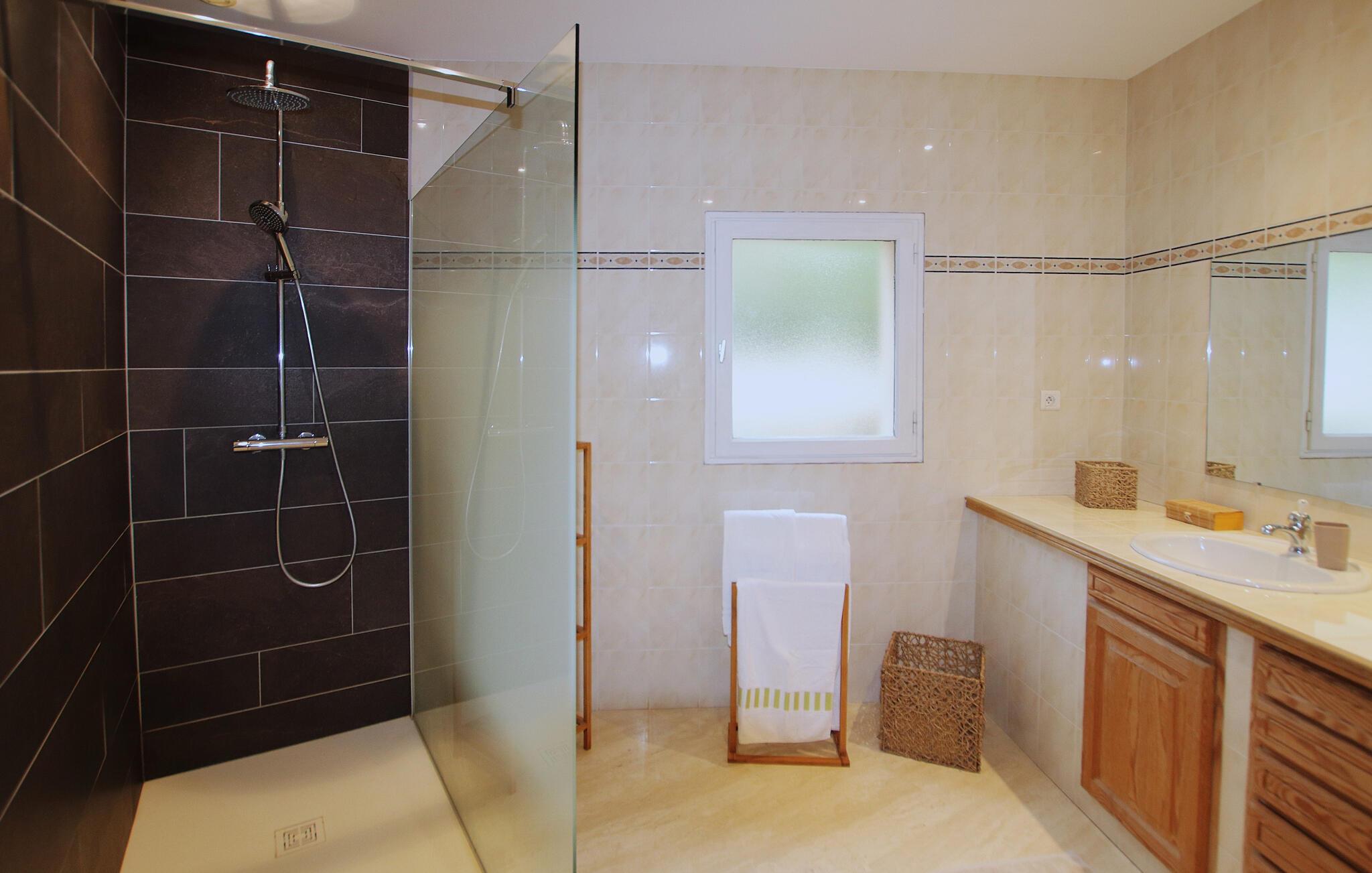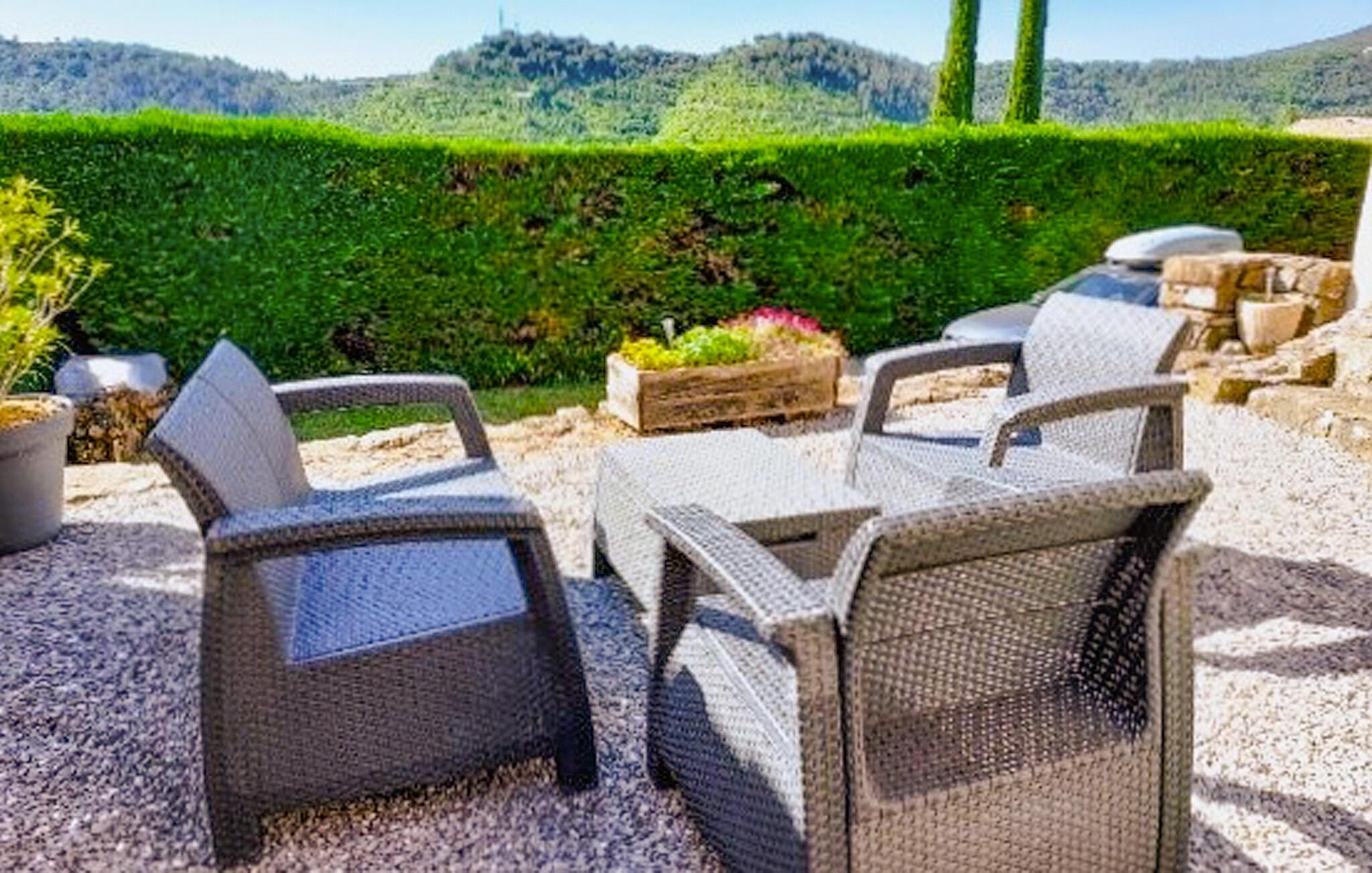 En velholdt middelhavshave venter jer udenfor. Spis morgenmad på den overdækkede terrasse, som byder på en smuk udsigt over landskabet. Snup en frisk dukkert i poolen, der er beskyttet mod udsigten, og lad den fredfyldte atmosfære sænke sig. En grill er tilgængelig til stemningsfulde aftener - ideel til at nyde milde sommernætter.