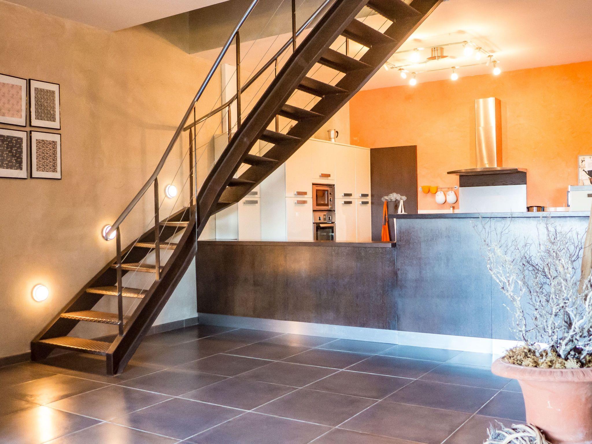 Description of mas 2. On the ground floor : large living room of nearly 100 m² with separate kitchen, dining room and lounge area. 1 king size bedroom and private bathroom with shower, bath and double sinks. 1 independent toilet. Upstairs, 1 king size bedroom, 1 twin bedroom with 2 beds 1m x 2m, 1 independant bathroom with bath, shower and double basins, 1 other twin bedroom with 2 beds 1m x 2m and bathroom private with shower, double sinks and WC. Independent toilet.