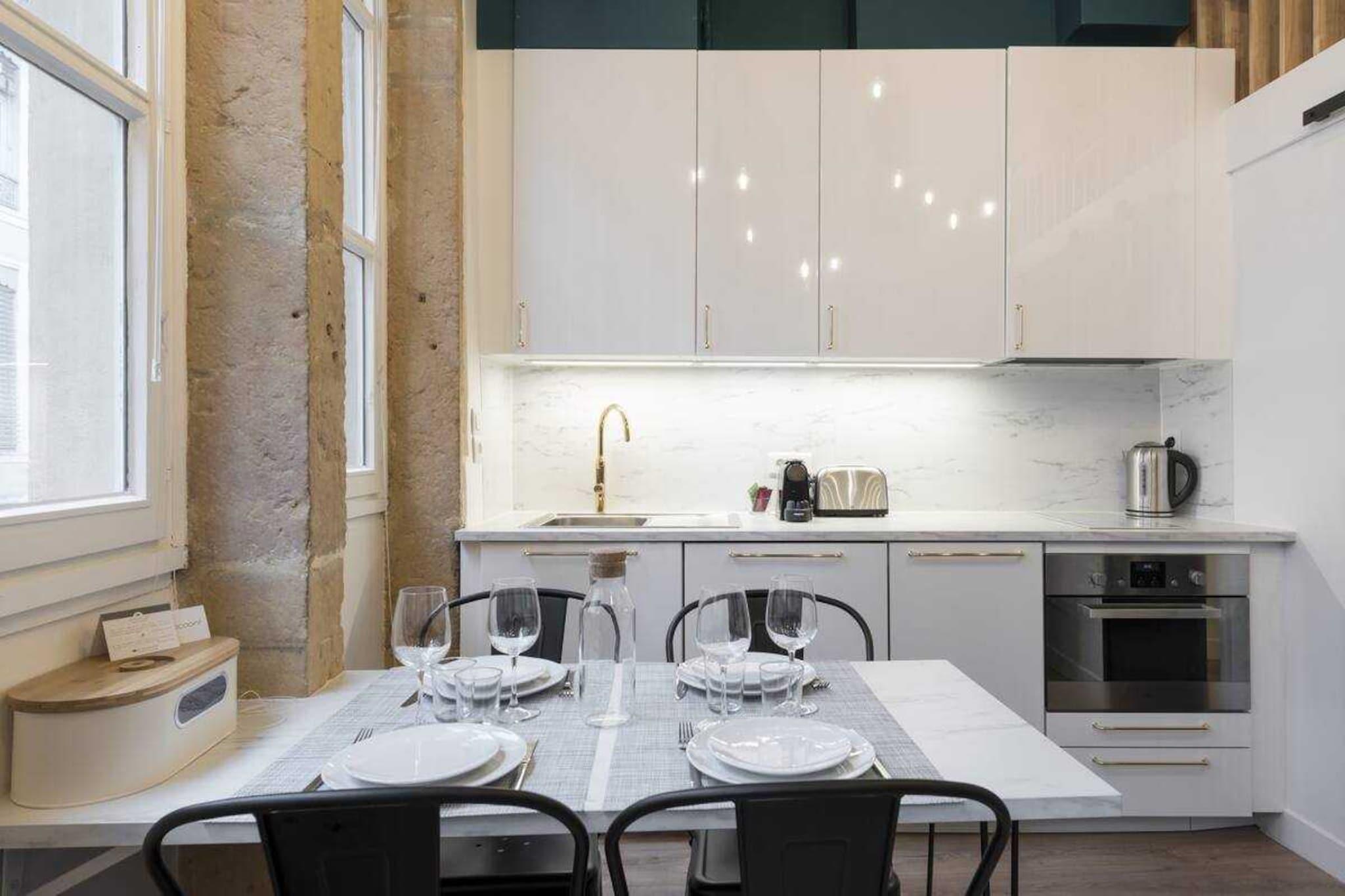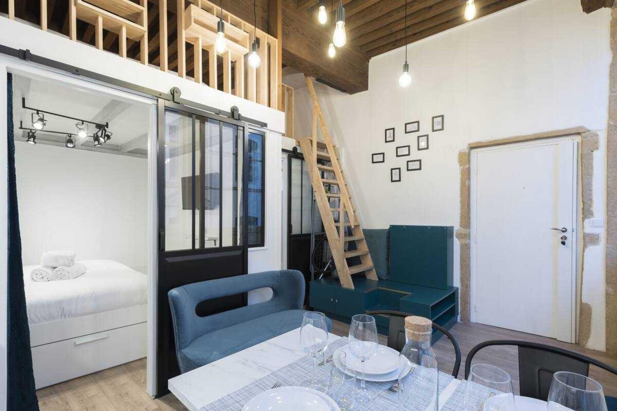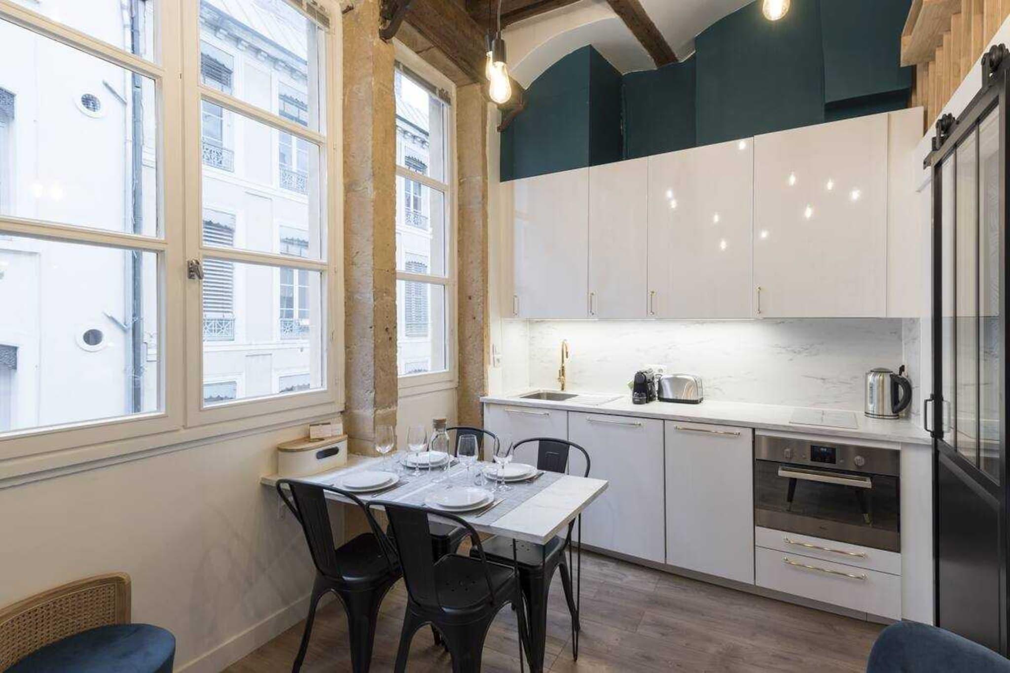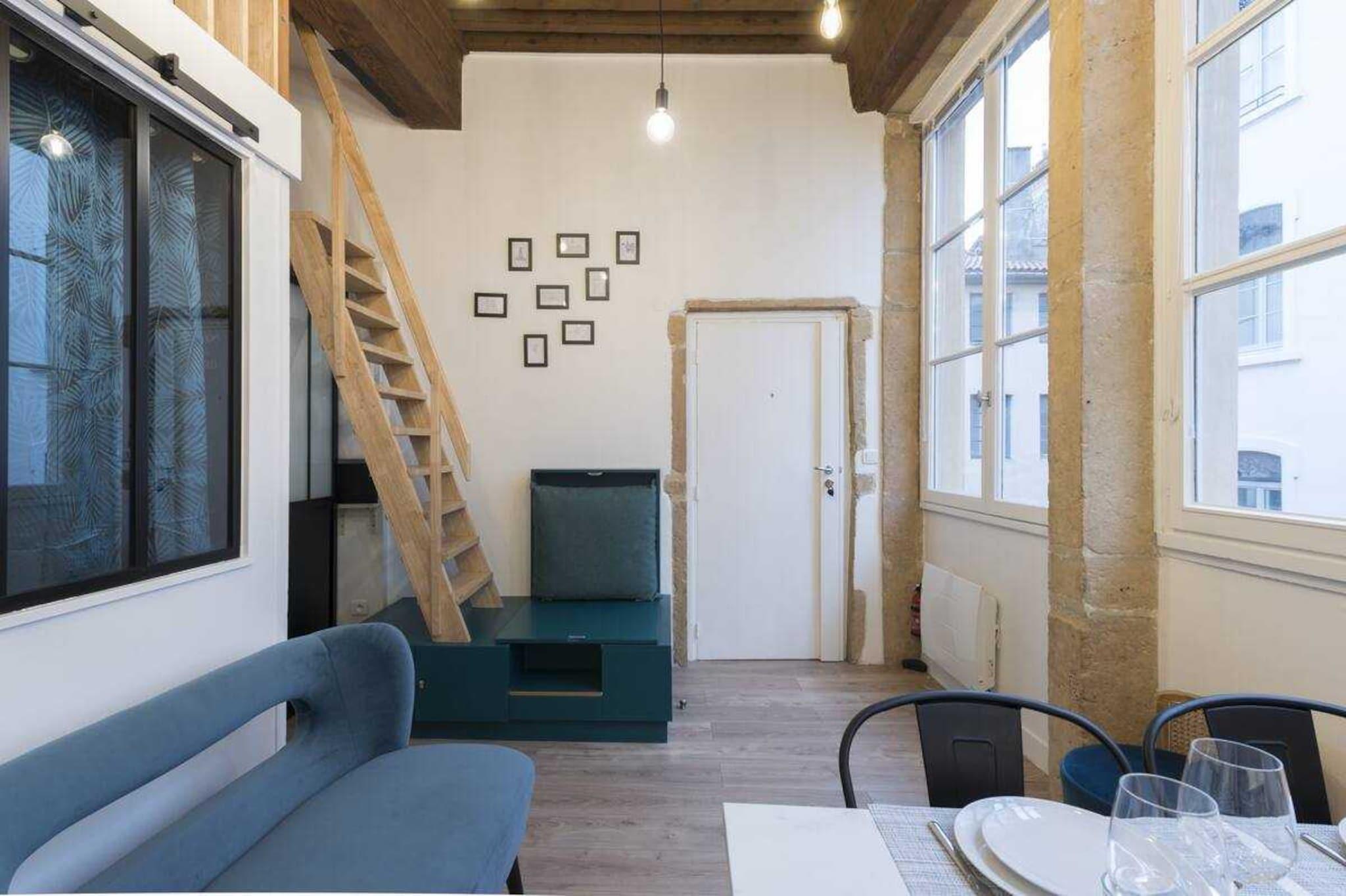 Denne moderne duplex er ideelt beliggende i hjertet af halvøen, kun få skridt fra Place des Terreaux. Nyrenoveret, er den meget veludstyret og ideel til en forretningsrejse eller et familieophold. (3 etager uden elevator) Denne 24 m² store duplex er beliggende i en gammel bygning. Den er fuldstændig renoveret og lys og består af: - En stue med et fuldt udstyret køkken til at tilberede gode Lyon-specialiteter, en spiseplads og et afslapningsområde. - Et separat soveværelse med en glasvæg for mere privatliv, med en dobbeltseng (160x200 cm) - Et badeværelse med bruser og separat toilet. - En mezzanin med en ekstra dobbeltseng (160x200 cm) Du finder også et strygejern og opbevaringsplads til din rådighed. Vi leverer lagner og håndklæder samt kaffekapsler. Lejligheden har selvfølgelig højhastigheds-WiFi. Du vil få betroet et enkelt sæt nøgler under dit ophold.