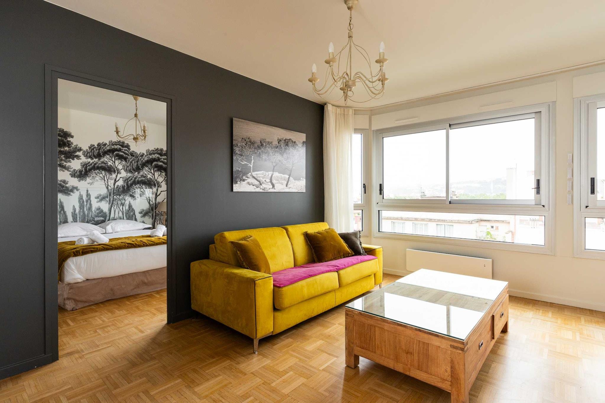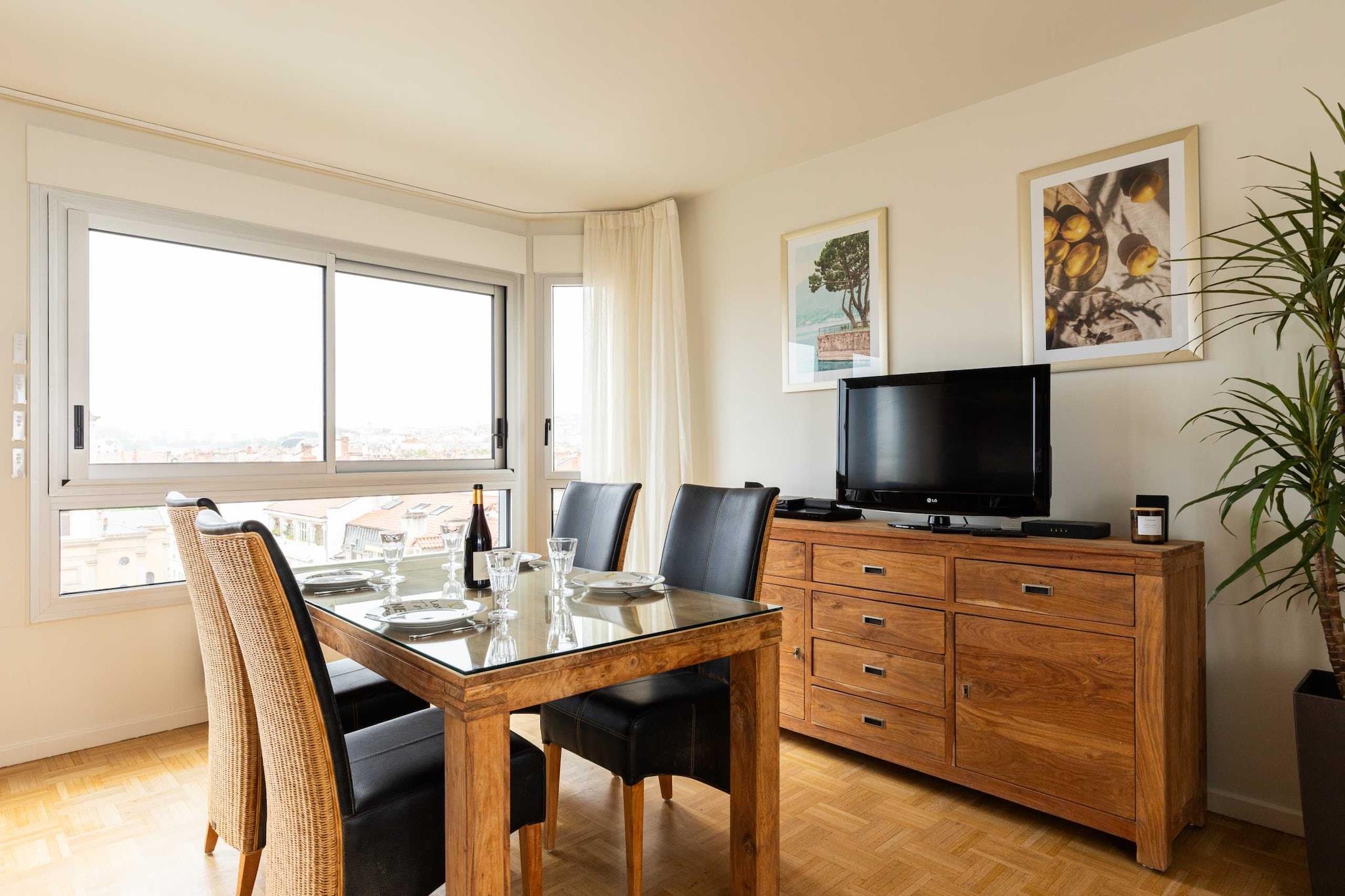 Vores smukke, lyse lejlighed er ny i moderne stil med eksklusive faciliteter. 5/10 minutters gang fra Foch metrostation (linje A). Lufthavn: ½ time med taxa og 1 time med shuttlebus (fra Gare de Lyon Part-Dieu). Hvis du ankommer i bil, er der betalte parkeringspladser lige ved siden af bygningen. Der er også Morand-parkeringspladsen: 11 Bis place marechal lyautey 69006 Lyon, som ligger 5 minutter fra lejligheden. (pris ca. EURO30/dag).