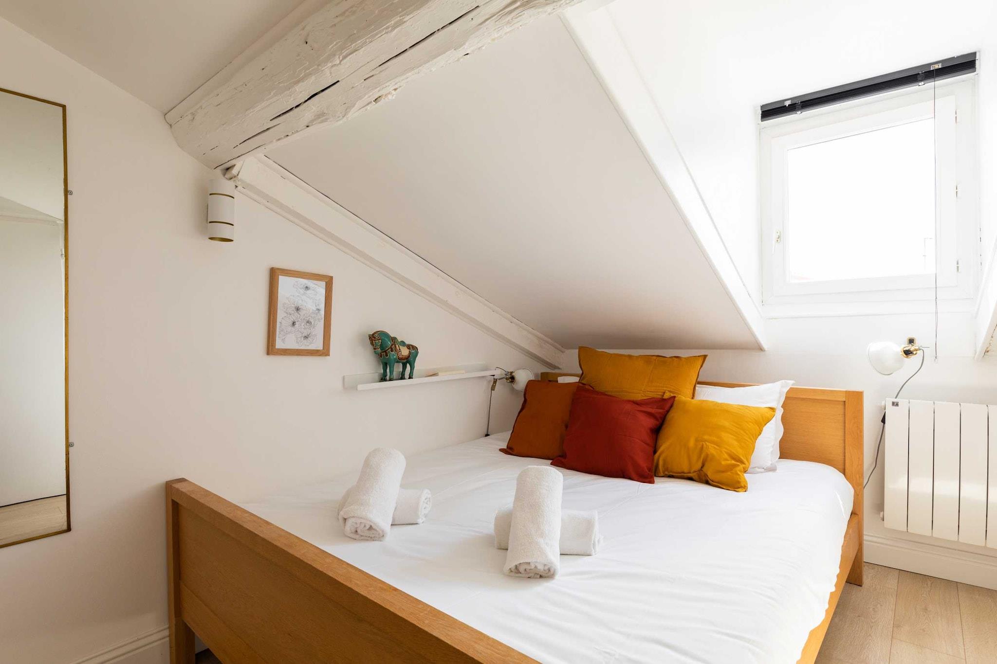 På 1. etage: (Stue(dobbeltsovesofa, Fjernsyn), Køkken(elkedel, brødrister, komfur, kaffemaskine, mikrobølgeovn, opvaskemaskine , køleskab, , , Wine glasses), soveværelse(, Queen Bed)) Loft: (badeværelse(, håndvask, toilet, vaskemaskine, føntørrer, Håndklæder inkl., , )) , , varme, barnestol, strygejern, , Carbon monoxide detector, Cleaning Disinfection, Cleaning before checkout, Enhanced cleaning practices, High touch surfaces disinfected, Long term stays allowed, Washer in common space