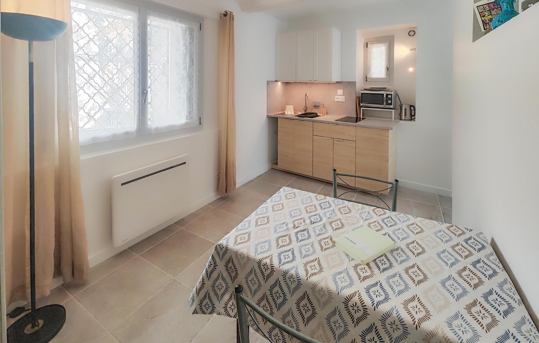 Denne ferielejlighed er oplagt til et par eller en lille gruppe venner og tilbyder fred og ro i en central beliggenhed. I bor i en smal, typisk sydfransk gyde. Lejlighedens åbne planløsning kombinerer køkken, spiseplads og sofa harmonisk. Det lille tekøkken er funktionelt udstyret. Nyd morgenmaden ved bordet foran vinduet og træk jer derefter tilbage til siddeområdet med en bog.