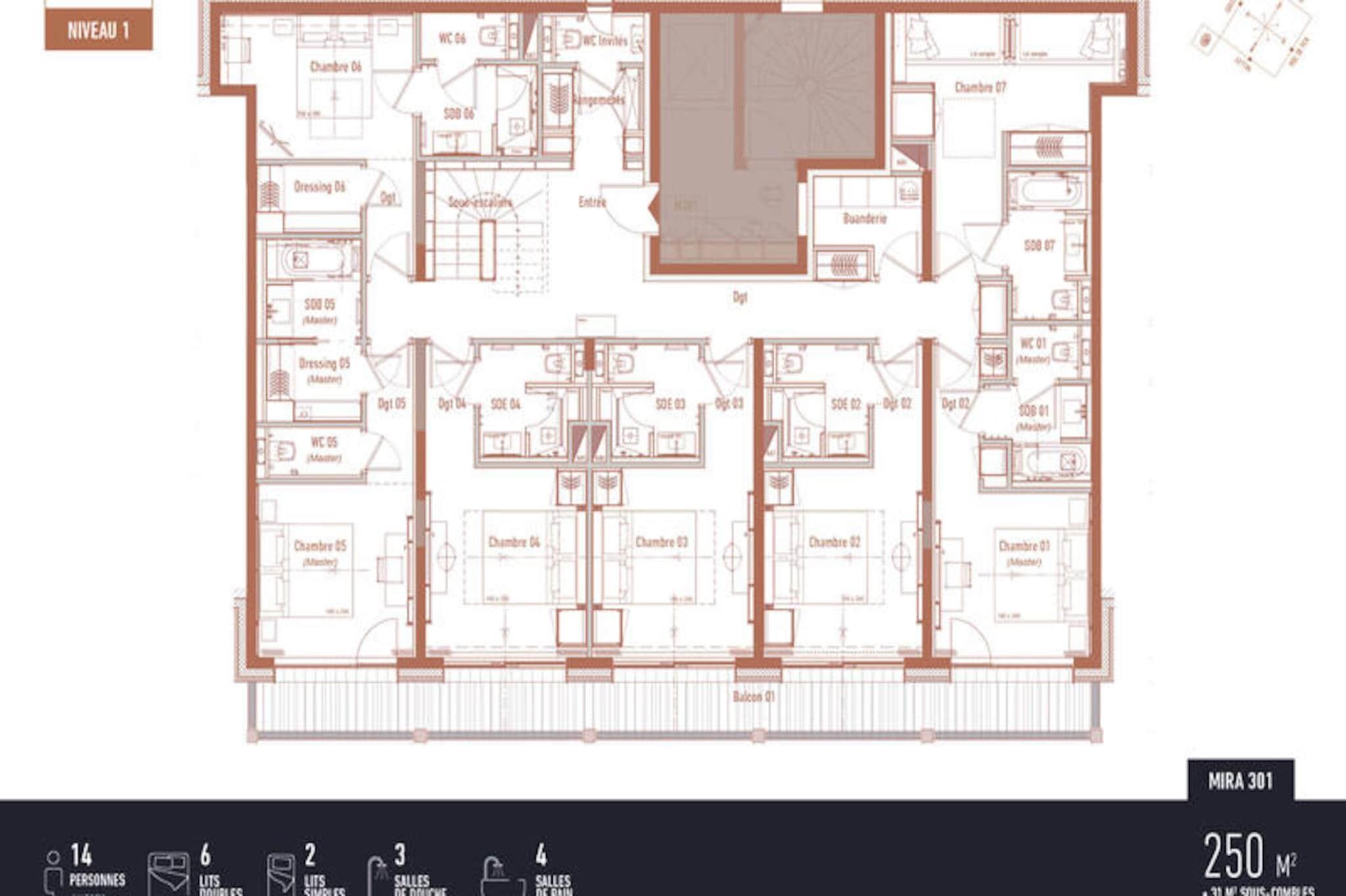 Højt over den charmerende landsby Méribel tilbyder denne luksuriøse penthouselejlighed i Antarès-residensen et uovertruffent alpint tilflugtssted. Med direkte ski-in/ski-out-adgang til de verdensberømte Les Trois Vallées begynder dit eventyr i det øjeblik, du træder udenfor. Forestil dig at vågne op til panoramaudsigt over bjergene fra din private balkon, indånde den friske alpine luft og begive dig direkte ud på de uberørte pister i verdens største skiområde. Det er her, elegance møder bekvemmelighed og skaber de perfekte rammer for en uforglemmelig ferie. Denne duplexlejlighed, der strækker sig over imponerende 270 m², har plads til op til 15 gæster fordelt på syv smukt designede soveværelser, hver med eget badeværelse. Interiøret blander moderne elegance med varme i chaletstil med luksuriøse møbler, naturlige trædetaljer og store vinduer, der oversvømmer rummet med lys. Fællesområderne er lige så indbydende og tilbyder en rummelig stue til hyggelige aftener, et fuldt udstyret køkken til gourmetmåltider og adgang til luksuriøse faciliteter såsom en indendørs pool, spa med sauna og hammam, fitnessrum og endda et dedikeret børneområde. Hver detalje er omhyggeligt udvalgt for at sikre komfort og afslapning. Området Rond-Point des Pistes er et skiløberparadis med solrige pister og nem adgang til restauranter og butikker i nærheden. Undgå morgenmylderet i Chaudanne, og nyd bekvemmeligheden med den gratis shuttle-service, der ubesværet forbinder dig med Méribels pulserende bymidte. Uanset om du udforsker pisterne, forkæler dig selv med lokalt Savoyard-køkken eller blot nyder den fredfyldte bjergatmosfære, tilbyder denne beliggenhed det bedste af det hele. Med yderligere tjenester såsom private kokke, levering af liftkort og massage i hjemmet, vil dit ophold være lige så problemfrit, som det er luksuriøst. Denne penthouselejlighed er perfekt til familier eller grupper og er mere end bare et sted at bo - det er en oplevelse at værdsætte.
