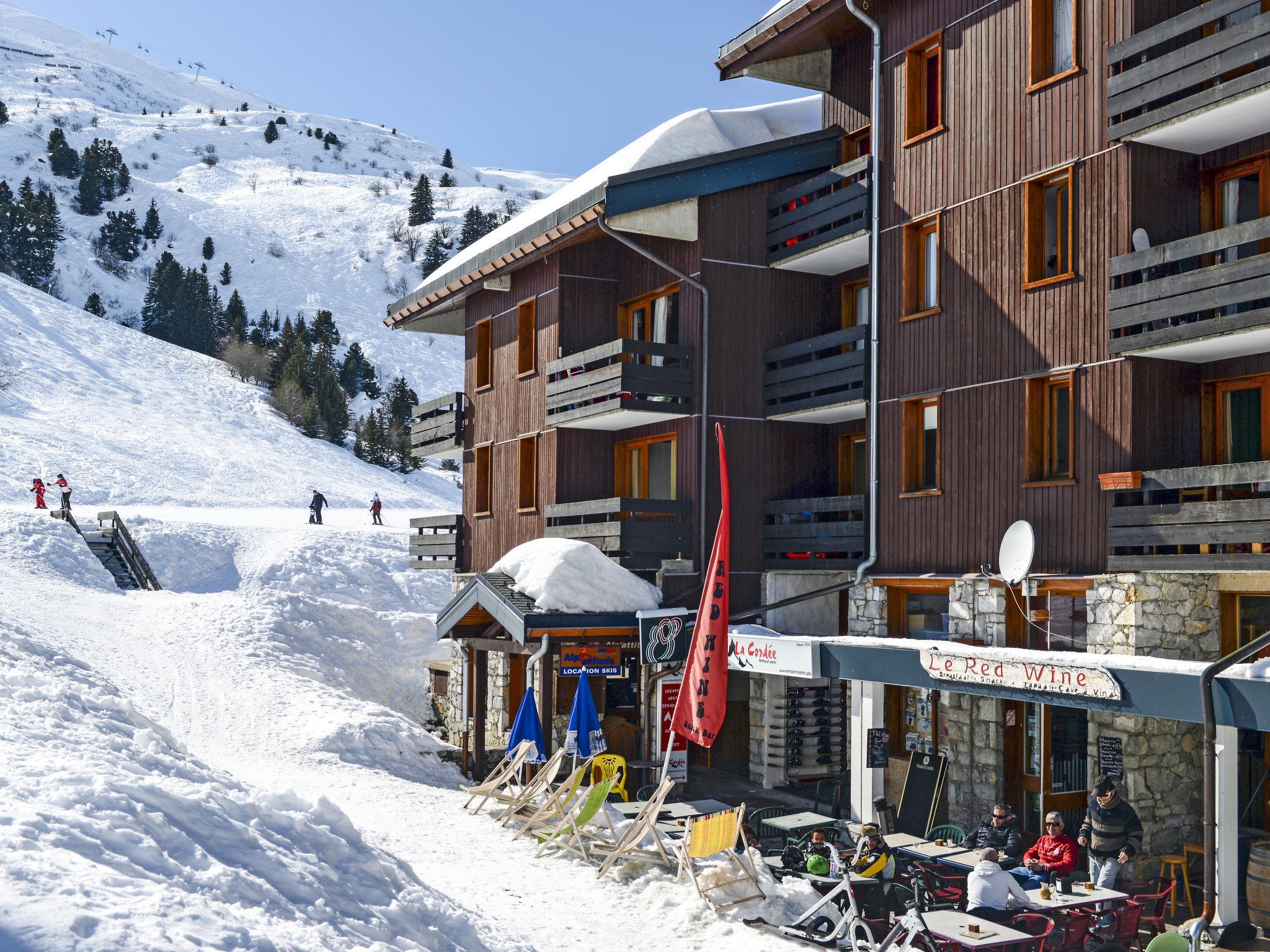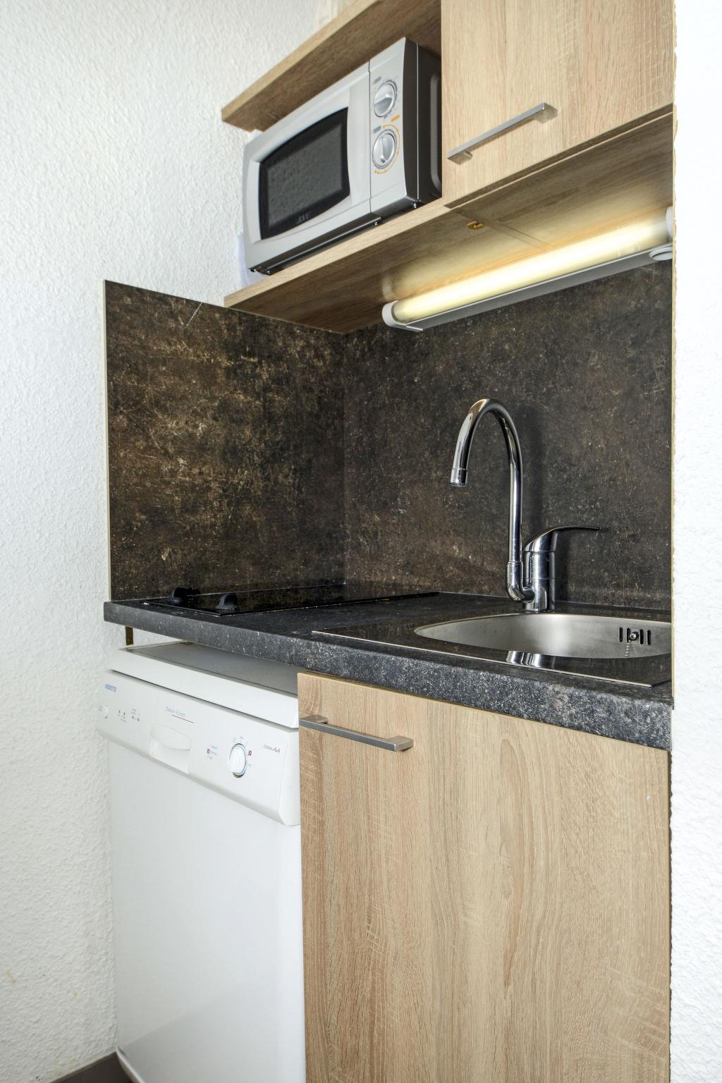 "Odalys Essentielle Le Hameau du Mottaret", 1-room apartment 27 m2. Practical furnishings: living/sleeping room with sliding door with 4 sleeping facilities, dining table and TV. Kitchenette (2 hot plates, dishwasher, kettle, microwave, electric coffee machine). Bathroom, sep. WC. Electric heating. Balcony or terrace. Maximum 1 pet/ dog allowed.
