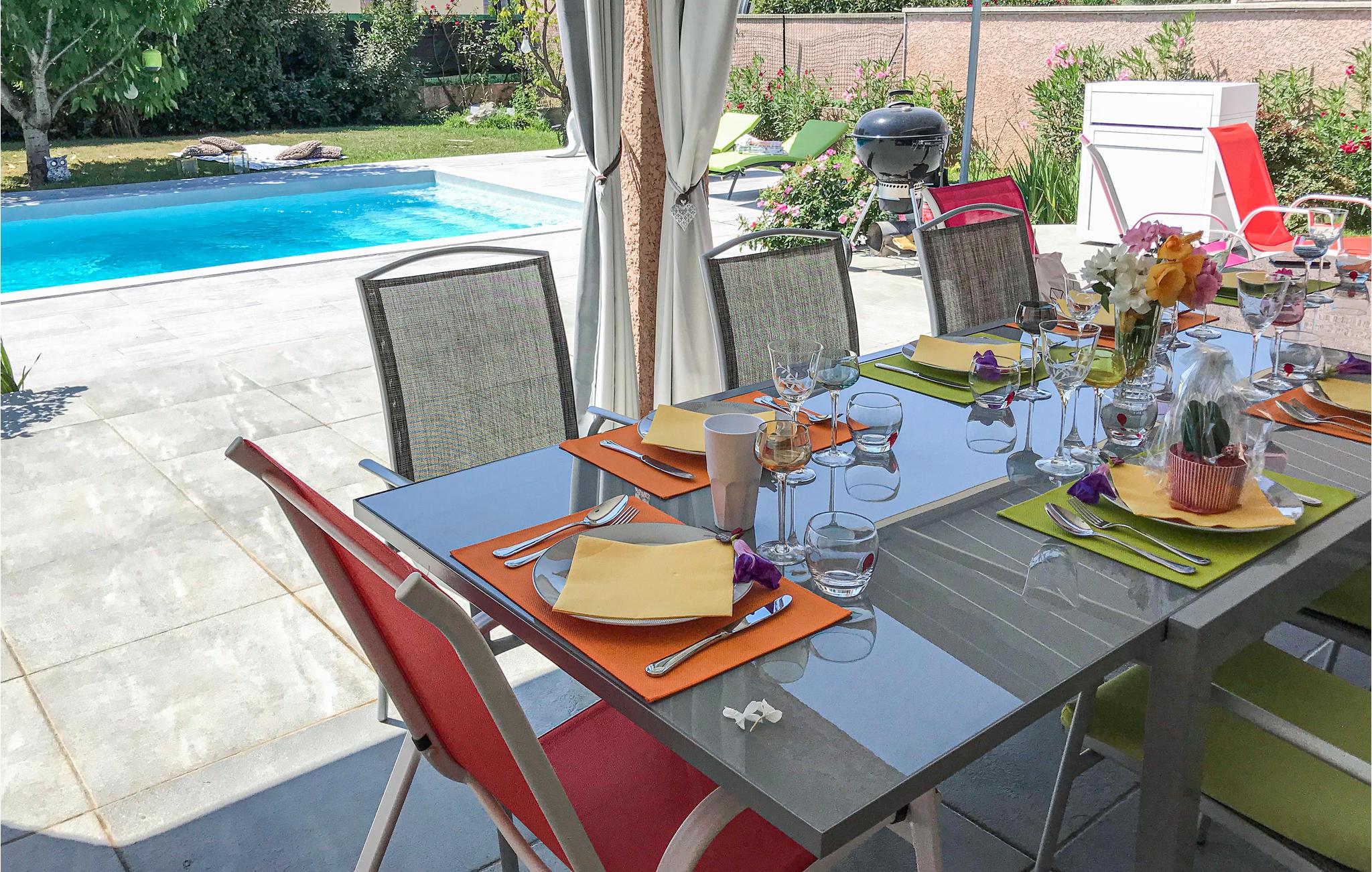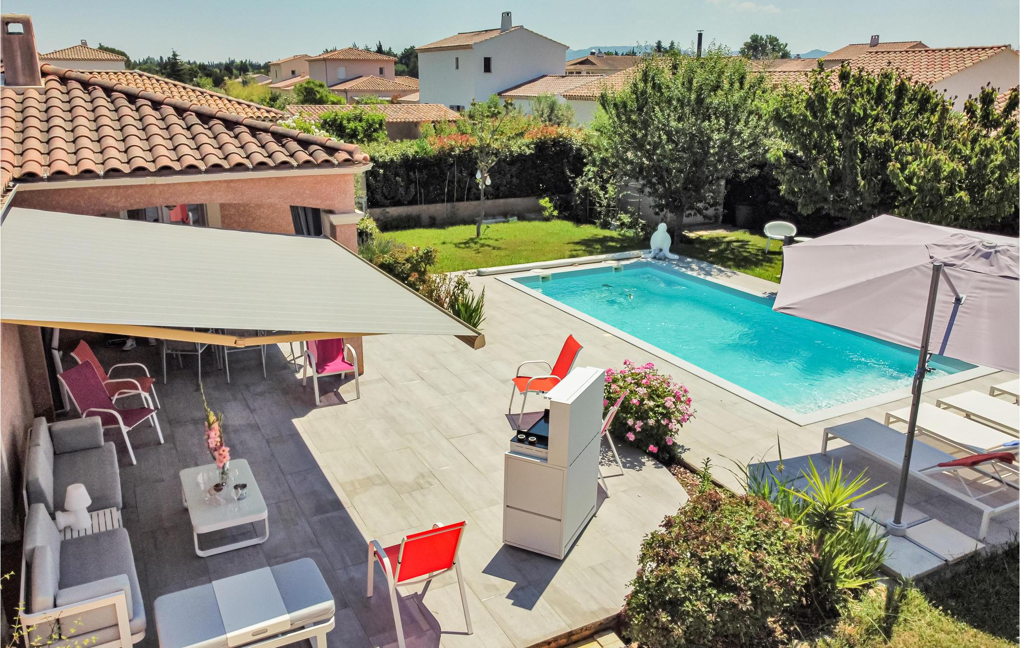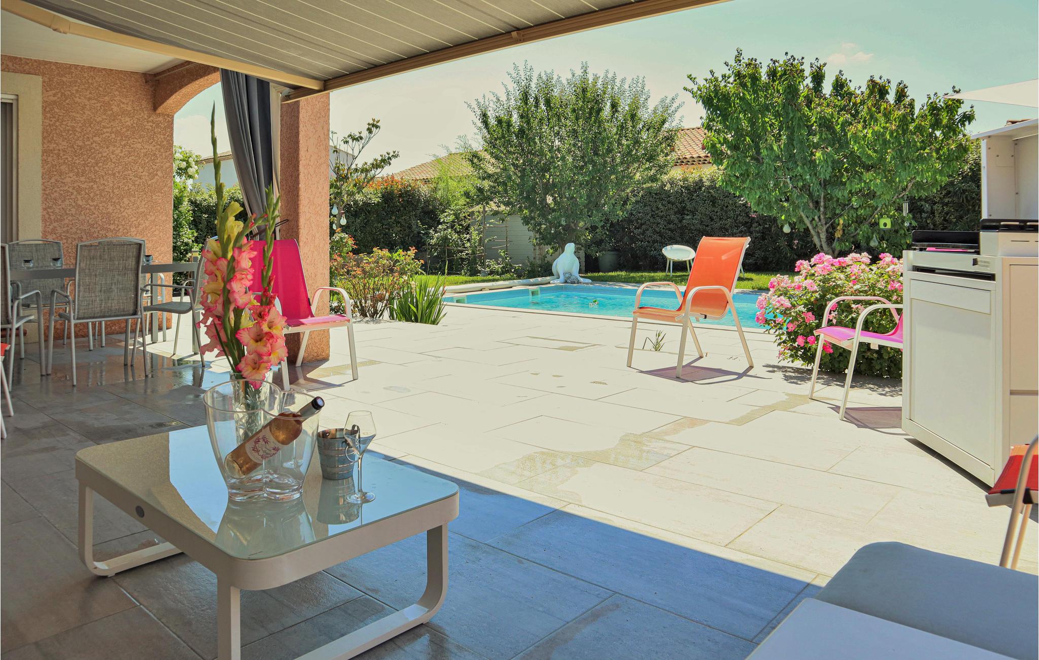 Dette komfortable feriehus med pool ligger i udkanten af ??landsbyen Mallemort i et boligområde. Huset er dekoreret i lyse farver og med smukke møbler og tilbyder plads i 3 soveværelser, 1 badeværelse, køkken-spisestue og en stue. Der er også et separat toilet. Husets hjerte er den hyggelige stue med et stort tv, hvor I kan tilbringe hyggelige aftener sammen. Der er gulvvarme i hele huset for ekstra komfort.