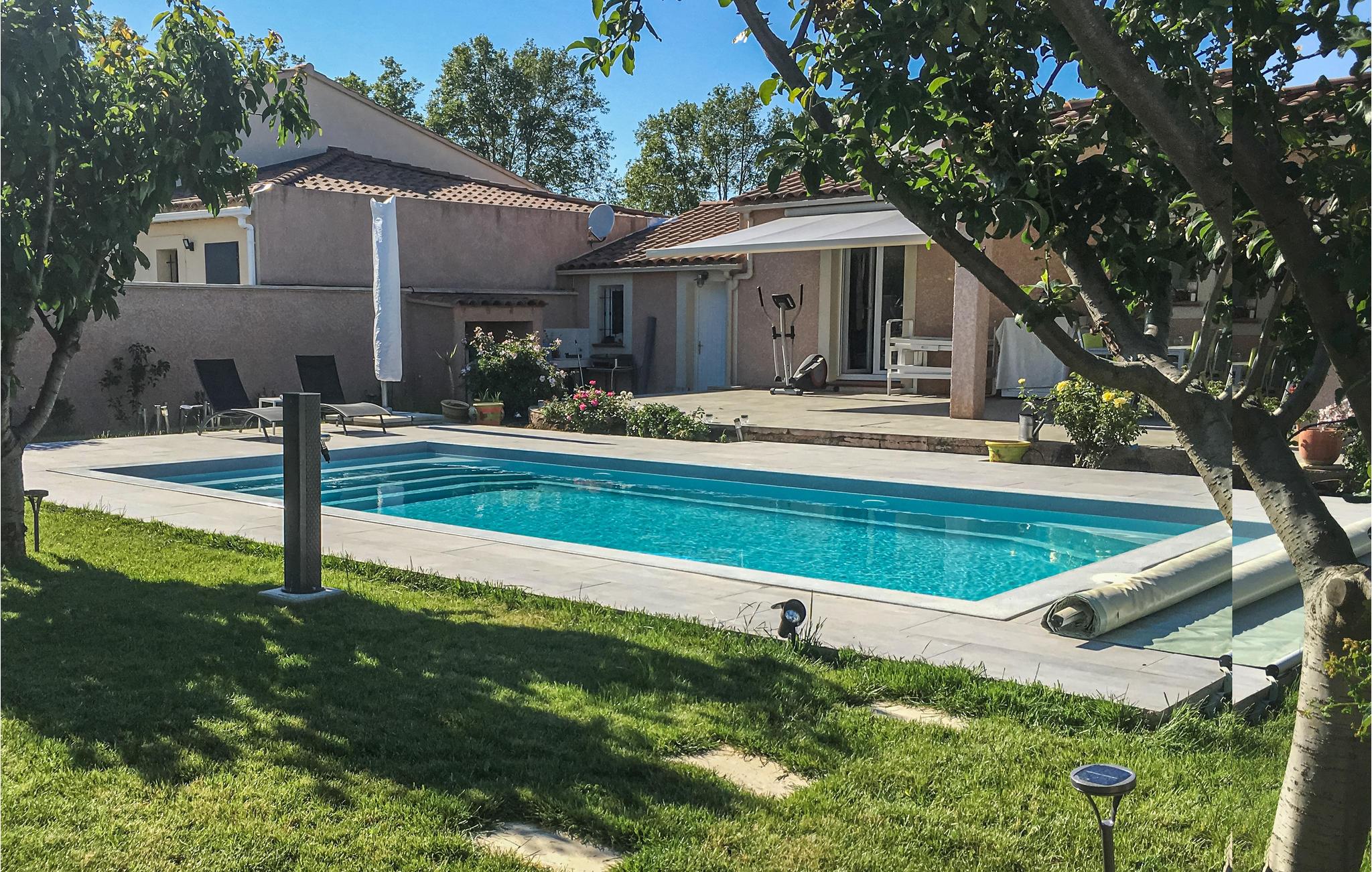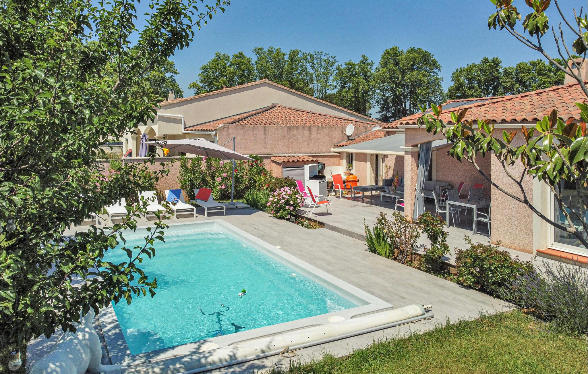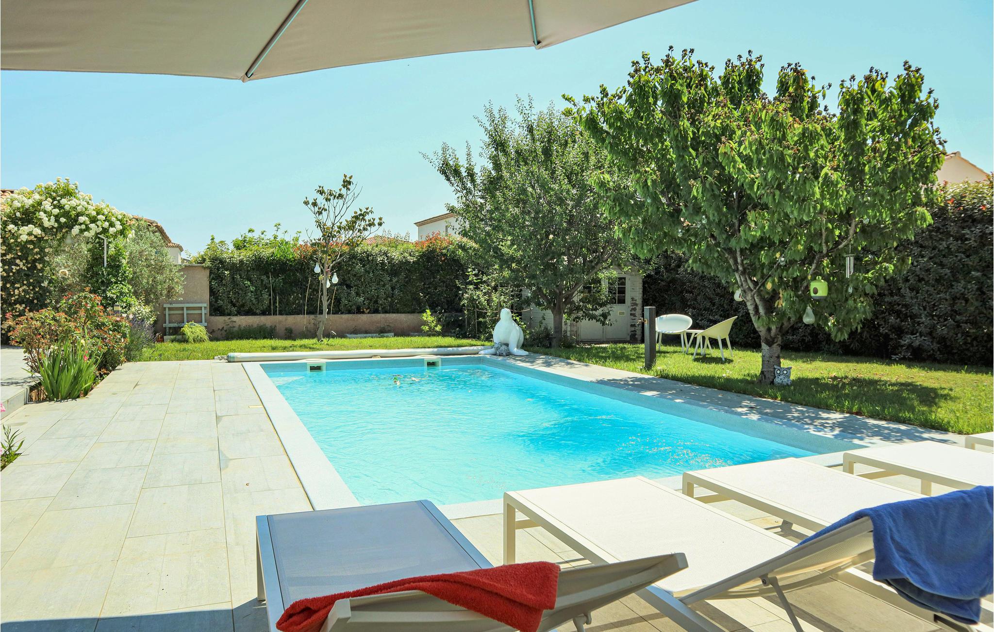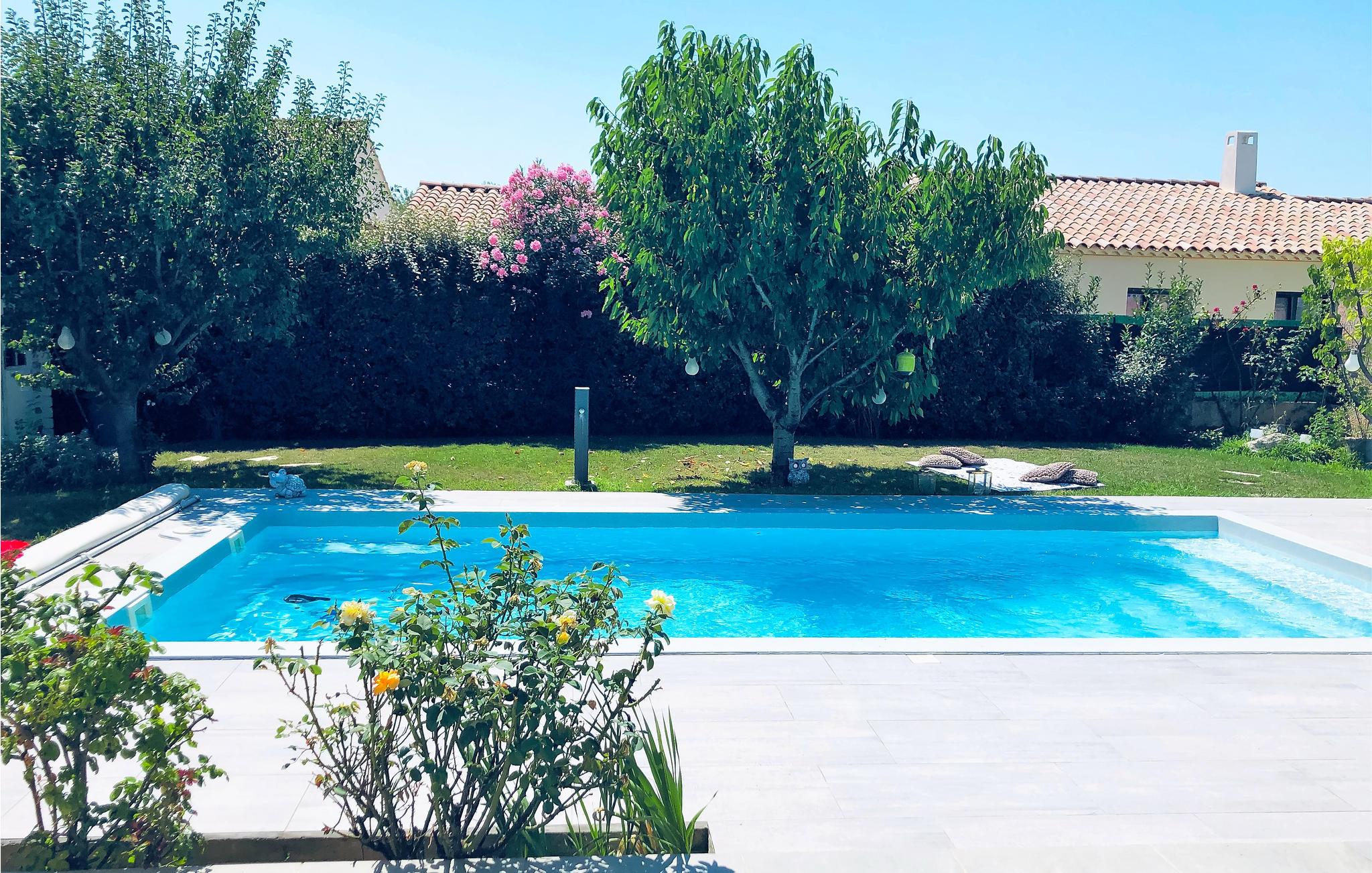 Dette komfortable feriehus med pool ligger i udkanten af ??landsbyen Mallemort i et boligområde. Huset er dekoreret i lyse farver og med smukke møbler og tilbyder plads i 3 soveværelser, 1 badeværelse, køkken-spisestue og en stue. Der er også et separat toilet. Husets hjerte er den hyggelige stue med et stort tv, hvor I kan tilbringe hyggelige aftener sammen. Der er gulvvarme i hele huset for ekstra komfort.