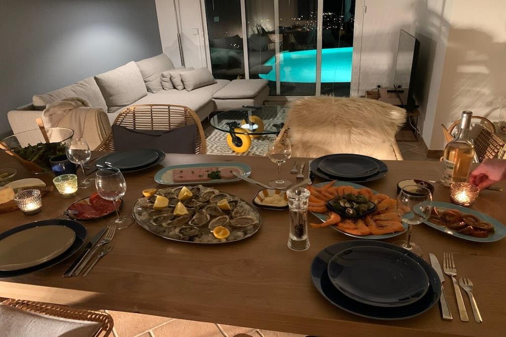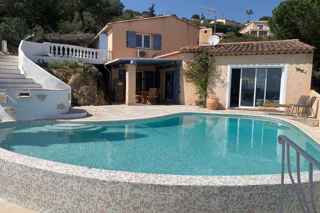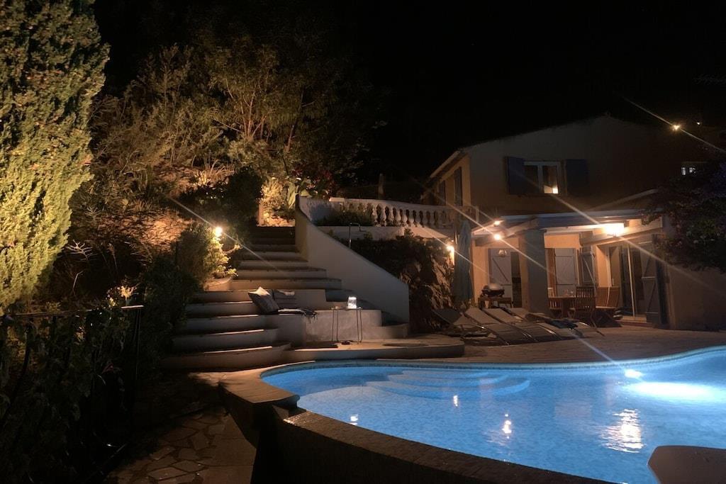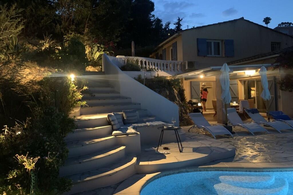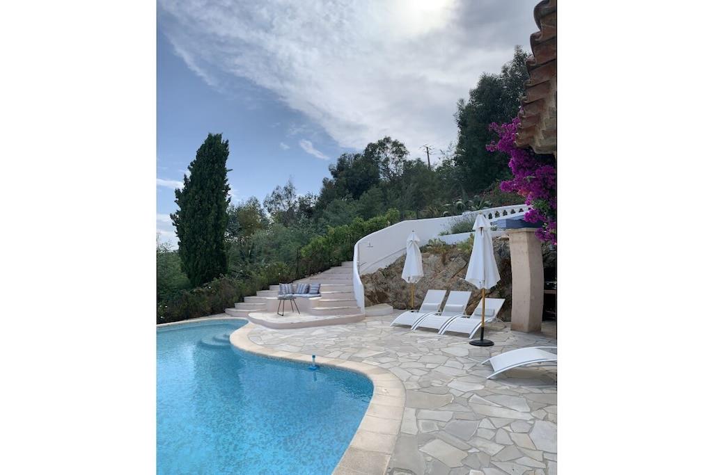 Villa La Roche er en absolut perle på Frankrigs sydkyst, lige i nærheden af Cannes. Uanset om du slapper af i stuen, nyder franske delikatesser i den indendørs eller udendørs spiseplads, eller slapper af på den øverste terrasse, vil dit blik altid være trukket mod infinity-poolen og den smukke udsigt over havet og Cannes-bugten. Det rummelige hus er ideelt til en stor familie, to par og deres børn, eller en generationsrejse med bedstemor og bedstefar. Huset er perfekt beliggende i bakkerne i Mandelieu-La Napoule. Det er fem minutters kørsel eller 15 minutters gang fra landsbyen Capitou, hvor du kan købe din baguette fra bageriet, nyde en dejlig frokost eller middag på Bistro Joseph, eller blot købe et par nødvendige varer i supermarkedet eller på apoteket. Yderligere fem minutters kørsel, og du er på stranden, hvor du kan vælge mellem et stort udvalg af restauranter nær stranden eller lige på stranden. Du har et stort udvalg af højdepunkter i nærheden, herunder St. Tropez, Monaco, Cannes og Nice. Alternativt kan du bare slappe af i huset, svømme, læse eller bare se din Netflix-serie på smart-tv'et. Der er også smukke vandreture oven for huset i skoven/naturreservatet.