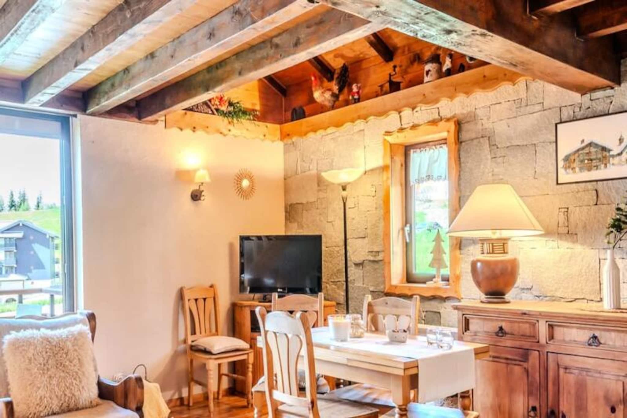 Vågn op til de franske alpers fredfyldte skønhed i denne charmerende 39 m² store duplex, hvor bjergene byder dig velkommen hver morgen. Beliggende direkte på Manigods skråninger kombinerer dette hyggelige tilflugtssted rustik charme med moderne komfort og tilbyder en idyllisk tilflugtssted for familier eller små grupper. Med sine sten- og trædetaljer udstråler lejligheden den varme atmosfære af en traditionel hytte, perfekt til at skabe uforglemmelige alpine minder. Uanset om du er her for de snedækkede skråninger om vinteren eller de frodige vandrestier om sommeren, tilbyder denne ejendom en port til naturens vidundere. Duplexen er omhyggeligt designet for at maksimere komfort og funktionalitet. Det 26 m² store opholdsrum har en hyggelig sovesofa, en lænestol, en spiseplads og et fuldt udstyret køkken, perfekt til at tilberede solide måltider efter en dag med eventyr. Ovenpå finder du et hyggeligt soveværelse på loftet med en dobbeltseng og en hems med to enkeltsenge, hvilket gør det ideelt til op til fire gæster. Et badeværelse med badekar og et separat toilet sikrer bekvemmelighed, mens den lille balkon tilbyder en fantastisk udsigt over bjergene, perfekt til en stille morgenkaffe eller en aften med afslapning. Gratis Wi-Fi og parkering gør dit ophold endnu nemmere, og sengetøj kan lejes for ekstra bekvemmelighed. Denne duplex-lejlighed ligger i Merdassier-området og tilbyder ski-in/ski-out-adgang om vinteren, der forbinder dig med det vidtstrakte La Clusaz-resort. Om sommeren inviterer stierne, der starter lige fra ejendommen, dig til at udforske det betagende alpine landskab til fods eller på cykel. Familier vil sætte pris på den nærliggende skiskole for børn fra to år og opefter, samt de sæsonåbne butikker, restauranter og Sherpa-supermarked inden for gåafstand. Med nem adgang til Annecy, Genève og Lyon og et væld af aktiviteter lige fra paragliding til hundeslædekørsel er denne ejendom den perfekte base for eventyr året rundt. Uanset om du søger spændende udendørsaktiviteter eller fredelige øjeblikke omgivet af natur, lover dette alpine paradis et ophold fyldt med glæde og opdagelser.