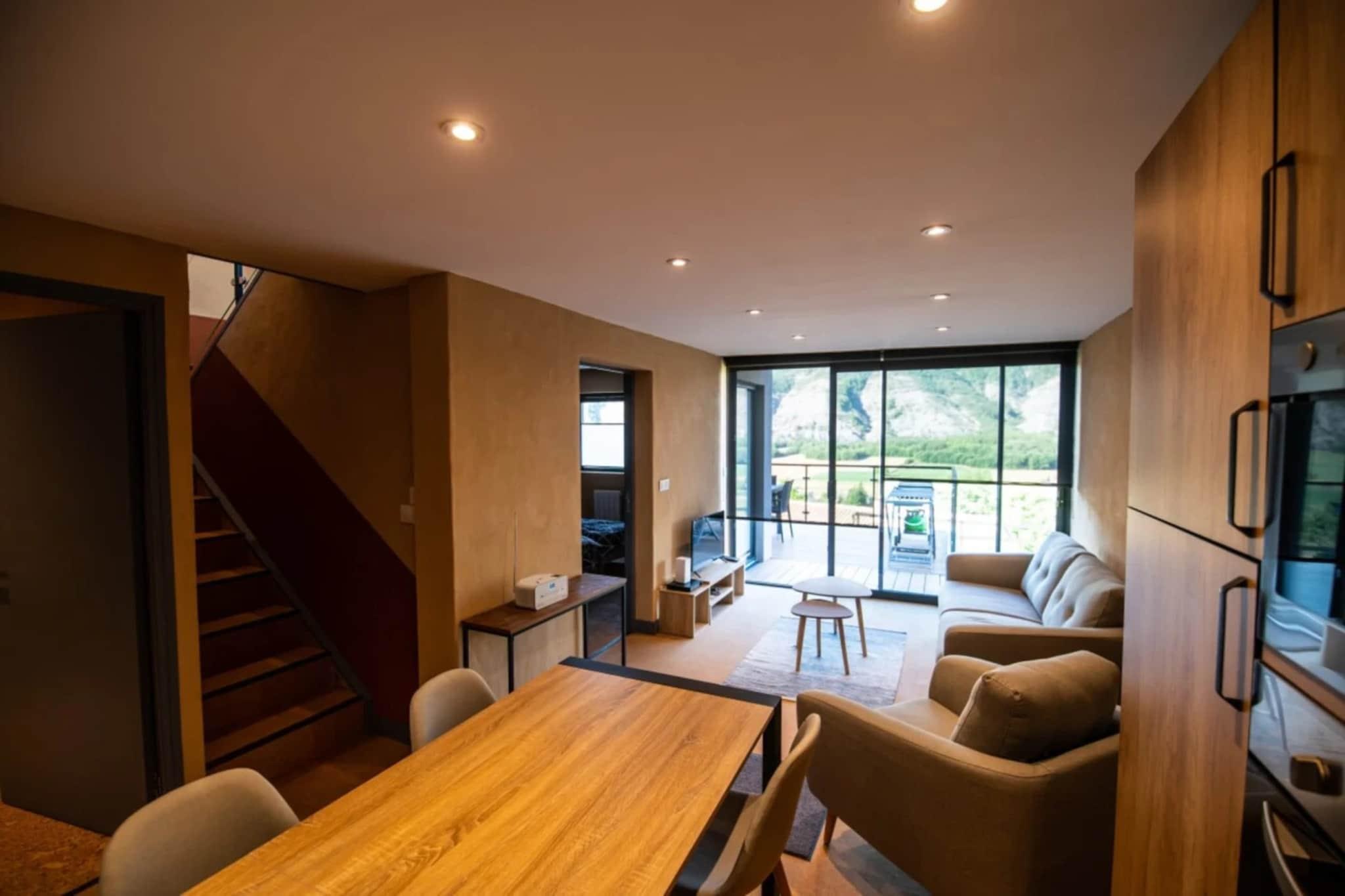Gemt væk i den fredfyldte landsby La Barre-des-Dourbes inviterer dette bioklimatiske sommerhus med to soveværelser dig til at sætte farten ned og genoprette forbindelsen til naturen. Det er lavet af træ, ler og kork og føles levende – det ånder med landskabet omkring det. Den åbne stue flyder ubesværet ud til en bred terrasse, hvor duften af fyrretræ og hvisken af bjergvinde hilser dig velkommen hver morgen. Fra solopgangskaffe til solnedgangsvine bliver panoramaudsigten over Durance-dalen din daglige baggrund. Indenfor møder moderne komfort naturlig enkelhed. To hyggelige soveværelser og to badeværelser sikrer privatliv for familier eller venner, mens det fuldt udstyrede køkken og den rummelige spiseplads gør fælles måltider til en fornøjelse. Ovenpå tilbyder en tagterrasse et intimt sted at kigge på stjernerne eller slappe af under åben himmel. Udenfor venter en fælles pool – men med privat terrasse på begge sider kan du nyde en fredelig svømmetur uden nogensinde at føle dig overfyldt. Hvert hjørne af dette miljøvenlige tilflugtssted er designet til at berolige dine sanser og ære miljøet. Træd ud over din dørtrin, og Provence afslører sine vidundere. Gå en tur ad lavendelduftende stier, udforsk de charmerende markedsgader i Digne-les-Bains, kun 15 minutter væk, eller tag afsted på en dag med eventyr i den UNESCO-listede geopark Haute-Provence. Vandre til betagende udsigtspunkter, cykl ad stille bjergveje, eller nyd regionens berømte termiske bade. Uanset om du søger rolig refleksion, kreativ inspiration eller spænding i det fri, tilbyder dette sommerhus en perfekt blanding af natur, komfort og opdagelser - en autentisk flugt, hvor tiden blidt går ned i tempo.