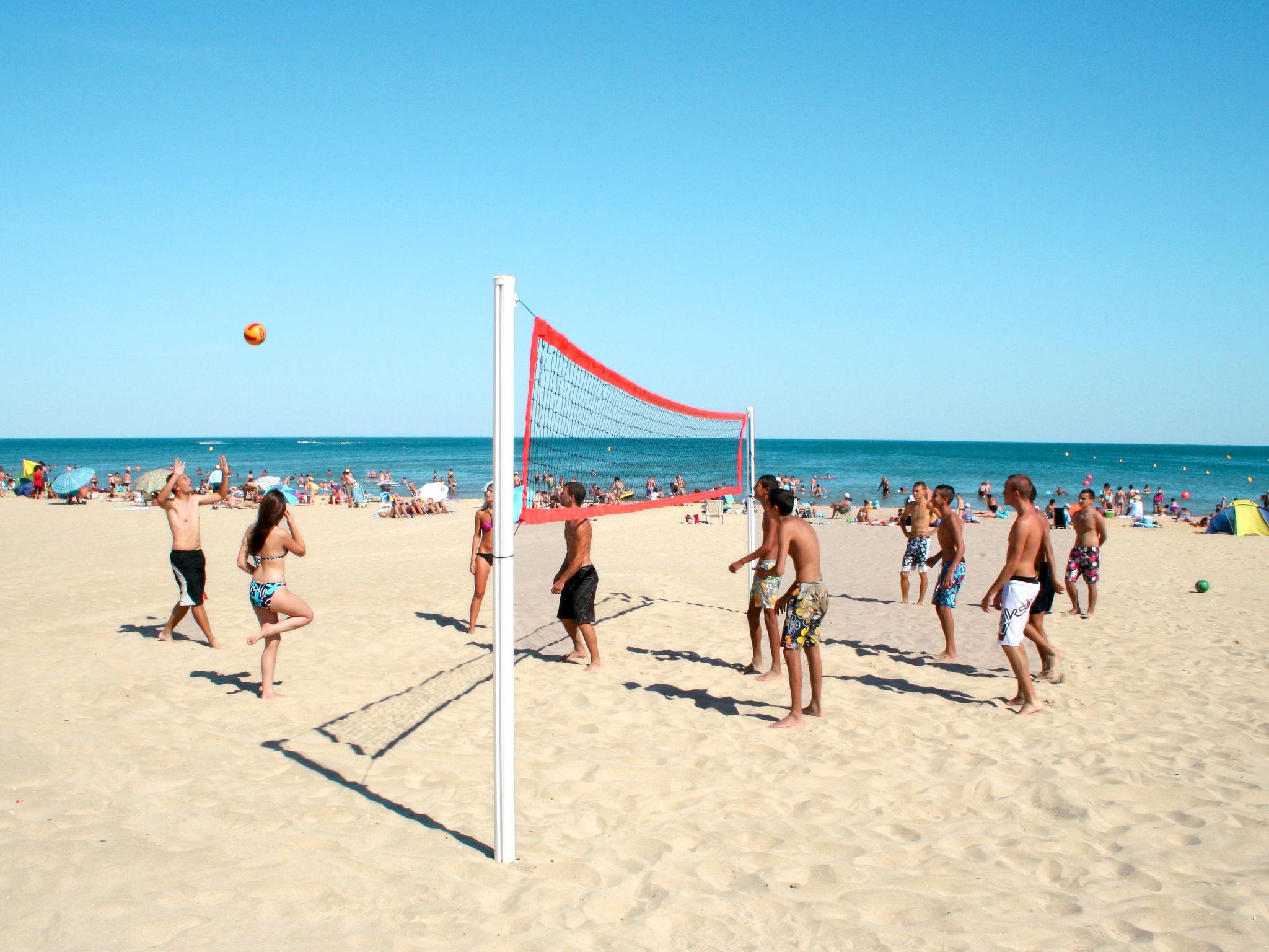 Child friendly resort "La Grenadine", 2 storeys, built in 2013. 90 houses in the residence. 1.8 km from the centre of Marseillan-Plage, on the outskirts, 8 km from the centre of Cap d'Agde, 32 km from the centre of Béziers, 200 m from the sea. For shared use: property (fenced), swimming pool heated (16 x 8 m, seasonal availability: 01.Apr. - 15.Oct.). WC in the pool area, children's pool, outdoor shower, table tennis, boccia, children's playground. In the complex: reception, bar, bistro, sauna (extra). Fitness room, steam room (extra). Washing machine, tumble dryer (for shared use, extra). Bread roll service. Stepped path (3 steps) to the house. Parking. Shop 1.8 km, supermarket 7 km, bus stop "Le canal" 130 m, sandy beach 200 m. Marina 1 km. Please note: car-free holiday complex. Suitable for families. The photograph shows a typical example. The holiday properties may differ in living space, floorplan, equipment and furnishing.