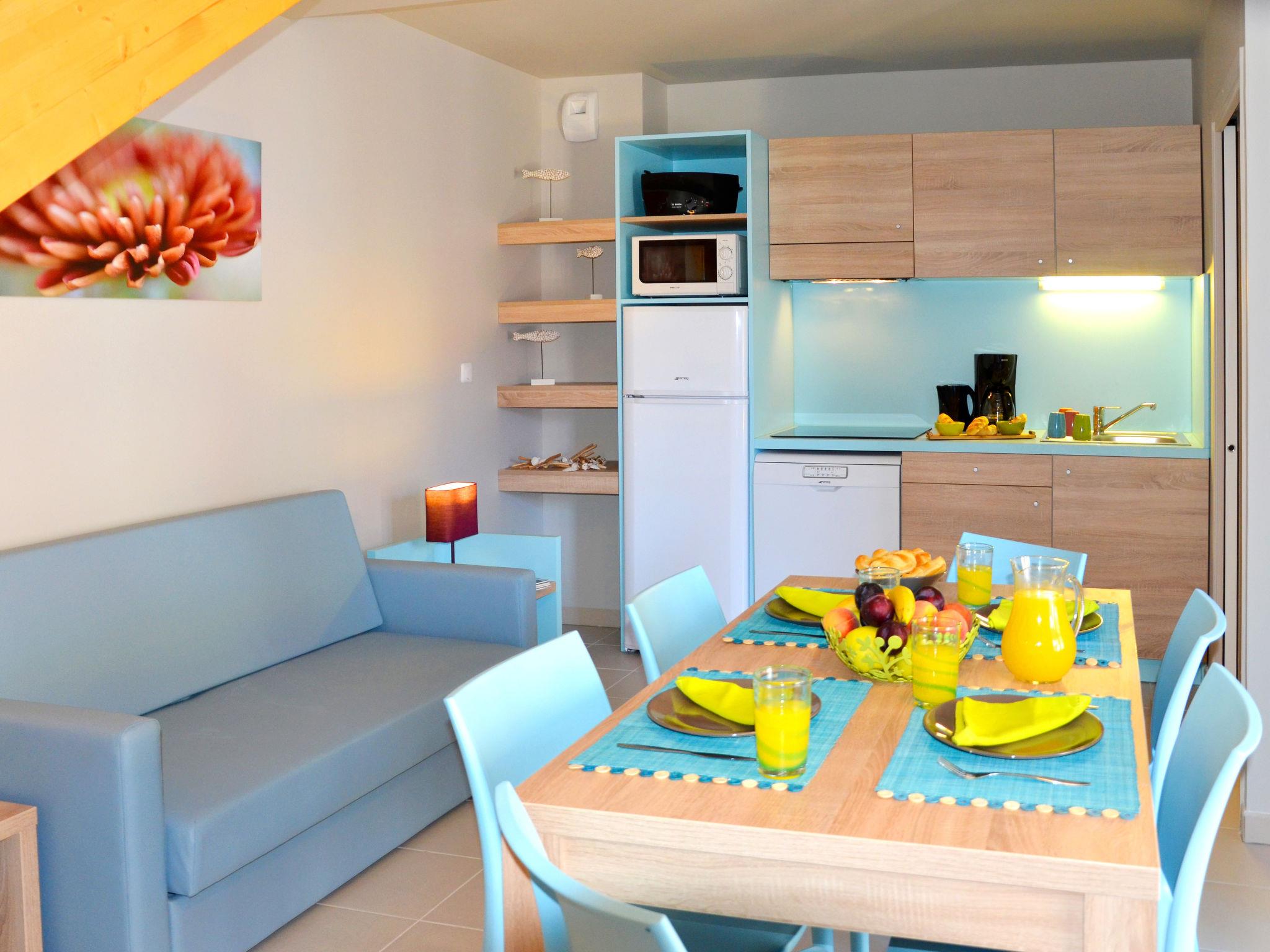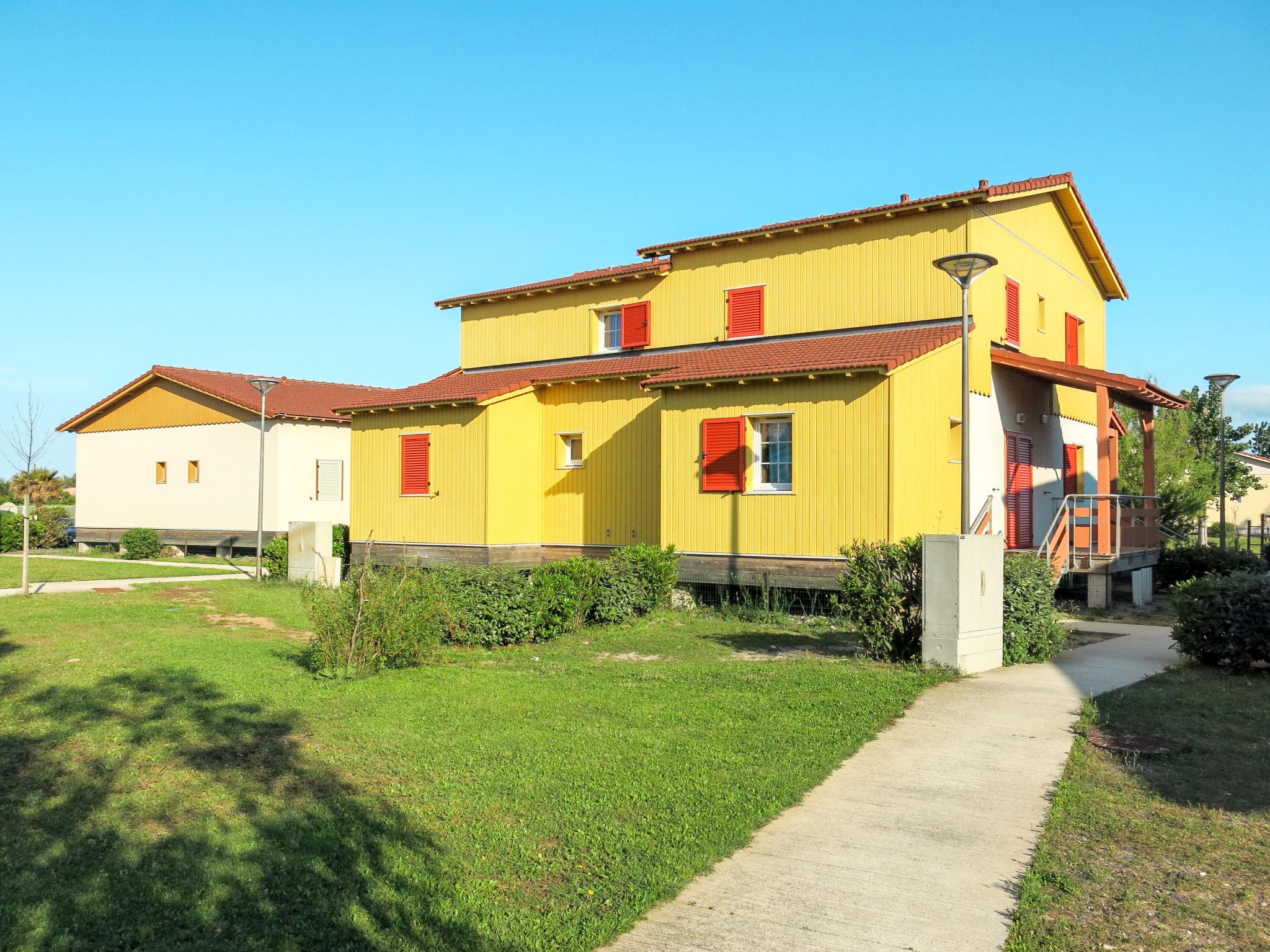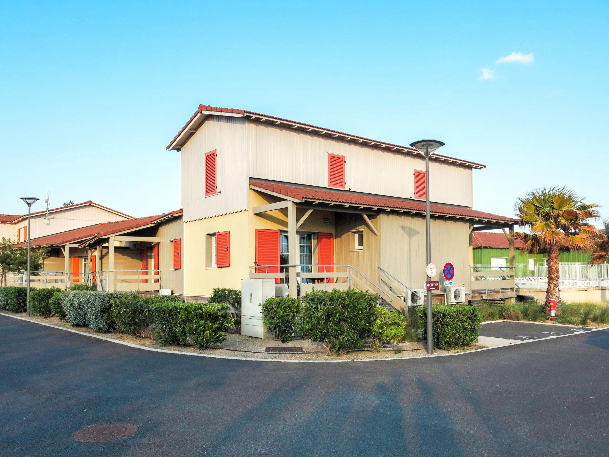 Child friendly resort "La Grenadine", 2 storeys, built in 2013. 90 houses in the residence. 1.8 km from the centre of Marseillan-Plage, on the outskirts, 8 km from the centre of Cap d'Agde, 32 km from the centre of Béziers, 200 m from the sea. For shared use: property (fenced), swimming pool heated (16 x 8 m, seasonal availability: 01.Apr. - 15.Oct.). WC in the pool area, children's pool, outdoor shower, table tennis, boccia, children's playground. In the complex: reception, bar, bistro, sauna (extra). Fitness room, steam room (extra). Washing machine, tumble dryer (for shared use, extra). Bread roll service. Stepped path (3 steps) to the house. Parking. Shop 1.8 km, supermarket 7 km, bus stop "Le canal" 130 m, sandy beach 200 m. Marina 1 km. Please note: car-free holiday complex. Suitable for families. The photograph shows a typical example. The holiday properties may differ in living space, floorplan, equipment and furnishing.