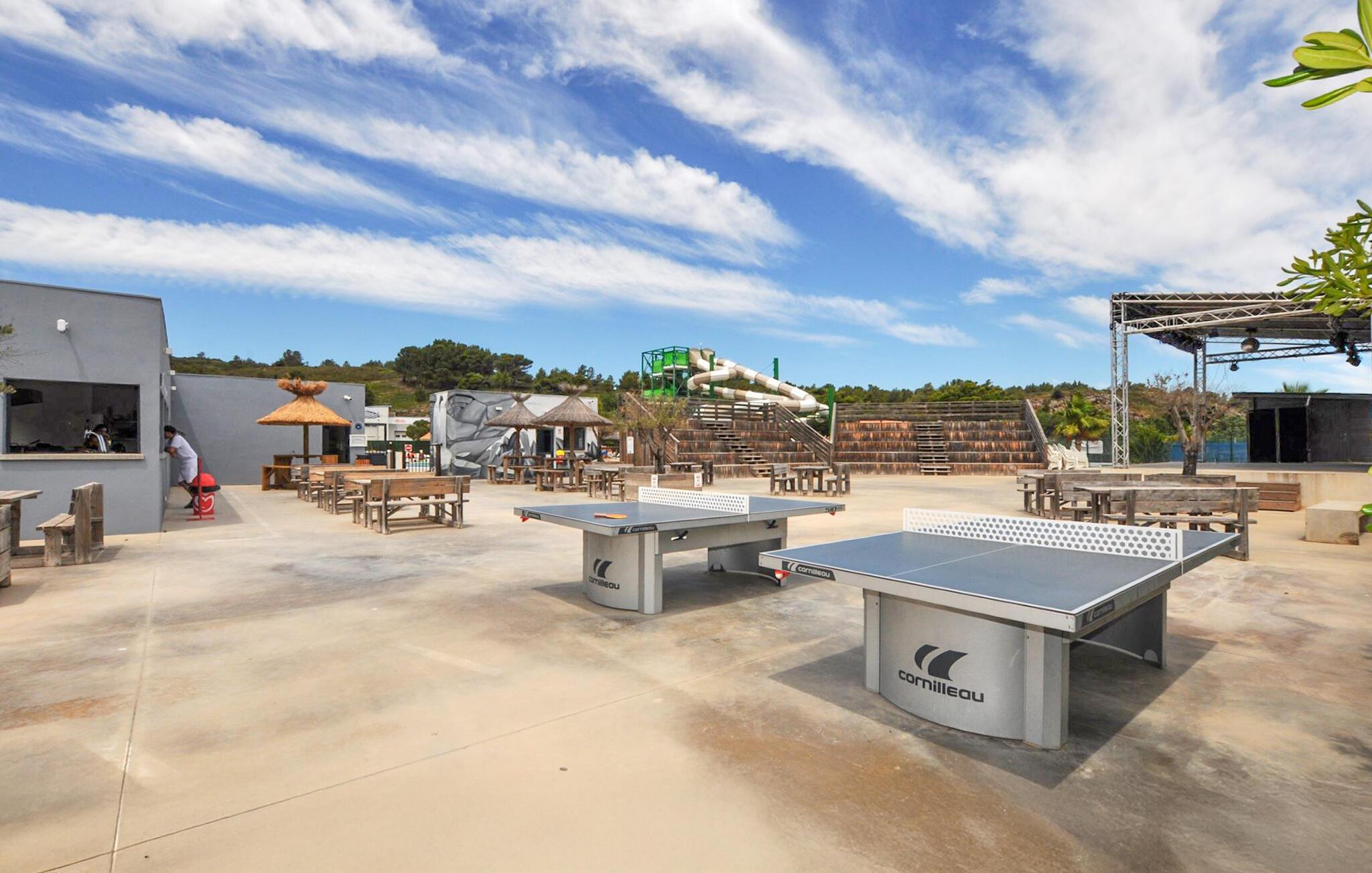 Dette hyggelige tilflugtssted er en del af en temapark og tilbyder jer og familien adgang til dejlige udendørs rekreative muligheder. Planlæg jeres aktiviteter over afslappede måltider, og efter en aktiv dag kan I slå jer ned i den behagelige sofa, spille et brætspil eller fordybe jer i jeres ferielæsning.