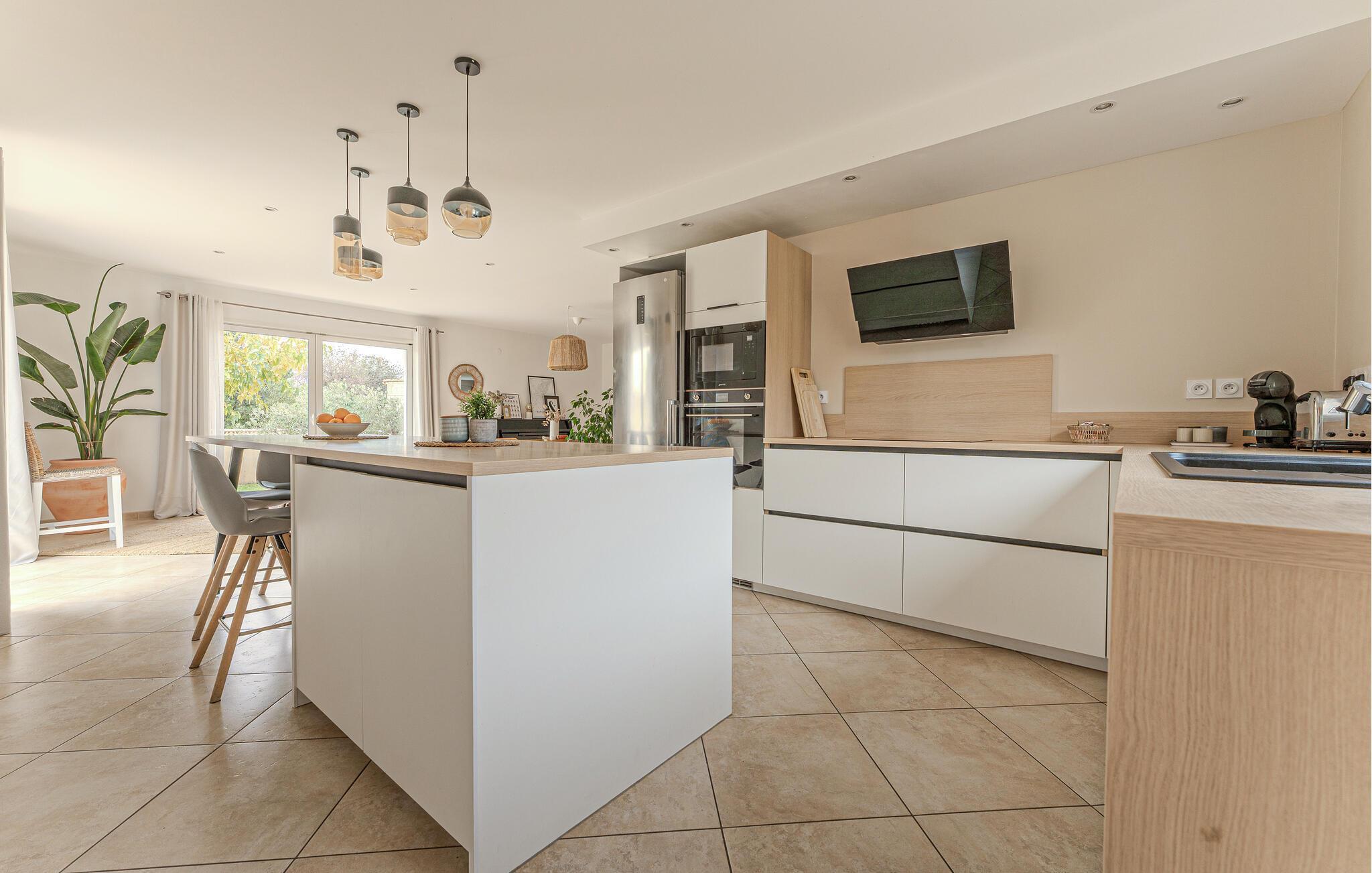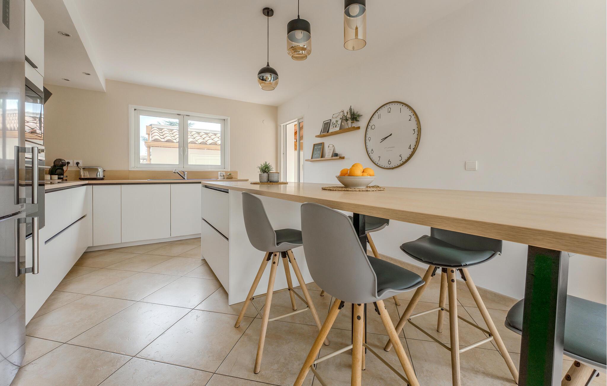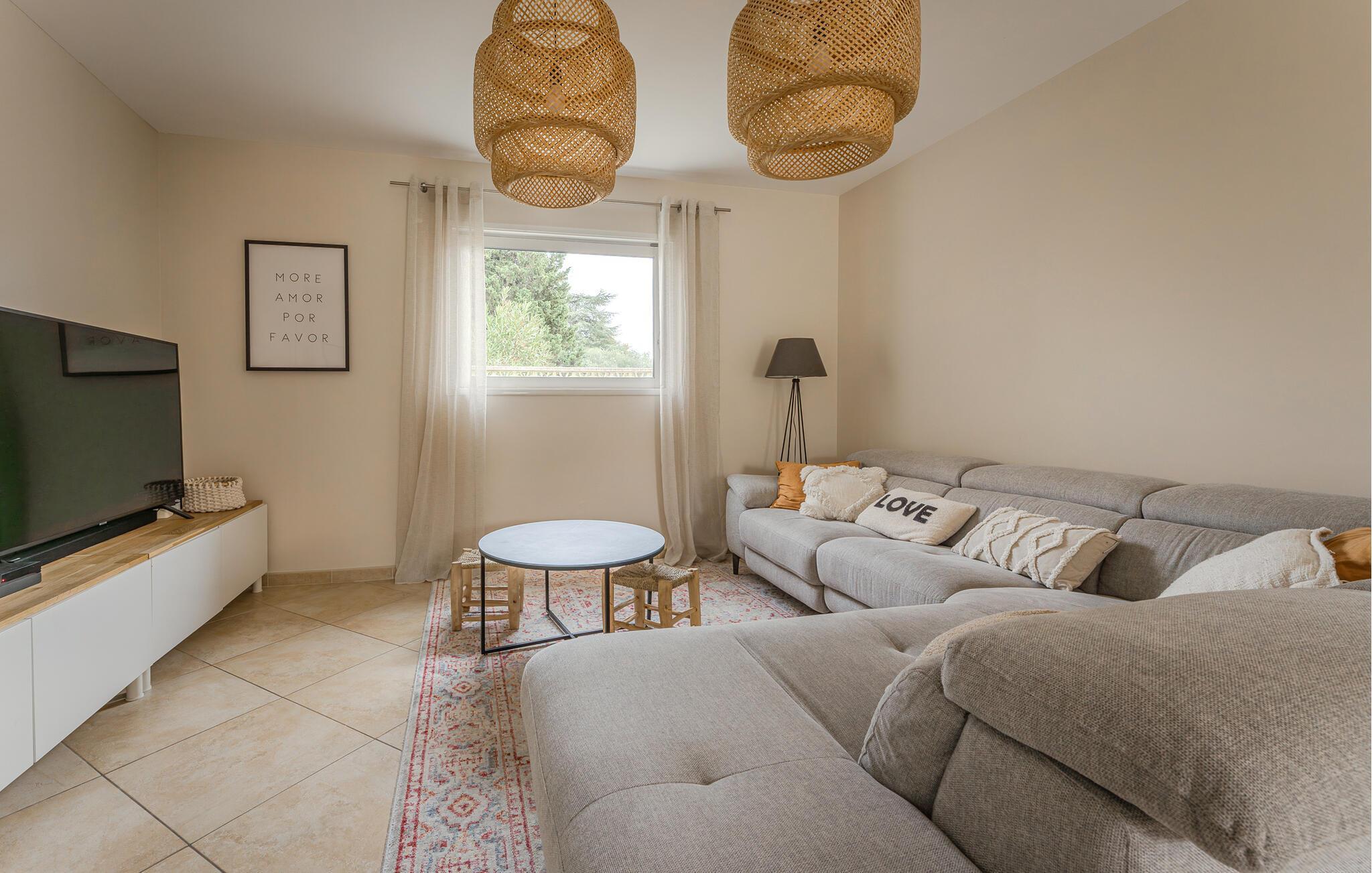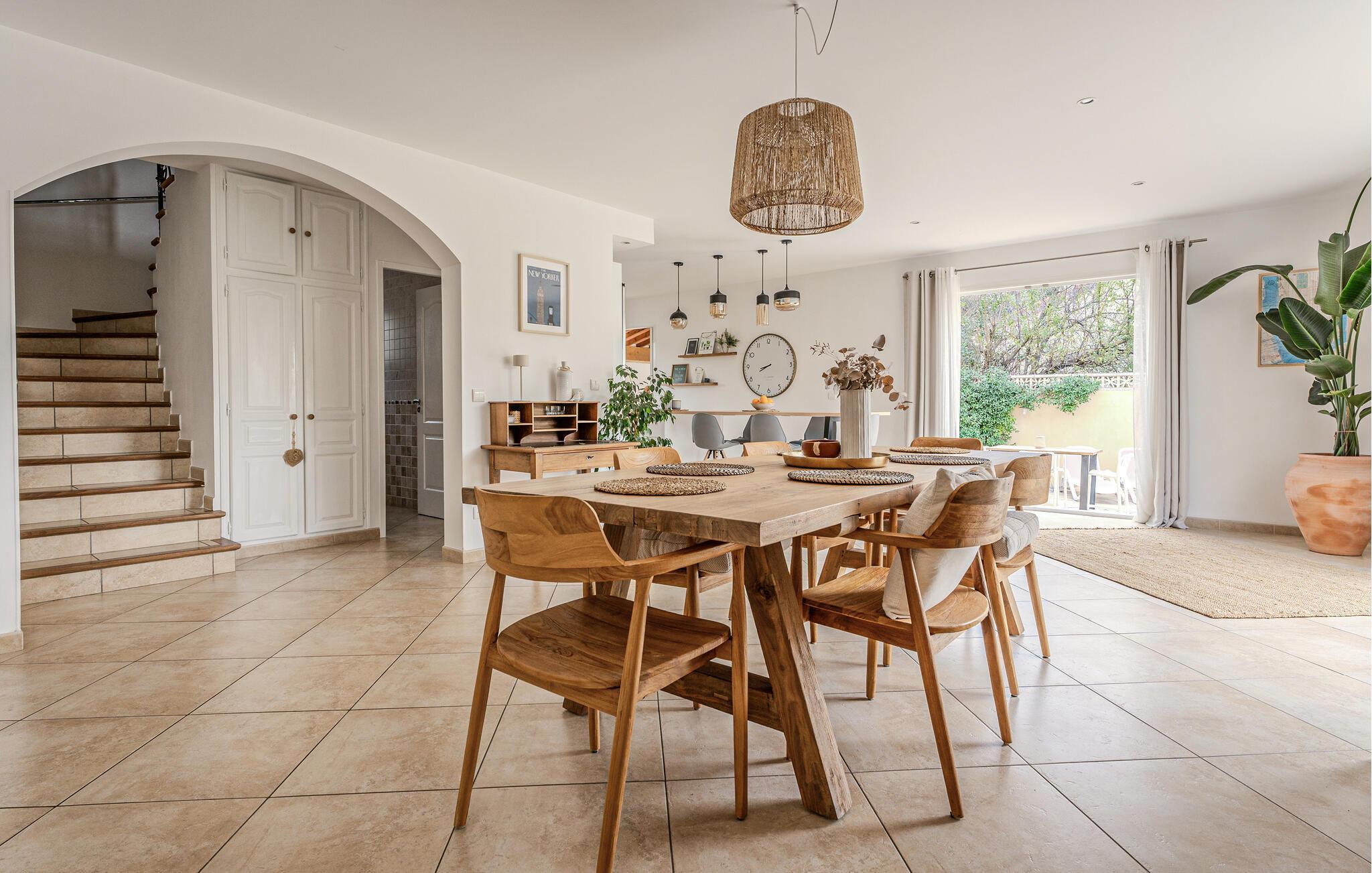 Dette rummelige og lyse feriehus i to etager skaber den perfekte ramme for en behagelig ferie. Den åbne stue med moderne køkken og spiseområde inviterer til hyggelige stunder sammen. Start morgenen i de komfortable soveværelser, og træd ud i haven med en kop kaffe i hånden. Tilbring afslappende dage ved poolen, eller nyd skyggen på den overdækkede terrasse – ideel til fælles grillaftener og lune sommernætter.