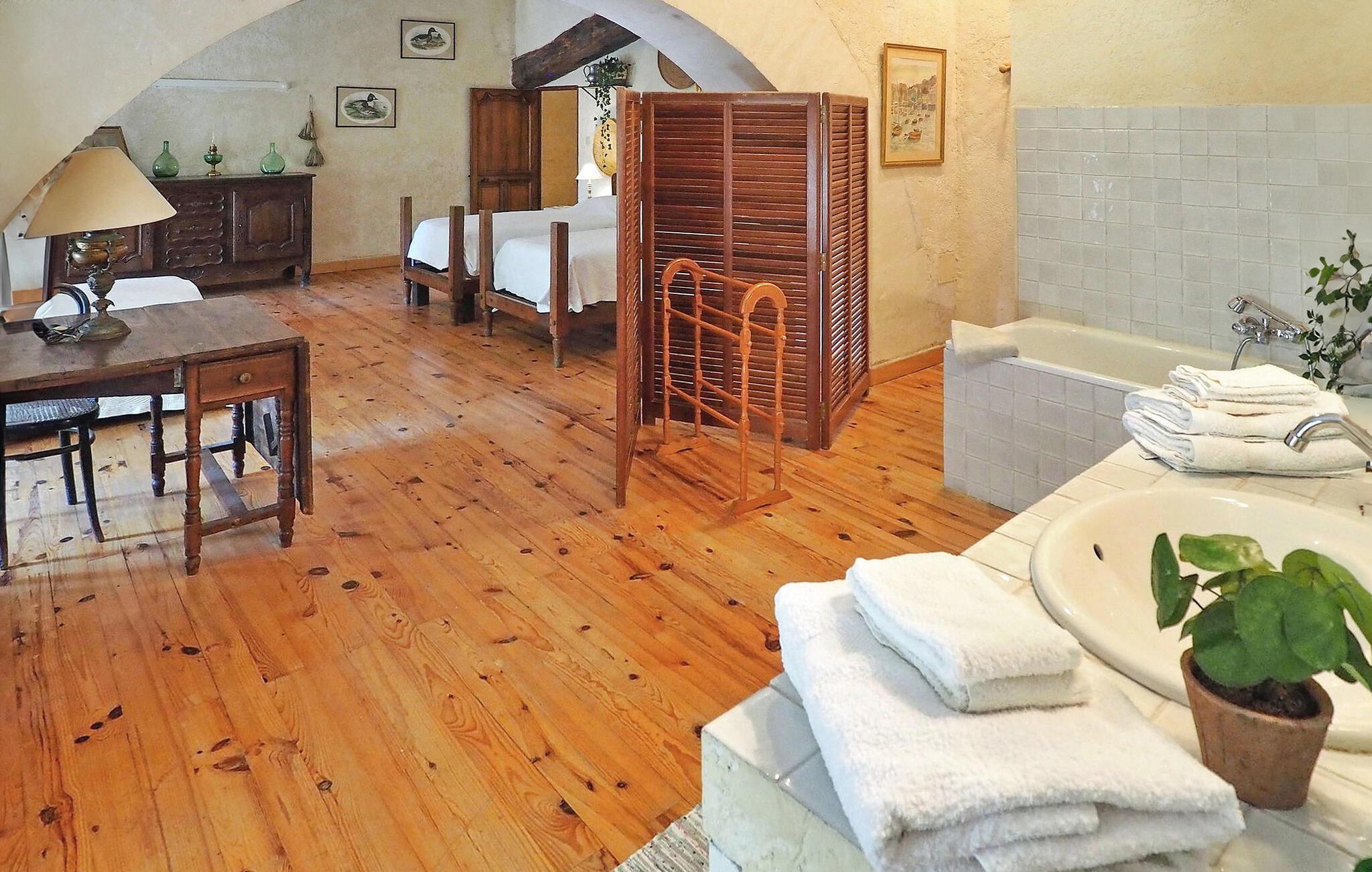Beliggende i den fredfyldte Baux de Provence-dal tilbyder denne autentiske oliemølle en charmerende feriebolig. Beliggende i en olivenproducerende ejendom, er der en fælles udendørs pool. Stueetagen består af et køkken med en spiseplads for familien og en indendørs grill i en pejs, forsynet med træ, et generøst soveværelse med et privat brusebad, og derudover er der en indbydende stue med komfortable siddepladser, et billardbord og et klaver. Ovenpå fører en rummelig repos til endnu et soveværelse. To sammenhængende soveværelser deler badeværelse og er ideelle til små børn eller unge. Udendørs funktioner omfatter en privat gårdhave med et dejligt springvand til at nyde morgenmaden. Stien ved siden af er eksklusiv for ejendommens beboere. Adgang til en fælles swimmingpool med sikkerhedsalarmer, liggestole og pooladgang gennem ejerens stuehus er tilgængelig. Nøglepunkter at bemærke: Udlejningen opererer inden for en aktiv olivenolievirksomhed, der beskæftiger sig med fremstilling af højkvalitets AOC-olie. Oliventræsfældning i marts og høst i november og december er en del af rutinen. Tæt opsyn tilrådes for små børn omkring gårdens springvand.