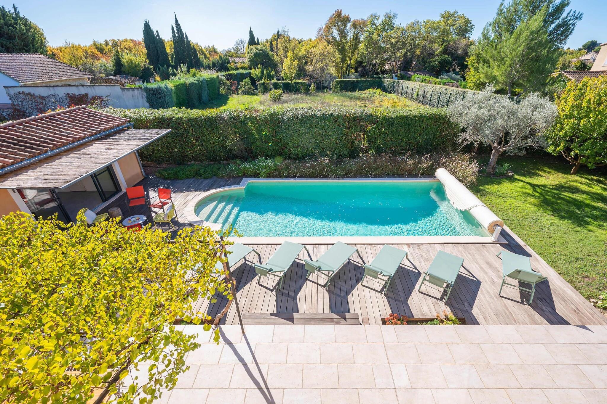 Beliggende i et fredeligt hjørne af Maussane-les-Alpilles er denne charmerende lejlighed en vidunderlig base for en afslappet provencalsk flugt, ideel til op til seks gæster. Perfekt til familier eller venner, tilbyder den komforten og privatlivet i et veldesignet hjem, samtidig med at du holder dig tæt på landsbylivet, lokale markeder og de smukke vandrestier i Alpilles. Det er et sted, hvor dagene udfolder sig blidt, formet af solskin, frisk luft og rytmen i Sydfrankrig. Indvendigt føles lejligheden varm, rummelig og gennemtænkt indrettet. Opholdsstuen er designet til at slappe af sammen med komfortable siddepladser og et smart-tv til afslappede aftener. Det fuldt udstyrede køkken flyder naturligt ind i spisestuen, hvilket gør fælles måltider nemme og behagelige. En indbydende entré og gæstetoilet bidrager til lejlighedens daglige komfort. Ovenpå er der tre indbydende soveværelser, der hver har et privat brusebad og toilet, hvilket giver alle deres egen plads og privatliv. Alle senge er dobbeltsenge, og fuld aircondition overalt sikrer et behageligt ophold i enhver sæson. Udenfor kan du nyde adgang til en smuk swimmingpool, perfekt til at køle af på varme eftermiddage eller starte dagen med en forfriskende dukkert. De omkringliggende udendørsområder inviterer dig til at slappe af, læse eller nyde måltider i det fri. Denne lejlighed ligger kun få minutter fra hjertet af Maussane-les-Alpilles og inden for rækkevidde af højdepunkter som Les Baux-de-Provence, Fontvieille, Paradou og Arles. Den er ideel for gæster, der ønsker at opleve Provences autenticitet, mens de hver dag vender tilbage til et roligt og behageligt tilflugtssted.