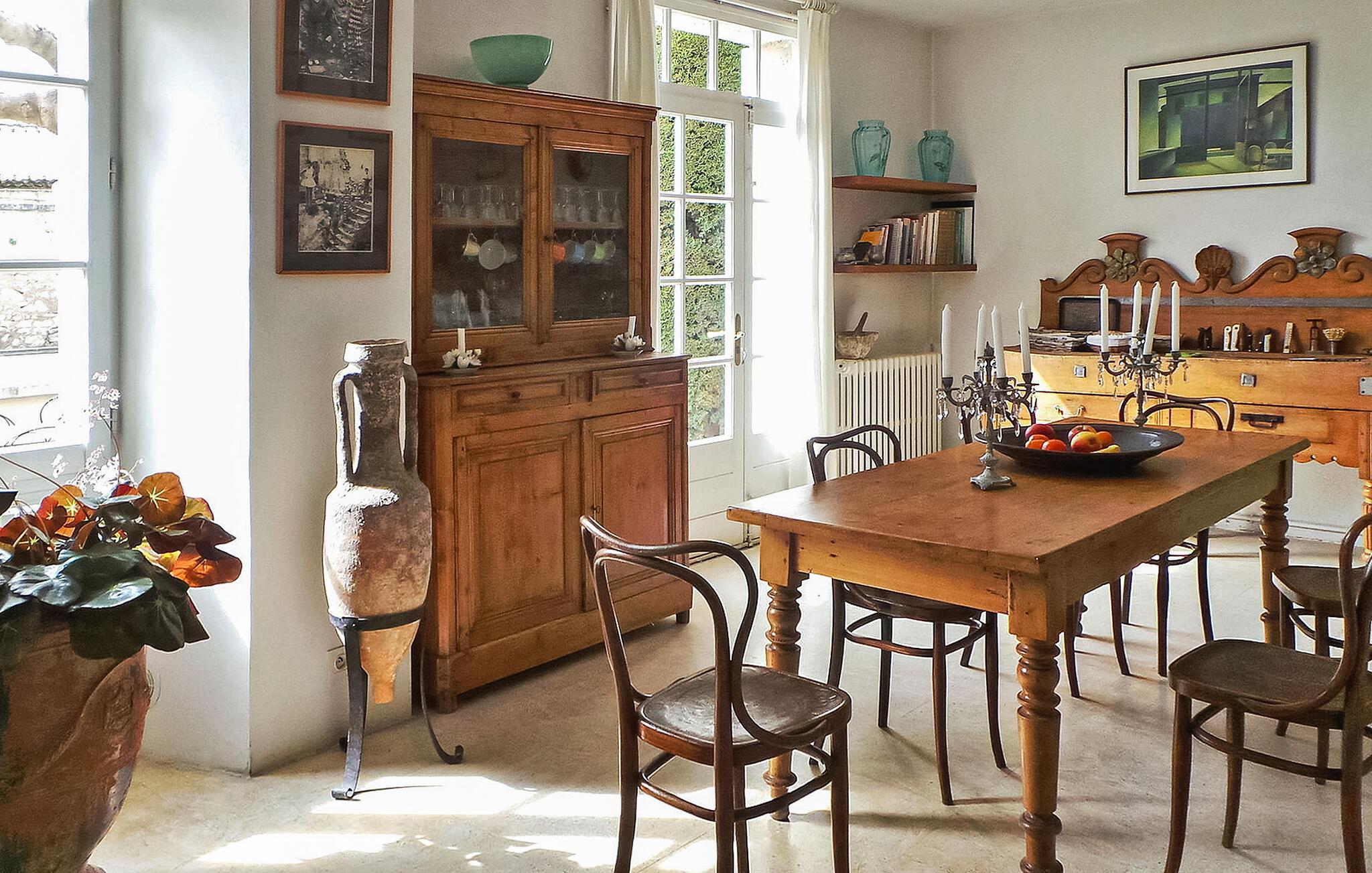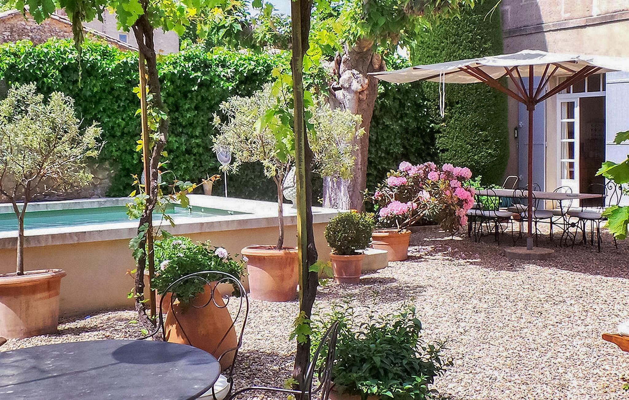 Oplev denne rummelige ferielejlighed i hjertet af Maussane, en charmerende landsby i Alpilles. Nyd bekvemmeligheden ved at være i gåafstand fra alle butikker og restauranter, samt luksusen ved en gårdhave med privat pool. Denne bolig har en velindrettet planløsning. I stueetagen fører en indgang til et fuldt udstyret køkken og spiseplads, som giver adgang til den sydvendte gårdhave. Der er desuden to hyggelige stuer i stueetagen. Alle værelser har aircondition og ligger på første sal. Udenfor finder du en lukket gårdhave med havemøbler. Den private pool, der måler 5 x 4 m, byder på et afslappende tilflugtssted. Der er to parkeringspladser foran huset og en parkeringsplads i garagen. Huset ligger i hjertet af den charmerende landsby Maussane les Alpilles, butikker og restauranter i gåafstand. Nyd terrasserne i landsbyens centrum under de gigantiske platantræer, det provencalske marked hver torsdag morgen og kunstudstillingen hver fredag. Smag på lokale specialiteter i de forskellige restauranter i Maussane: tapenade, oliven, AOC olivenolie fra Vallée des Baux (to møller er stadig i drift), honning, marmelade, lam fra Alpilles, gedeost, vin. Det er vigtigt at bemærke, at ejendommen er beliggende på hovedvejen, der krydser landsbyen Maussane, og at aircondition kun er tilgængelig i soveværelserne.