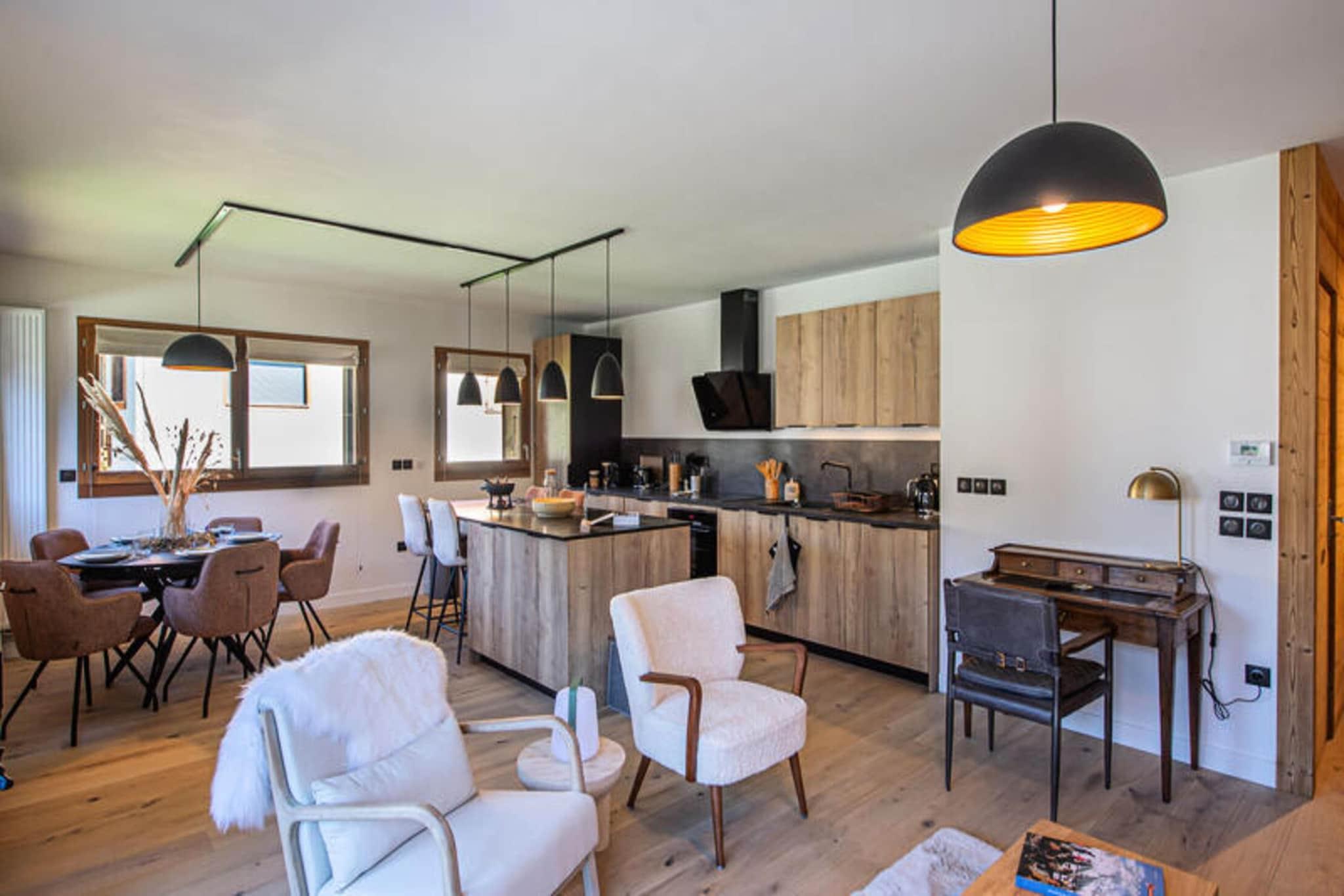 Denne smarte lejlighed i alpestil ligger i det fredelige Prariand-område i Megève, og tilbyder et fredfyldt tilflugtssted kun få minutters gang fra byens centrum. Lejligheden ligger i Silver Lodge-residensen og har en fantastisk udsigt over de sneklædte bjerge. Den rummelige opholdsstue har et hyggeligt tv-hjørne og åbner ud til en balkon. Lejligheden kan komfortabelt rumme 6 voksne, med tre soveværelser med dobbeltsenge, hvoraf det ene har en-suite brusebad. Det inkluderer også et separat badeværelse, to toiletter og et fuldt udstyret køkken, der åbner ind i opholdsområdet. Lejlighedens planløsning omfatter entré med opbevaring, tre soveværelser med dobbeltsenge (160x190), samt opholdsstue med moderne åbent køkken. Yderligere faciliteter omfatter en elektrisk pejs, skiskab og en overdækket parkeringsplads i garagen. Gæsterne kan nyde bekvemmeligheden ved regelmæssig rengøring (to gange om ugen) og en indbydende stemning ved ankomsten, med redte senge og husholdningslinned. Boligen er ikke-ryger, og kæledyr er ikke tilladt. Inkluderede tjenester dækker personlig velkomst fra bureauer, badeværelsesprodukter og slutrengøring.