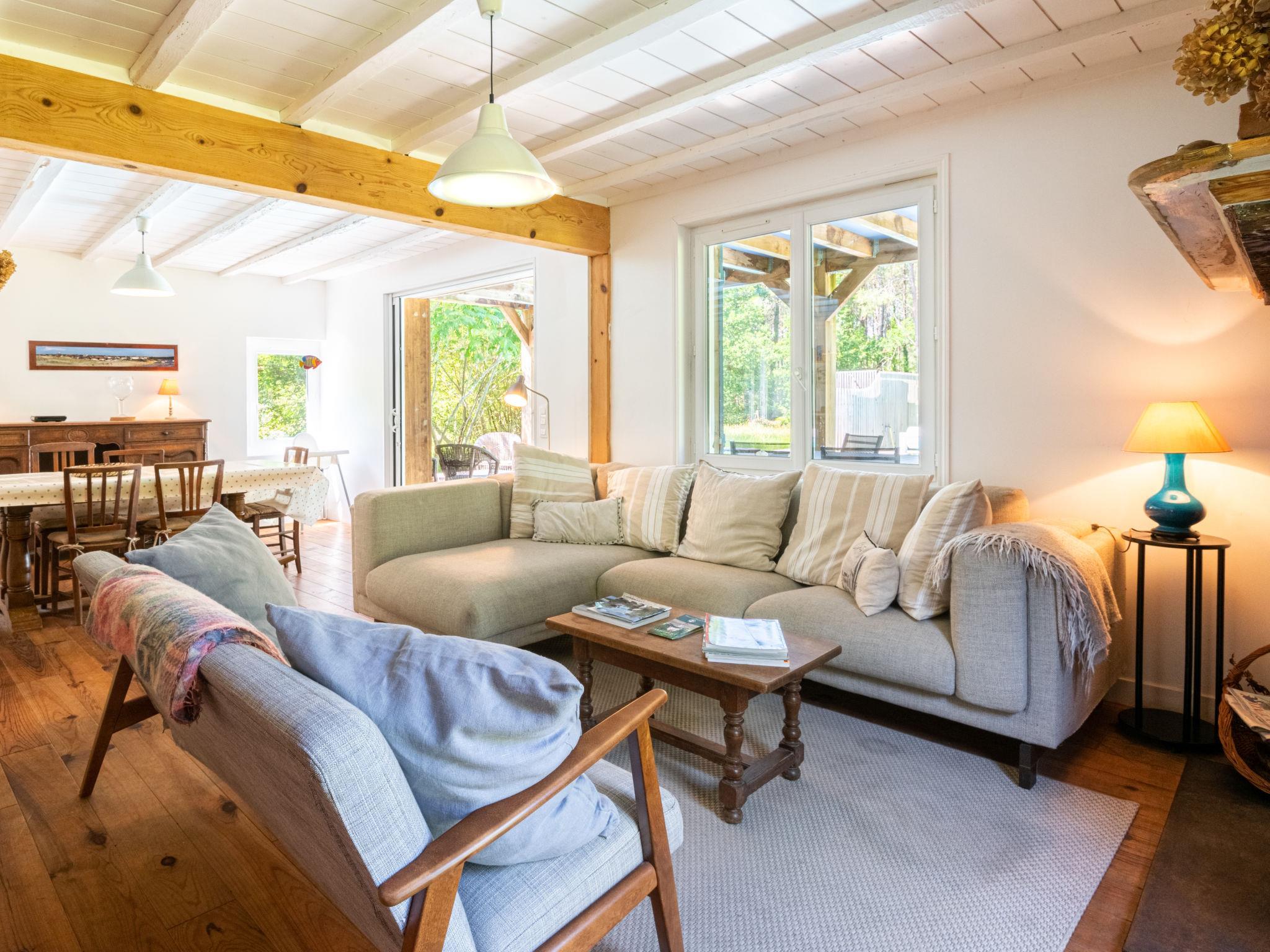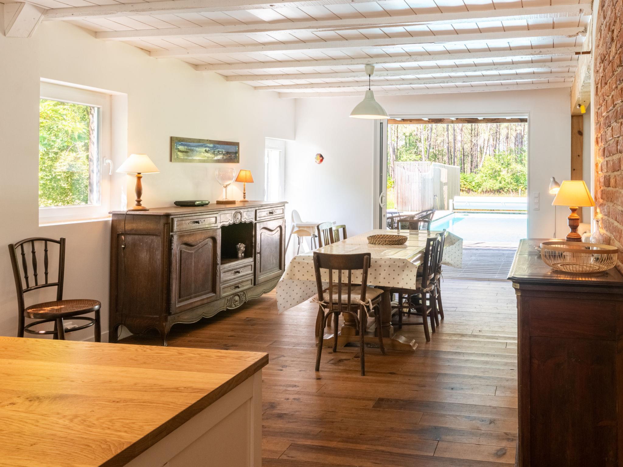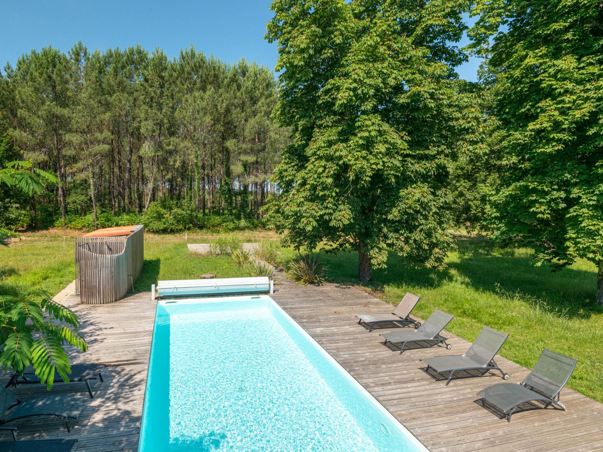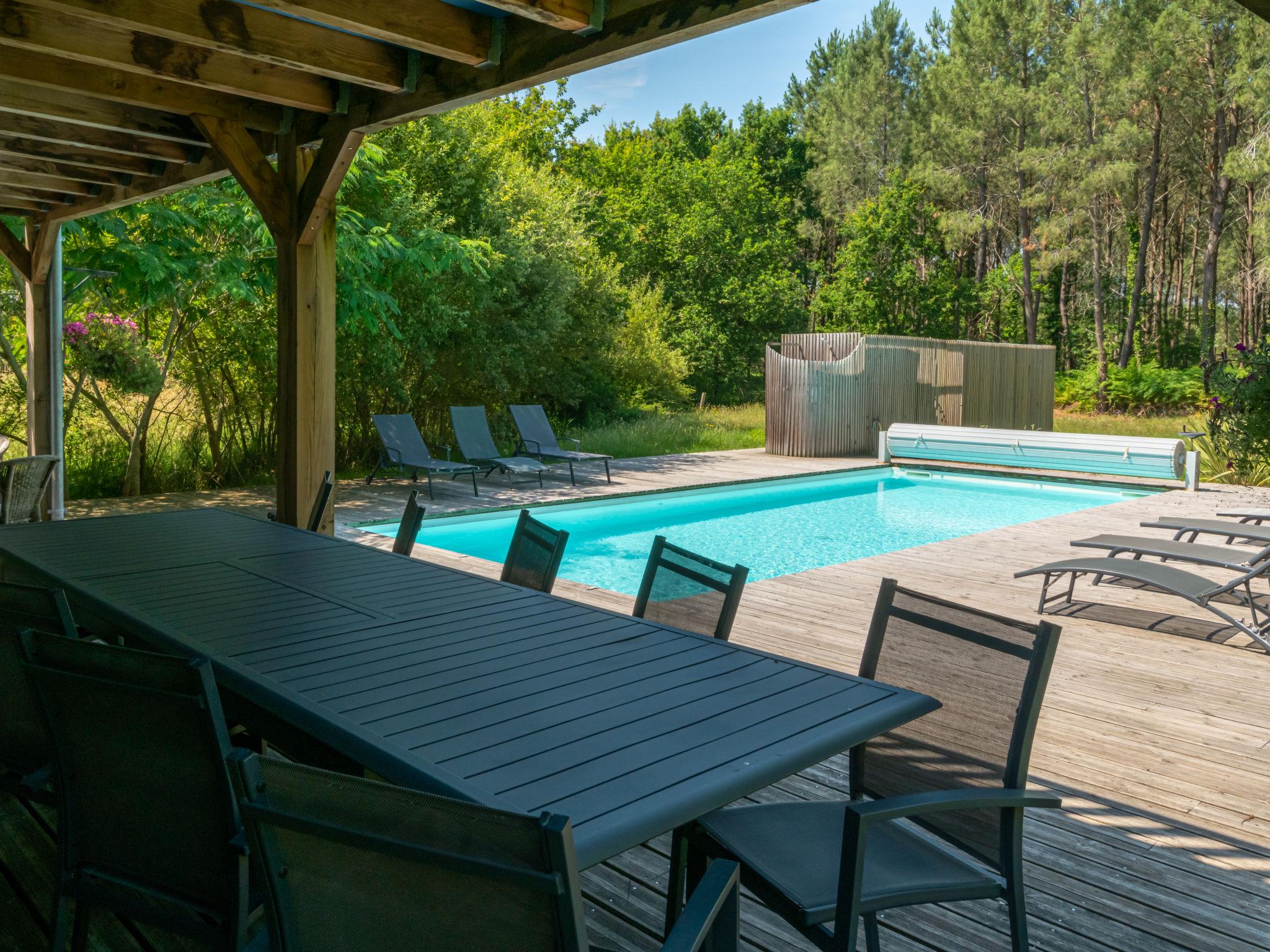 Beautiful single-family house "La Grange du Belon". Property composed of main house and outbuilding, in the hamlet Le Belon 2.5 km from the centre of Mézos, 5.5 km from the centre of Saint Julien en Born, 10 km from the centre of Contis Plage, in a quiet position, 10 km from the sea. Private: natural state property 800 m2 with trees, swimming pool heated (10 x 4 m, depth 150 cm, seasonal availability: 01.May. - 30.Sep.) with internal staircase and shutter cover. Outdoor shower, pool maintenance by the owner/gardener. Parking (for 3 cars) at the house on the premises. Shop 2.5 km, supermarket 5 km, bus stop "Gare de Saint Julien en Born" 4 km, sandy beach "Contis Plage" 10 km. The owner does not accept any youth groups.