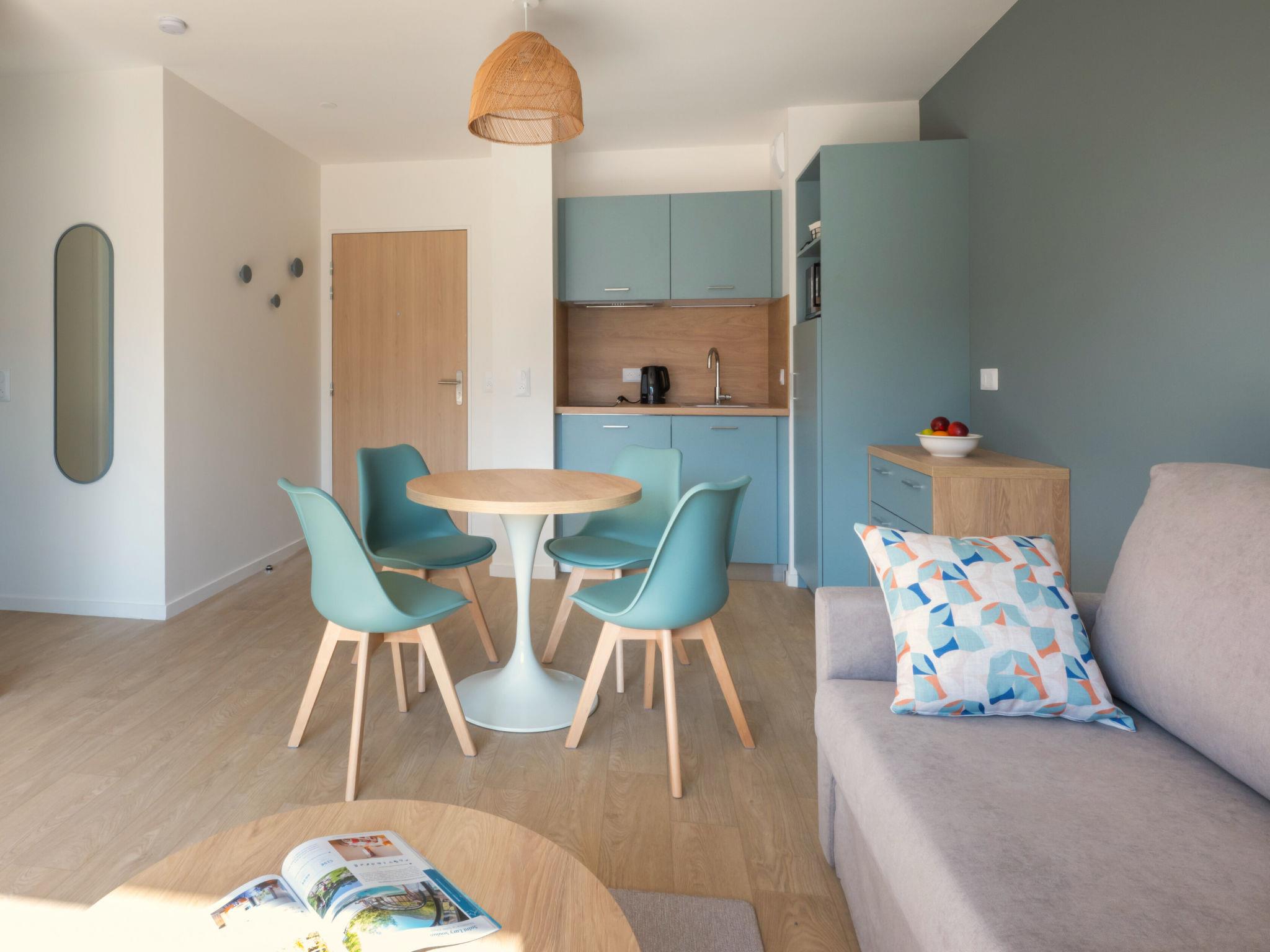 Residence "Bleu Canopée", 3 storeys, built in 2025. 100 apartments in the residence. 5 km from the centre of Mimizan, in the residential district, 650 m from the sea, 650 m from the beach. For shared use: property with lawn, swimming pool fenced (98 m2, depth 80 - 140 cm, seasonal availability: 01.May. - 30.Sep.) with internal staircase. Children's pool. In the complex: reception, WiFi, sauna (extra). Fitness room, washing machine, tumble dryer (for shared use, extra). Parking. Supermarket 1.4 km, restaurant 1 km, bus stop "Office de tourisme Mimizan" 1.3 km, railway station "Labouheyre" 30 km, sandy beach 650 m, park "Landes aventures" 6 km, bathing lake "Aureilhan" 10 km. Golf course (9 hole) 7 km. Nearby attractions: Bassin Arcachon 70 km, Biscarrosse 35 km, Casino Mimizan - Plage 1 km, Centre Nautique 6 km, Bordeaux 110 km. Please note: the photograph shows a typical example.