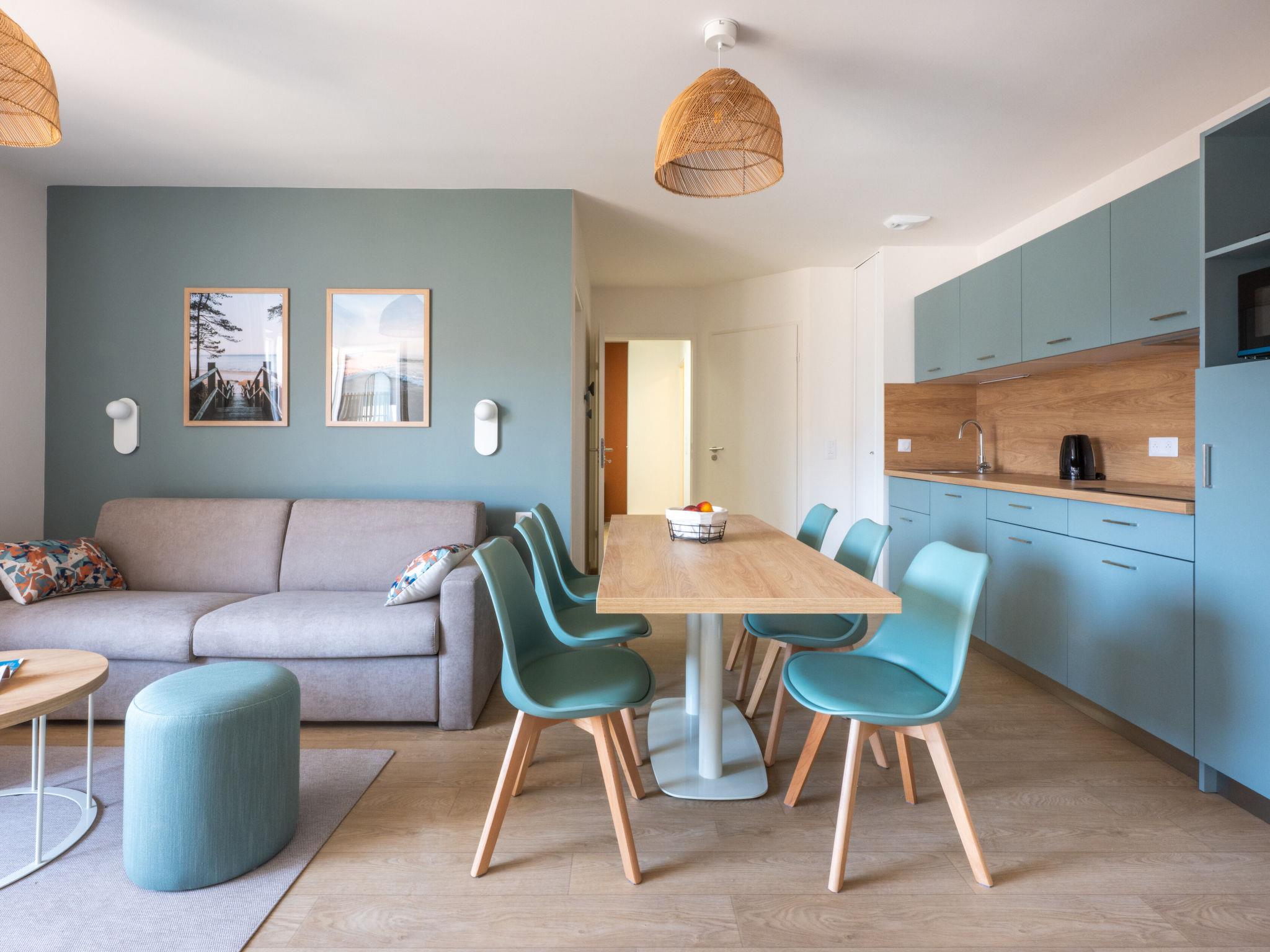 "Bleu Canopée", 3-room apartment 44 m2. Comfortable and beautiful furnishings: living/dining room with 1 sofabed (140 cm, length 90 cm), dining table and TV (flat screen). Exit to the balcony, to the terrace. 1 room with 1 french bed (160 cm, length 200 cm). 1 room with 2 beds (90 cm, length 190 cm). Kitchenette (dishwasher, 4 ceramic glass hob hotplates, toaster, kettle, electric coffee machine, combination microwave). Bath/shower, sep. WC. Electric heating. Small balcony or small terrace. Terrace furniture. Facilities: children's high chair, baby cot (extra), hair dryer. Internet (WiFi, free). Parking. Please note: maximum 2 pets/ dogs allowed. Smoke alarm. The property is one of a type of property or apartment.