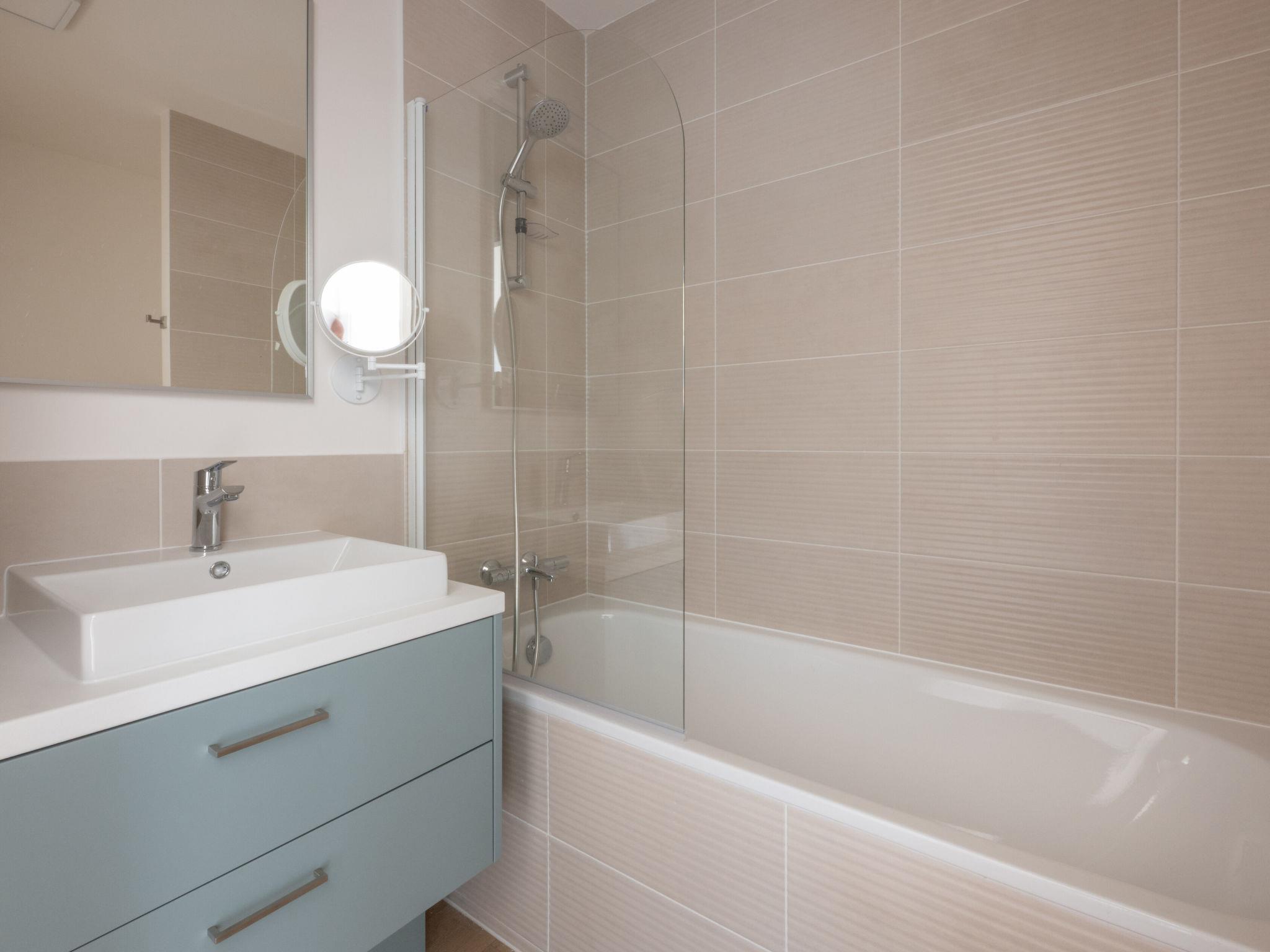 "Bleu Canopée", 3-room apartment 56 m2. Comfortable and beautiful furnishings: living/dining room with 1 pull-out bed (2 pers.), dining table and TV (flat screen). Exit to the balcony, to the terrace. 1 room with 1 french bed (160 cm, length 200 cm). Sleeping alcove with 1 x 2 bunk beds (80 cm, length 180 cm). 1 room with 2 beds (90 cm, length 190 cm). Kitchenette (dishwasher, 4 ceramic glass hob hotplates, toaster, kettle, electric coffee machine, combination microwave). Bath/shower, sep. WC. Electric heating. Small balcony or small terrace. Terrace furniture. Facilities: children's high chair, baby cot (extra), hair dryer. Internet (WiFi, free). Parking. Please note: maximum 2 pets/ dogs allowed. Smoke alarm. The property is one of a type of property or apartment.