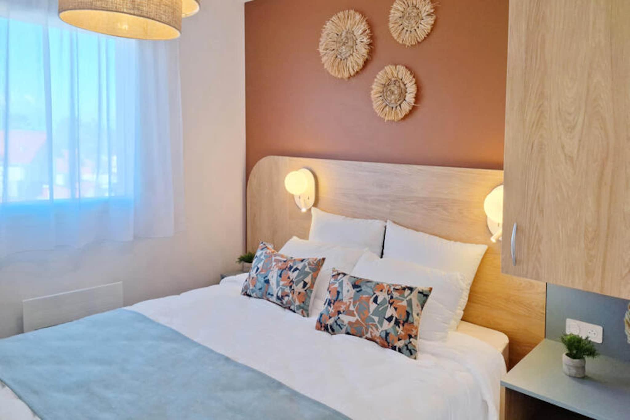 I hjertet af Landes-regionen, hvor fyrreskove møder Atlanterhavets gyldne sand, tilbyder Odalys Bleu Canopée Residence i Mimizan den perfekte blanding af afslapning og eventyr. Kun 650 meter fra stranden inviterer denne nybyggede residens dig til at fordybe dig i den naturlige skønhed og pulserende energi ved den franske kystlinje. Forestil dig at vågne op til lyden af ??havets bølger, nyde en afslappet morgenmad på din private balkon eller terrasse og planlægge en dag fyldt med aktiviteter ved havet. Residensen er designet med komfort og bekvemmelighed i tankerne og tilbyder moderne indkvartering, der henvender sig til både familier og grupper. Hver enhed har et fuldt udstyret tekøkken, en hyggelig opholdsstue med en sovesofa og rummelige soveværelser. Efter en dag med udforskning kan du slappe af ved den udendørs swimmingpool eller lade børnene plaske i soppebassinet. For dem, der søger lidt mere forkælelse, tilbyder stedets sauna en rolig tilflugtssted, mens fitnessentusiaster kan benytte sig af det veludstyrede fitnesscenter. Mimizans charme ligger i dens udvalg af aktiviteter. Fra surfing og stand-up paddleboarding til jetski er Atlanterhavskysten et paradis for vandsportsentusiaster. Ud over stranden kan du opleve regionens cykelstier, lokale markeder og sommerfestligheder, der bringer byen til live. Uanset om du slentrer gennem de fyrretræsduftende skove eller nyder den pulserende kystatmosfære, er hvert øjeblik her en invitation til at genoprette forbindelsen med naturen. Med sin førsteklasses beliggenhed, gennemtænkte faciliteter og adgang til det bedste af Landes er Odalys Bleu Canopée Residence mere end bare et sted at bo - det er en port til uforglemmelige minder. Book din ferie i dag, og oplev magien ved Mimizan.