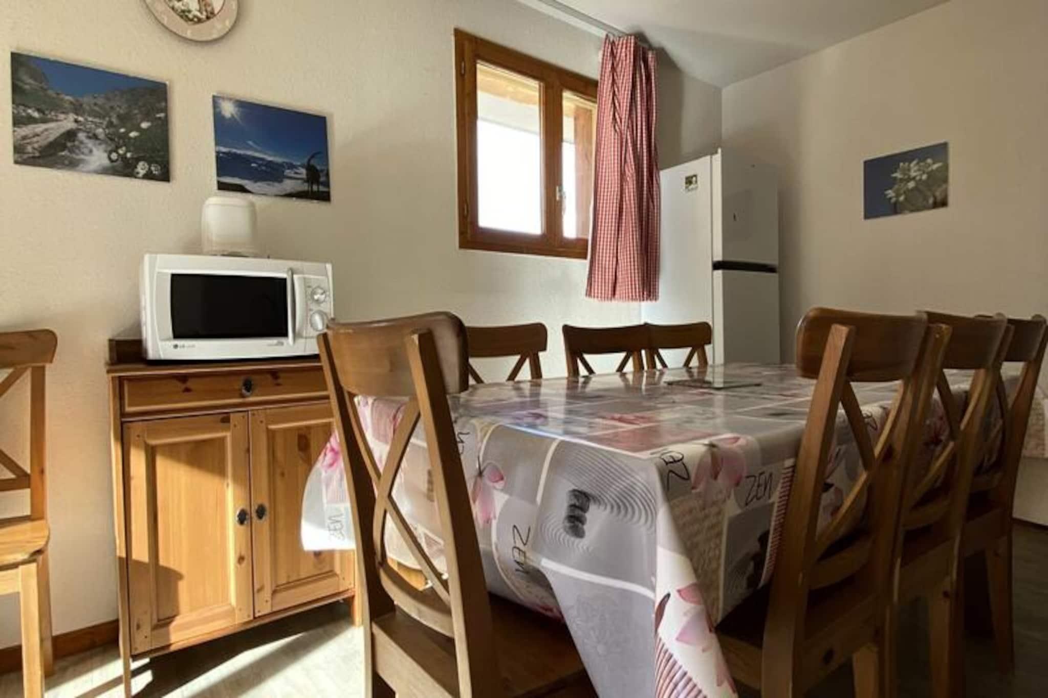 Højt over dalen, hvor de majestætiske tinder af Vanoise-massivet møder charmen ved alpint liv, tilbyder denne bolig et roligt tilflugtssted for både skientusiaster og naturelskere. Kun 100 meter fra Charmasson-pisten og dens stolelift og 500 meter fra hjertet af Valfréjus er du perfekt placeret til at udforske regionens uberørte skønhed og pulserende landsbyliv. Uanset om du er her for spændende nedkørsler eller fredfyldte bjergudsigter, lover denne destination uforglemmelige øjeblikke. \n\nDen fireværelses lejlighed har plads til op til otte gæster fordelt på 48 m² gennemtænkt design. Stuen har en hyggelig dobbelt sovesofa og et tv til afslappende aftener. Med et soveværelse udstyret med køjesenge, et andet med en dobbeltseng og et tredje med en udtræksseng til to, henvender sovepladserne sig til både familier og grupper. Tekøkkenet er fuldt udstyret med moderne apparater, herunder køleskab, ovn, opvaskemaskine, mikrobølgeovn og endda en vaskemaskine, hvilket sikrer bekvemmelighed under hele dit ophold. To badeværelser, et separat toilet og et brusebad giver rigelige faciliteter, mens den uafhængige balkon med syd- og vestvendt udsigt tilbyder en betagende udsigt over Vanoise-massivet. Et skirum på reposen bidrager til den praktiske anvendelighed af dette alpine paradis. \n\nTræd udenfor og fordyb dig i Valfréjus' pulserende atmosfære. Feriestedets centrum, kun en kort gåtur væk, kan prale af butikker, skiskoler og kabelbanens afgangssted, hvilket gør det nemt at få adgang til pisterne eller nyde afterskiing-aktiviteter. Om sommeren forvandles regionen til et paradis for vandrere og friluftsentusiaster med stier, der fører gennem frodige landskaber og panoramaudsigter. \n\nUanset om du søger eventyr eller afslapning, kombinerer denne bolig komfort, bekvemmelighed og en fantastisk natur for at skabe den perfekte alpine flugt. Lad skønheden i Vanoise-massivet inspirere din næste ferie.