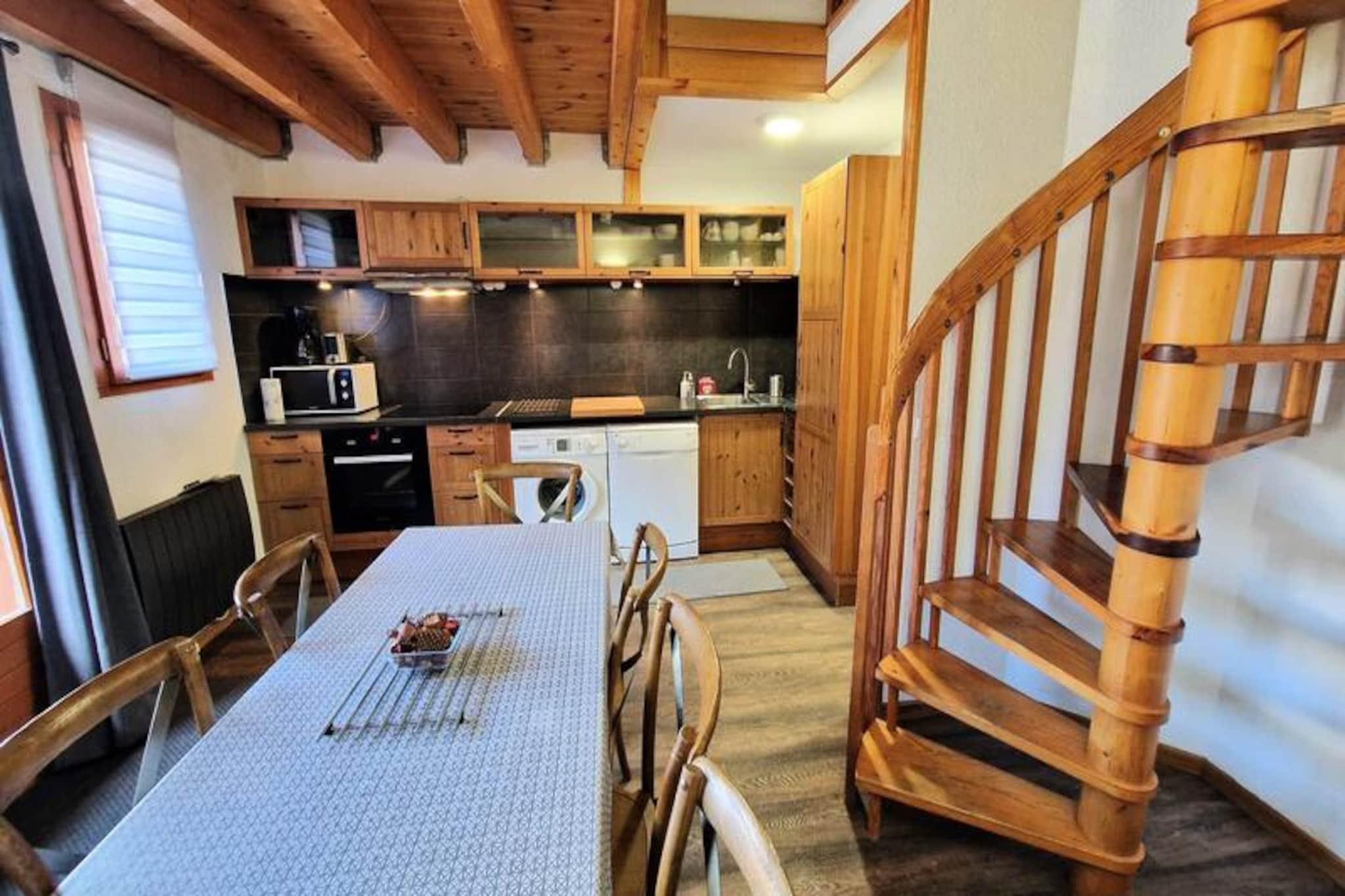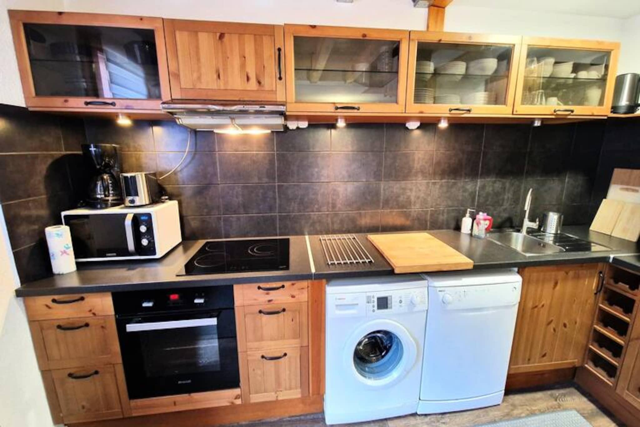 I hjertet af det travle feriested inviterer denne charmerende alpine lejlighed dig til at fordybe dig i den pulserende energi i Les Arcs 1800. Med pisterne og skilifterne kun få meter væk, vågner du op til løftet om spændende eventyr i Paradiski-området. Fra din østvendte balkon kan du nyde den fredfyldte udsigt over Place des Bergers og det majestætiske Vanoise-massiv, der sætter den perfekte tone for en dag i bjergene. Uanset om det er vinterskiløb eller sommervandreture, placerer denne bolig dig i centrum af det hele. \n\nLejligheden er cirka 50 m² stor og har komfortabel plads til op til otte gæster, hvilket gør den ideel til familier eller vennegrupper. Indretningen omfatter tre soveværelser, en mezzanin og en hyggelig hytte med køjesenge, der er perfekte til børn. Køkkenet er fuldt udstyret med moderne apparater, herunder ovn, mikrobølgeovn, opvaskemaskine og vaskemaskine, hvilket sikrer bekvemmelighed under hele dit ophold. Den vindeltrappe af træ tilføjer et rustikt præg, mens opholdsstuen med tv og gratis Wi-Fi tilbyder et hyggeligt tilflugtssted efter en dag med udforskning. Et skiskab i stueetagen gør din alpine ferie praktisk. \n\nTræd udenfor og find dig selv omgivet af feriestedets livlige atmosfære. Butikker, skiskoler og restauranter ligger alle inden for rækkevidde, mens kabelbanens afgangssted kun ligger 50 meter væk. Om sommeren forvandles regionen til et paradis for friluftsentusiaster med naturskønne stier, mountainbiking og en betagende udsigt over Tarentaise-dalen. \n\nUanset om du søger adrenalinpumpende dage eller rolige aftener, tilbyder denne bolig den perfekte blanding af komfort, bekvemmelighed og alpin charme. Skab uforglemmelige minder i hjertet af Les Arcs 1800, hvor hver årstid bringer sin egen magi.